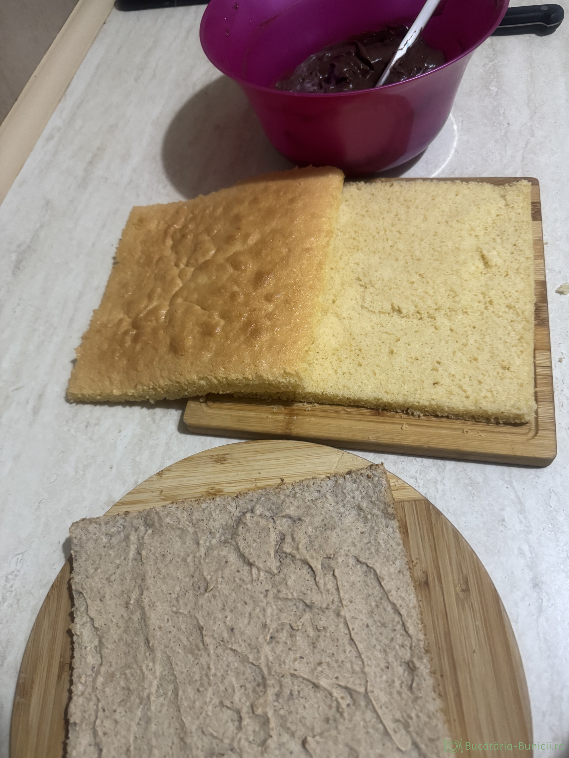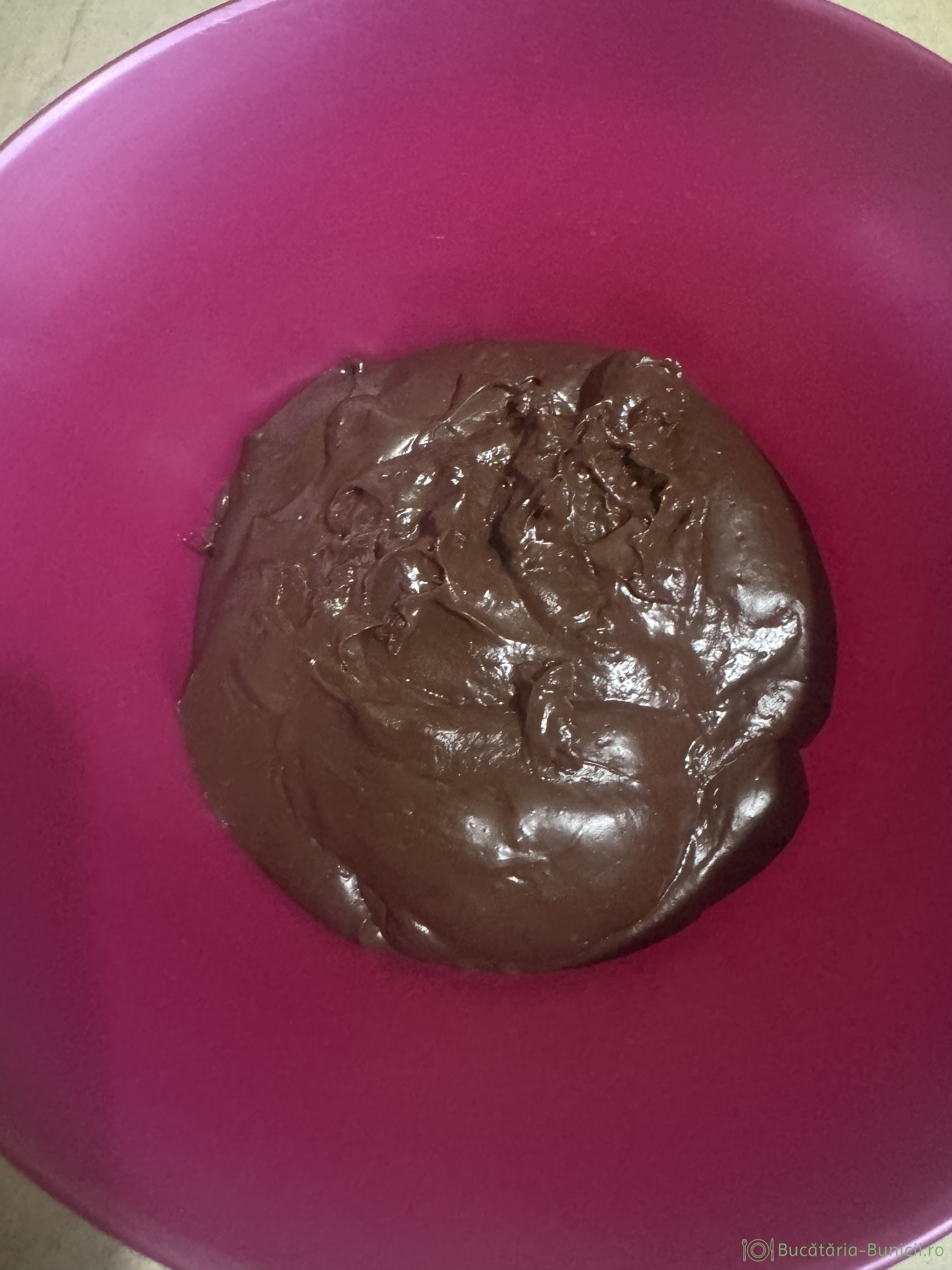 - Se amestecă energic, iar crema de ciocolată se toarnă în formă, peste blatul galben.