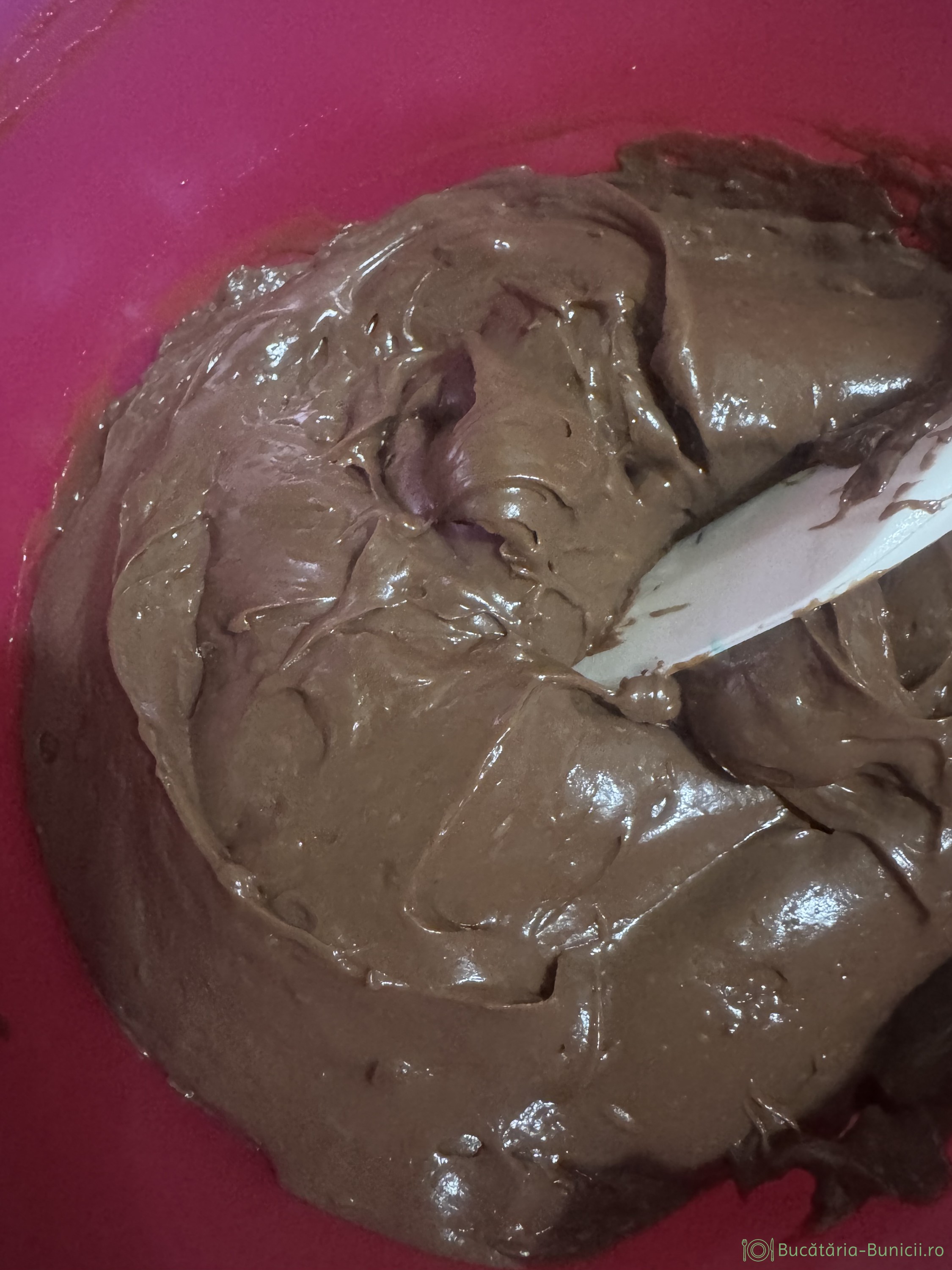- Se încorporează pe rând, folosind o spatulă, uleiul, esența și la final făina și praful de copt cernute împreună.