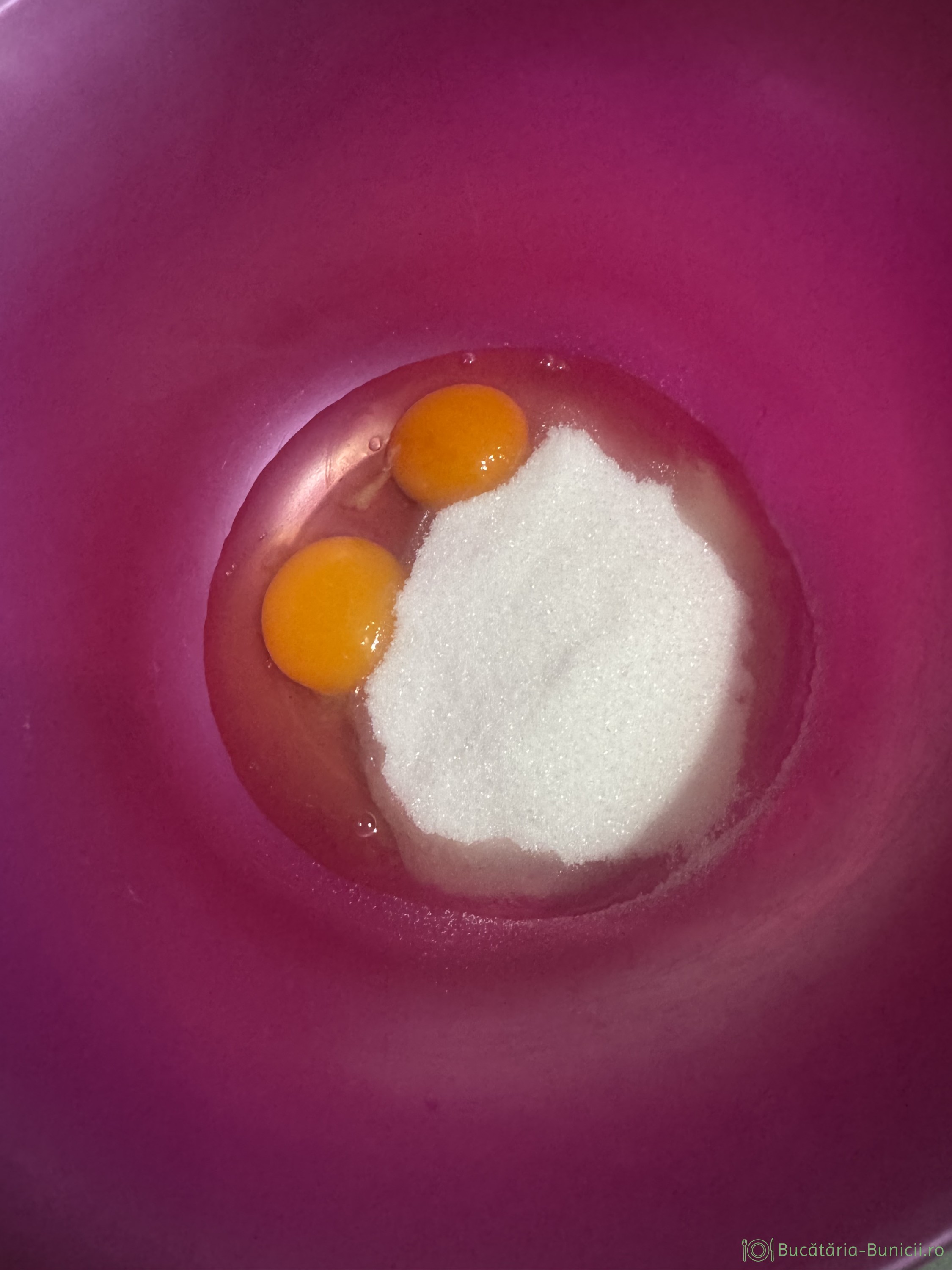 - Ouăle se bat cu telul, împreună cu sarea și zahărul.