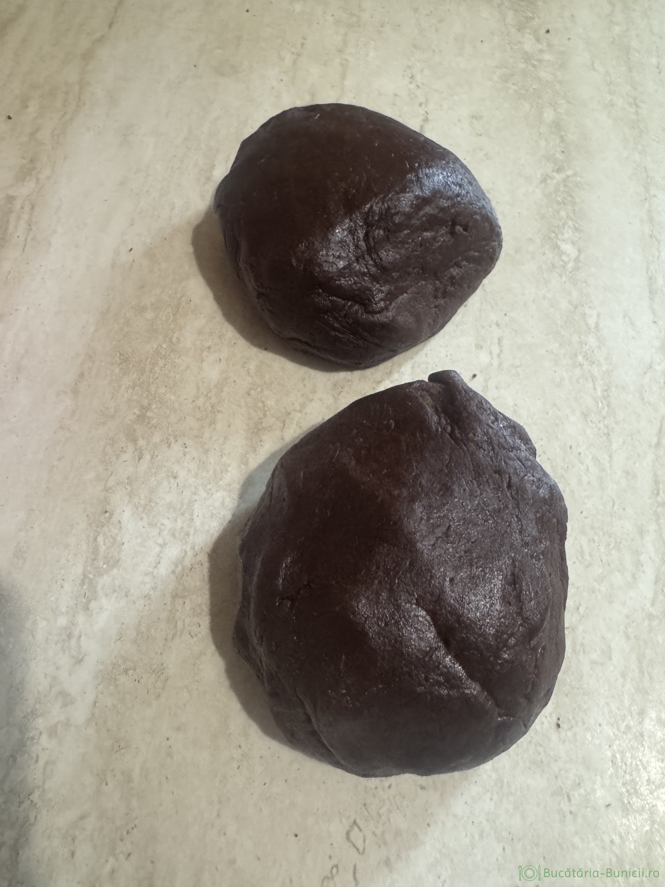 - Peste ouă se toarnă uleiul, se amestecă, apoi se adaugă amoniacul dizolvat în lapte, iar la final se încorporează treptat amestecul de făină și cacao, frământând un aluat neted și potrivit ca și consistență.