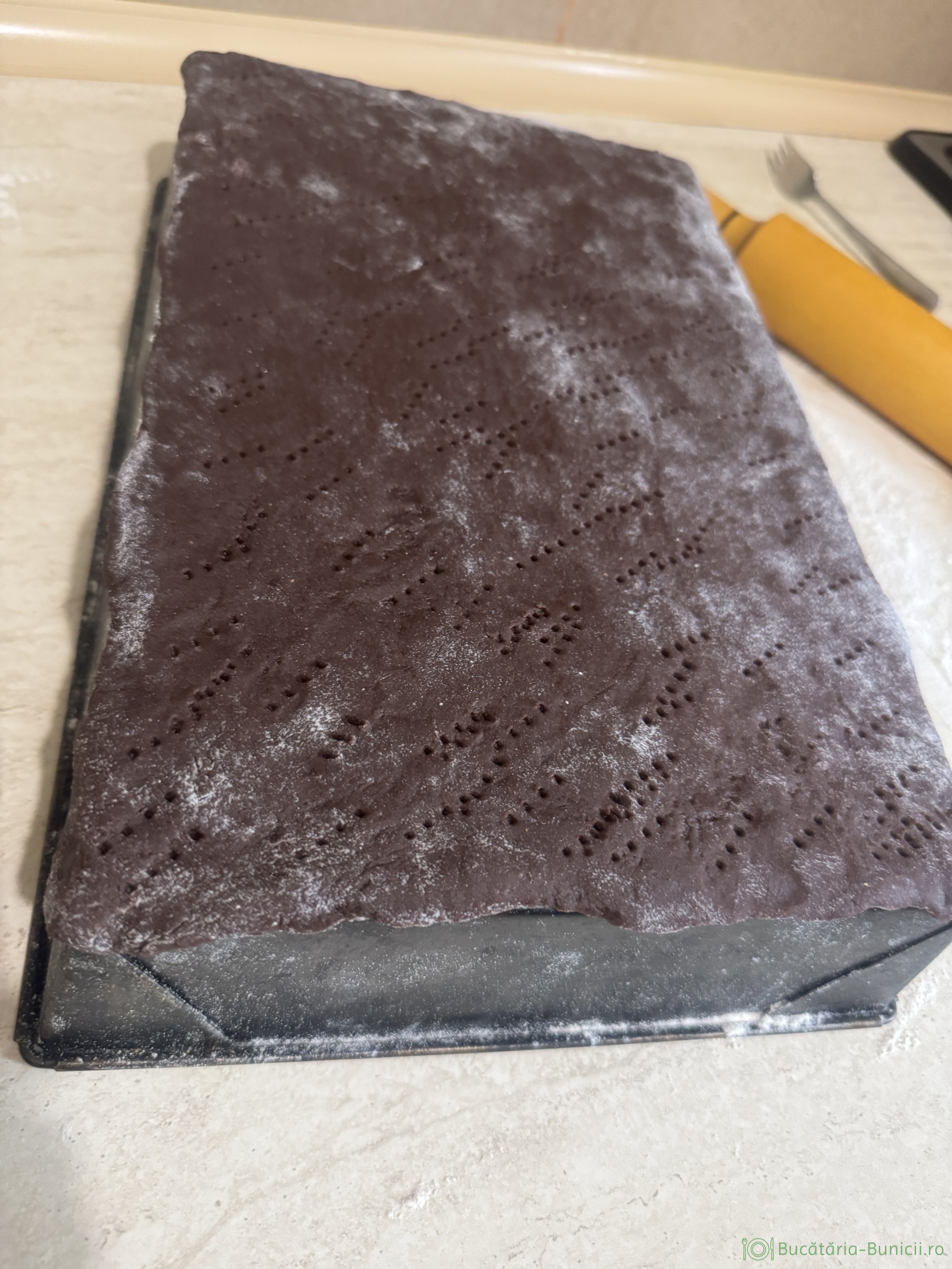 - Foaia întinsă se așază pe fundul tăvii, presărat cu făină, se înțeapă cu furculița pe toată suprafața și se coace timp de 12 minute, în cuptorul preîncălzit la 180 grade.