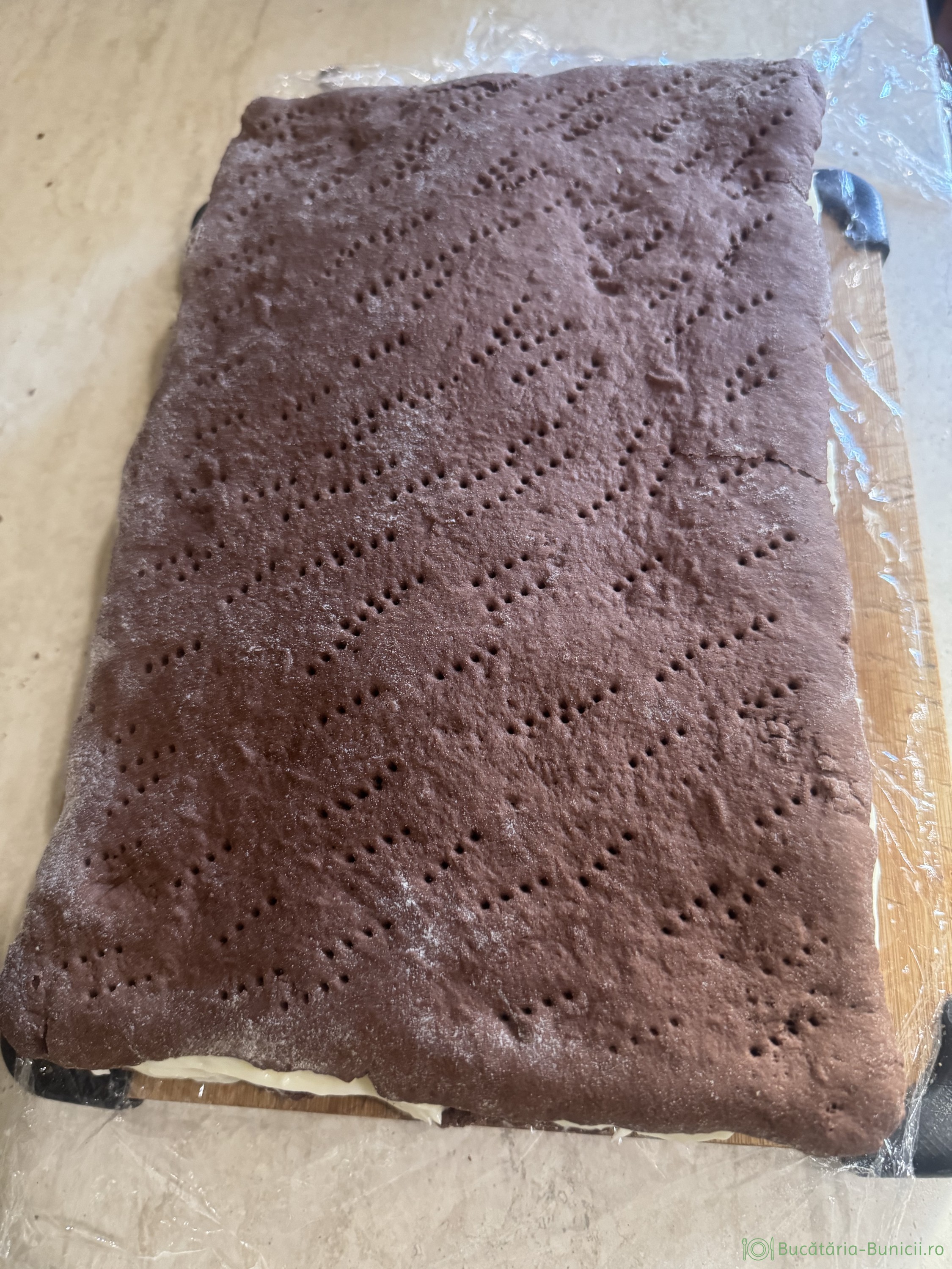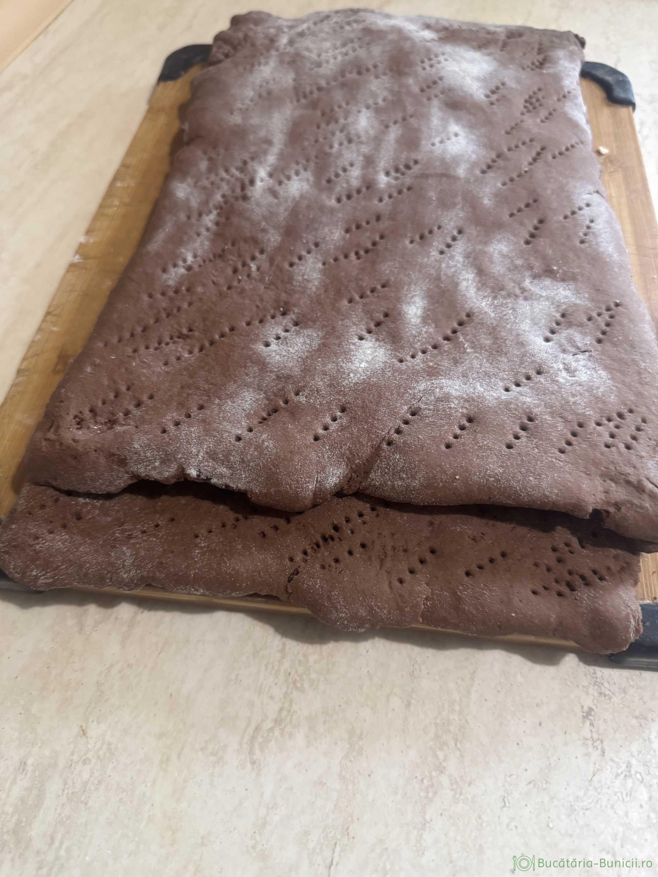 - Fiecare bucată se întinde cu sucitorul într-o foaie subțire, având dimensiunea tavii, adică 21/33 cm.