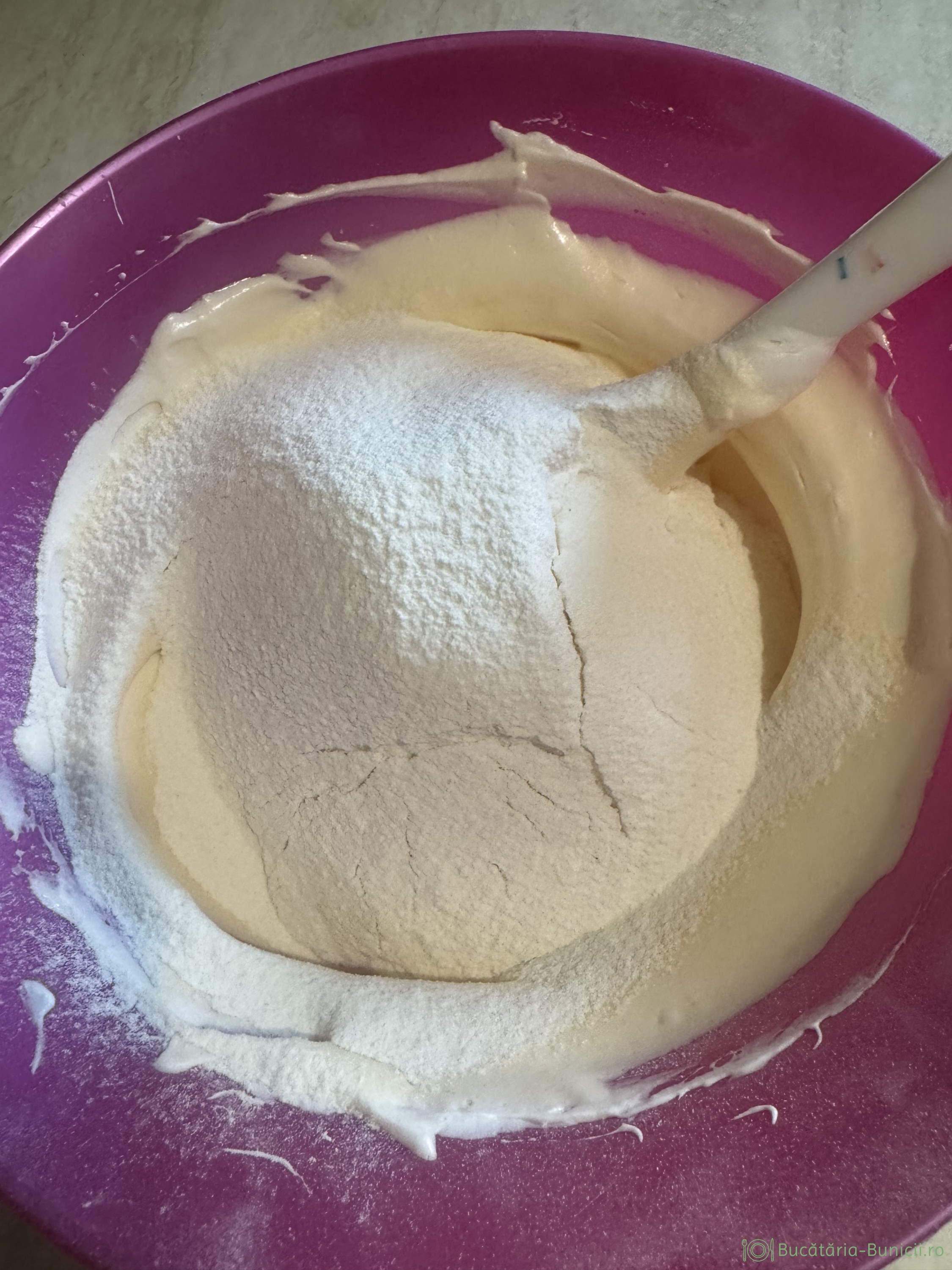 - Făina se cerne împreună cu praful de copt și se încorporează în compoziție, amestecând cu spatula cu mișcări largi de sus în jos.
