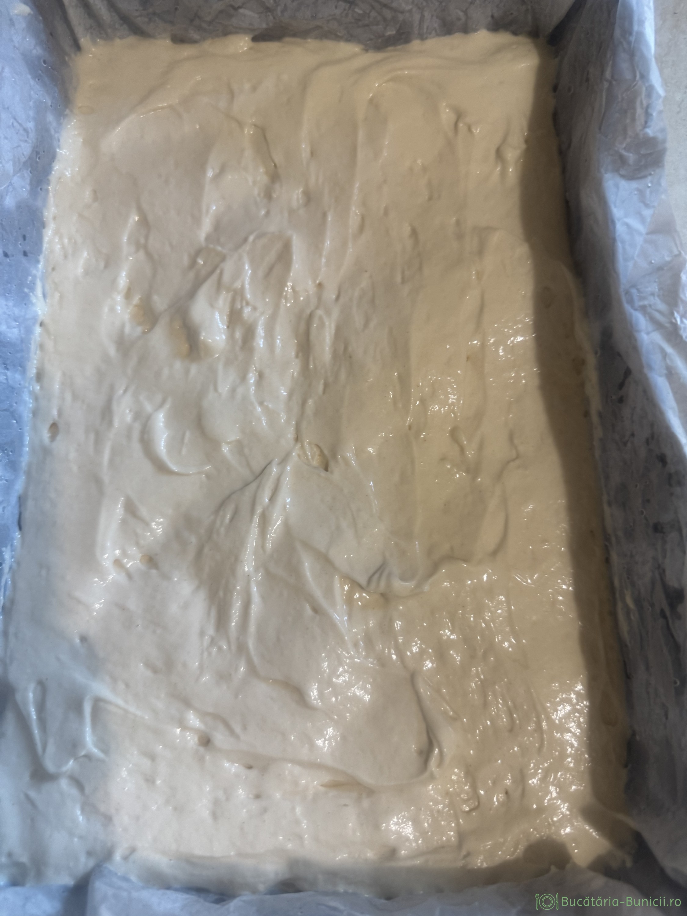 - Compoziția se toarnă în tava de 21/33 cm tapetată cu hârtie de copt umezită.