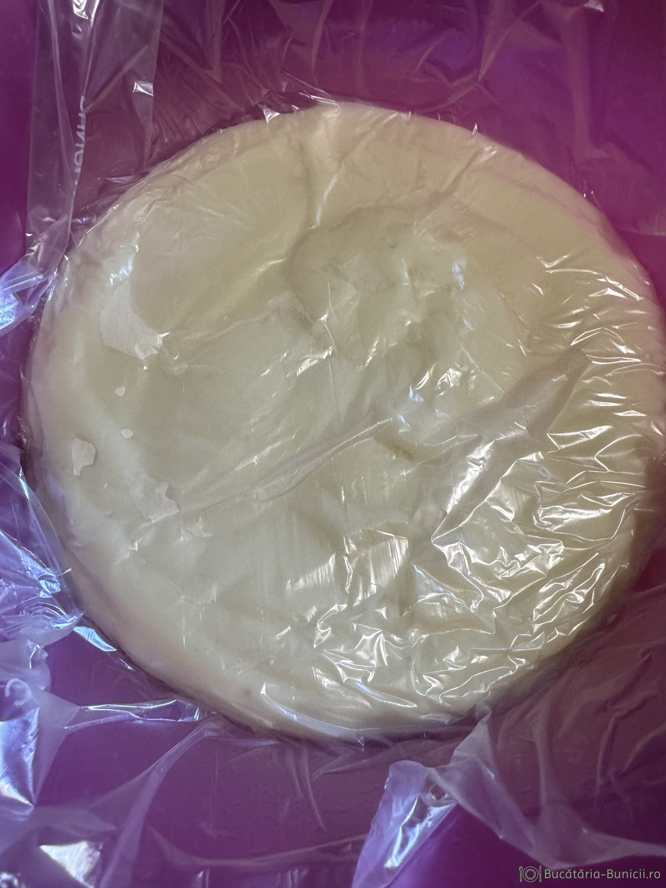 - Prăjitura se învelește cu folie alimentară, se pun câteva greutăți deasupra și se dă la rece 24 ore.