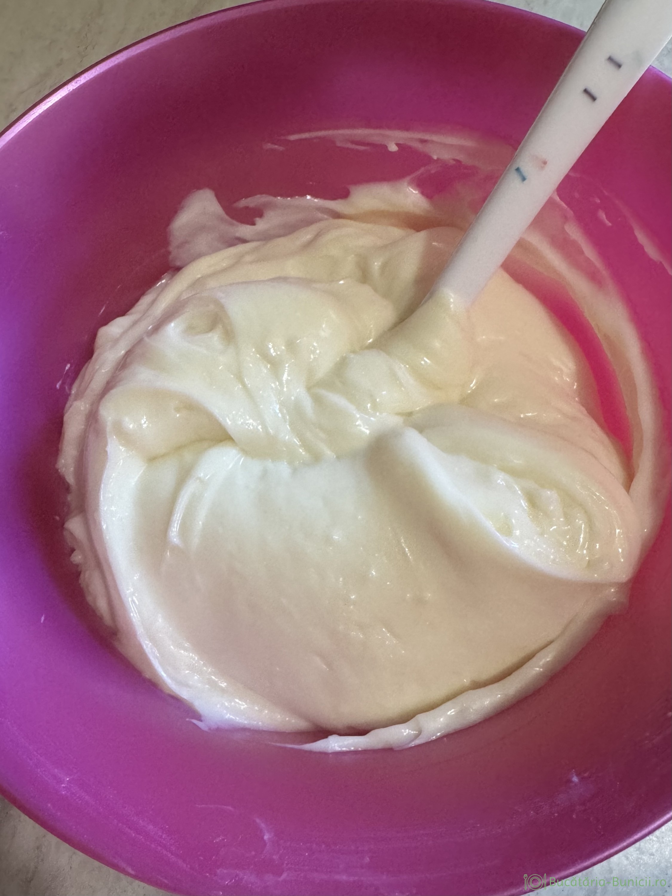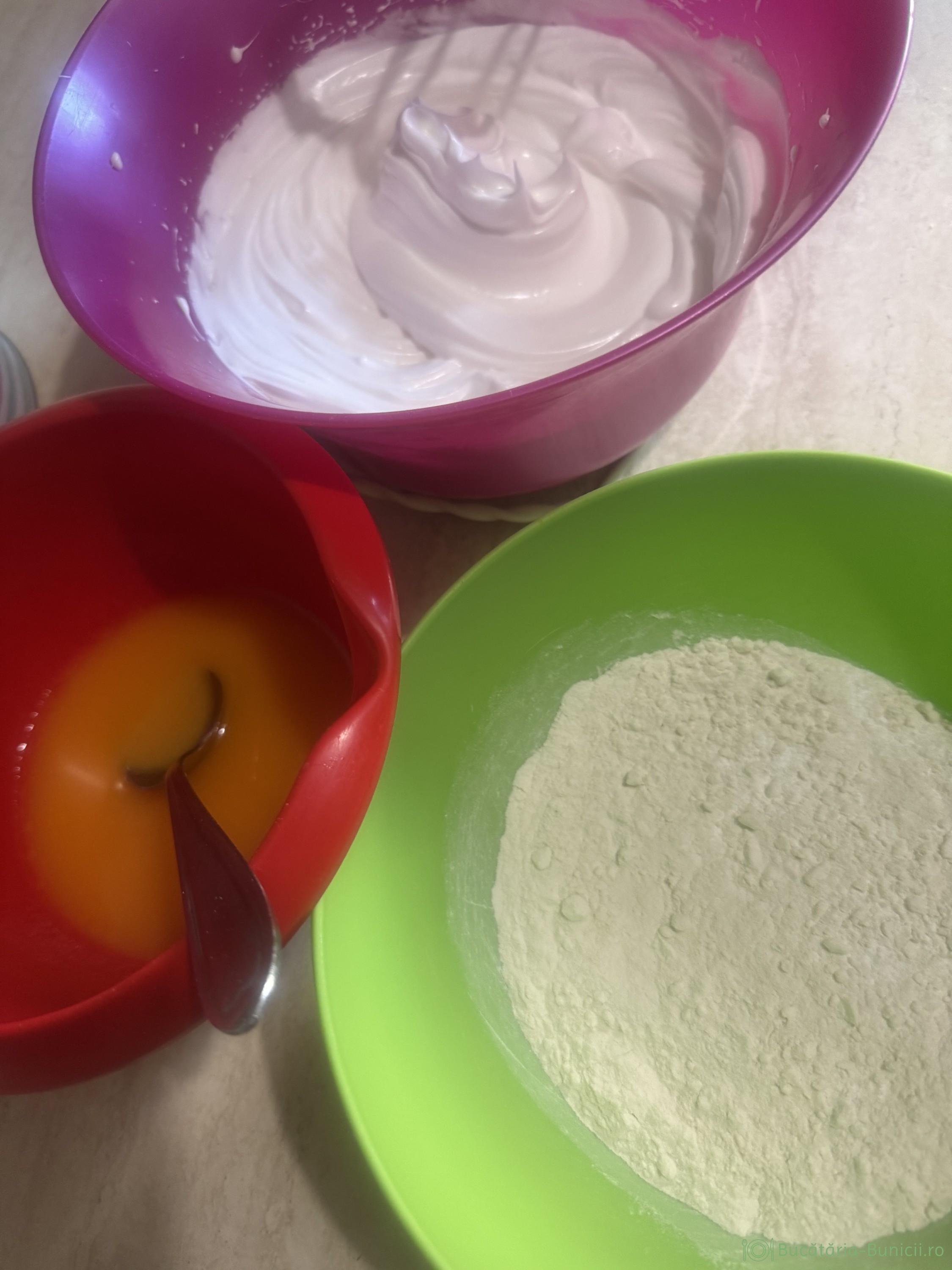 - În bezea se încorporează gălbenușurile treptat, amestecând ușor cu spatula.