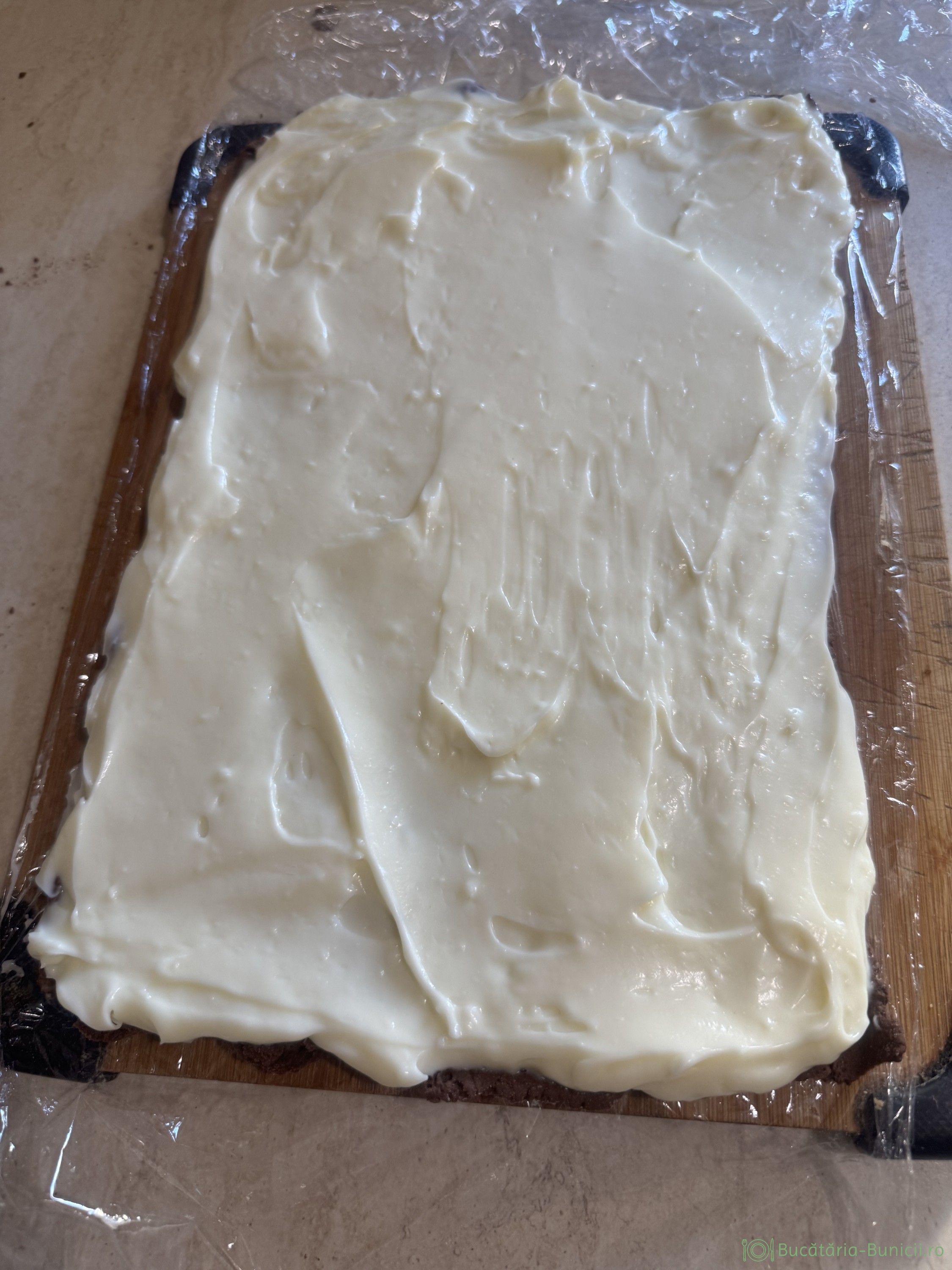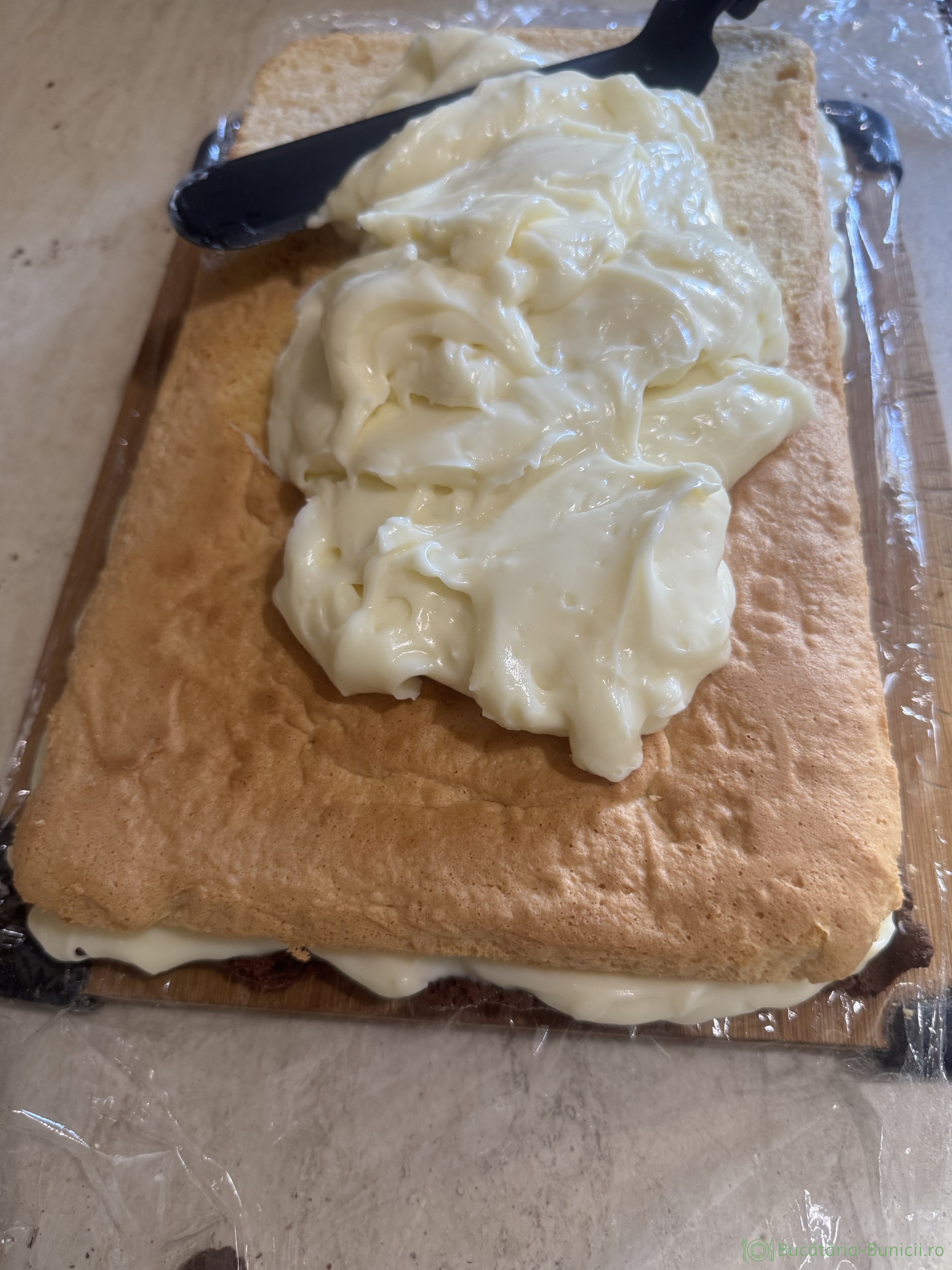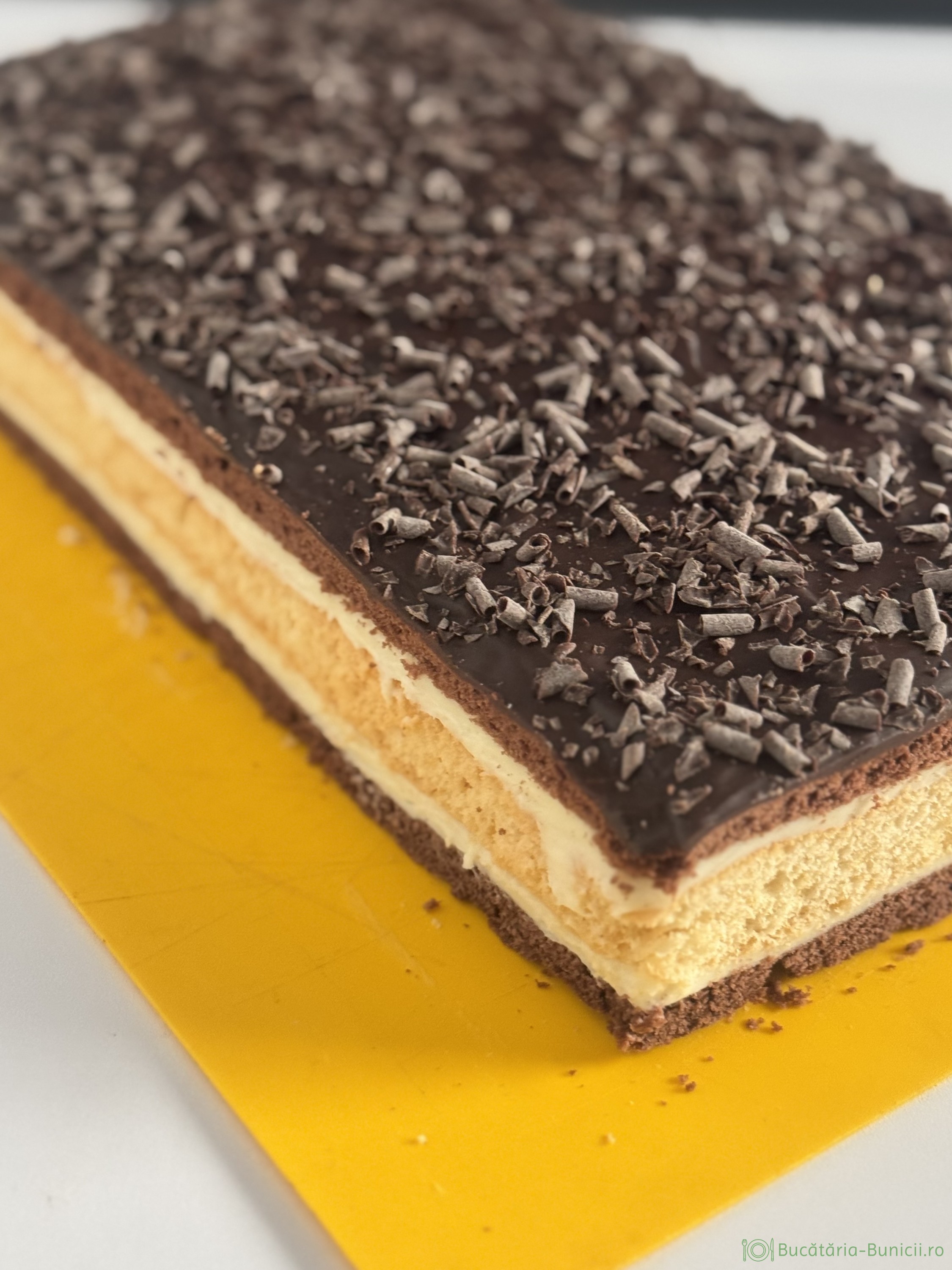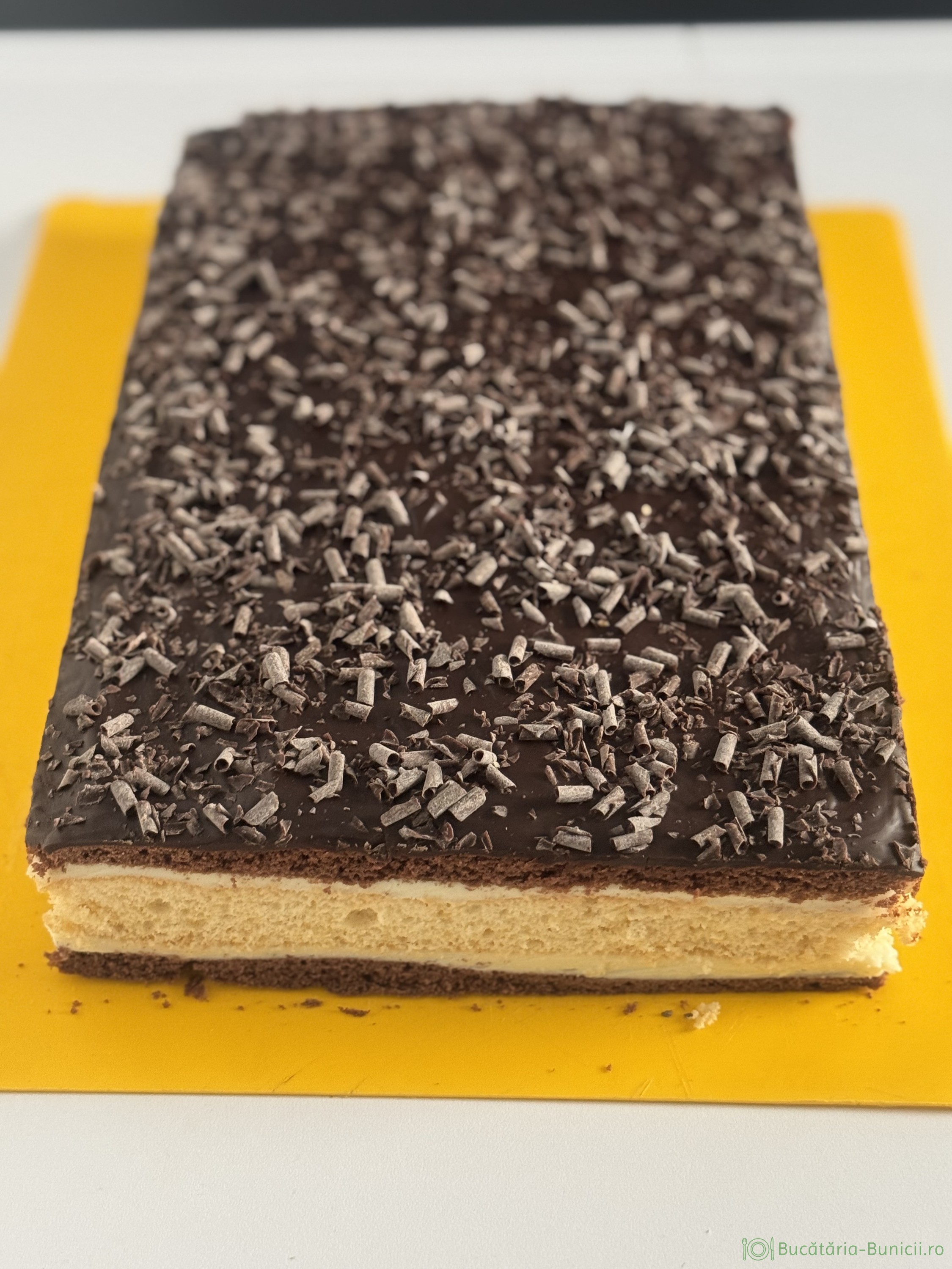 - Se pune un blat maro și se întinde 1/2 din cremă, se așază blatul galben, care se îndreaptă, daca nu este uniform deasupra, peste care se întinde restul de cremă, iar deasupra se așază al doilea blat maro.