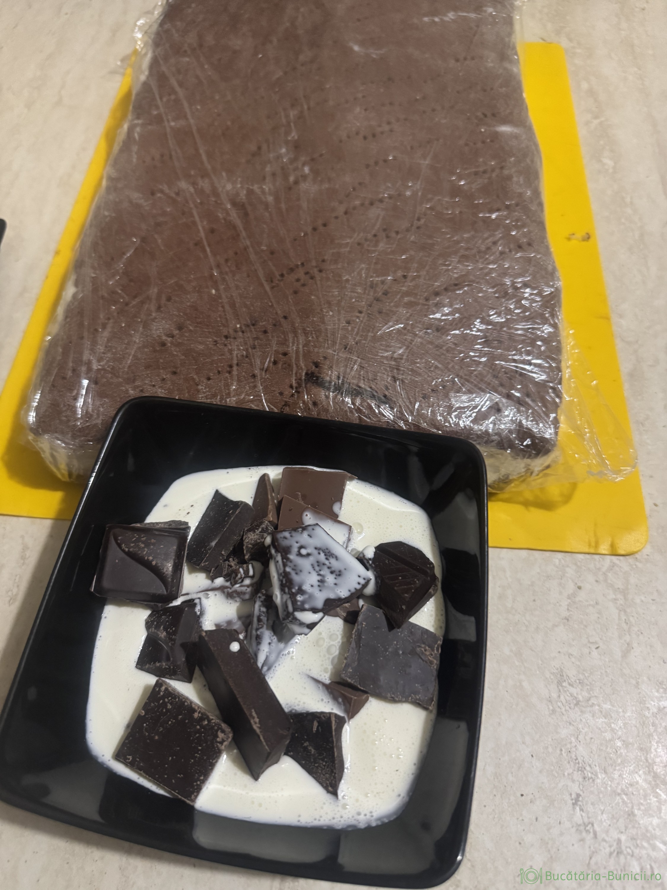 - Se pune ciocolata și frișca lichidă la încălzit, la microunde, sau pe baia de abur, până se înfierbântă frișca și se topește ciocolata.
