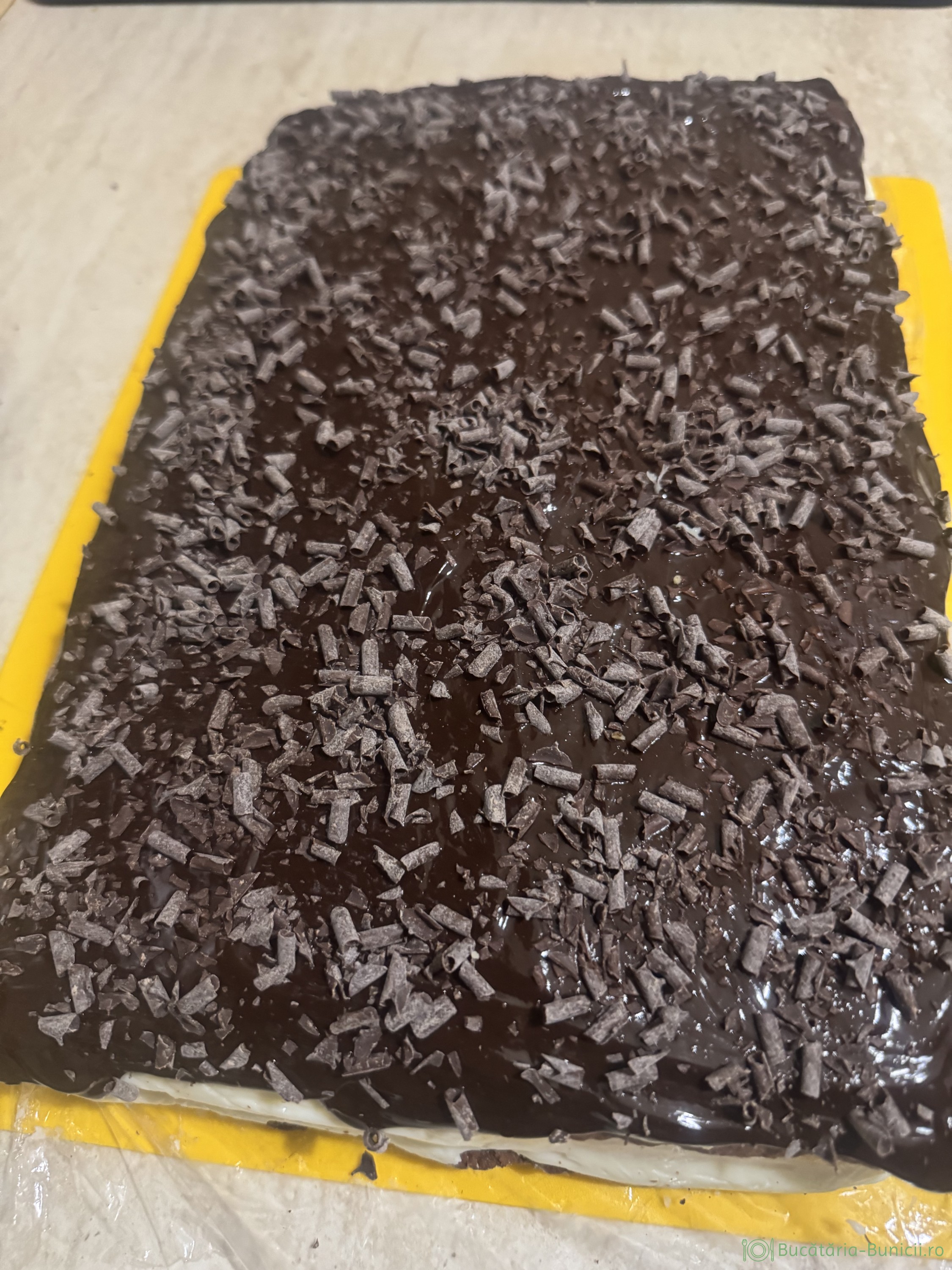 - Se nivelează, se presară bucle de ciocolată și se dă la rece, până se întărește glazura.