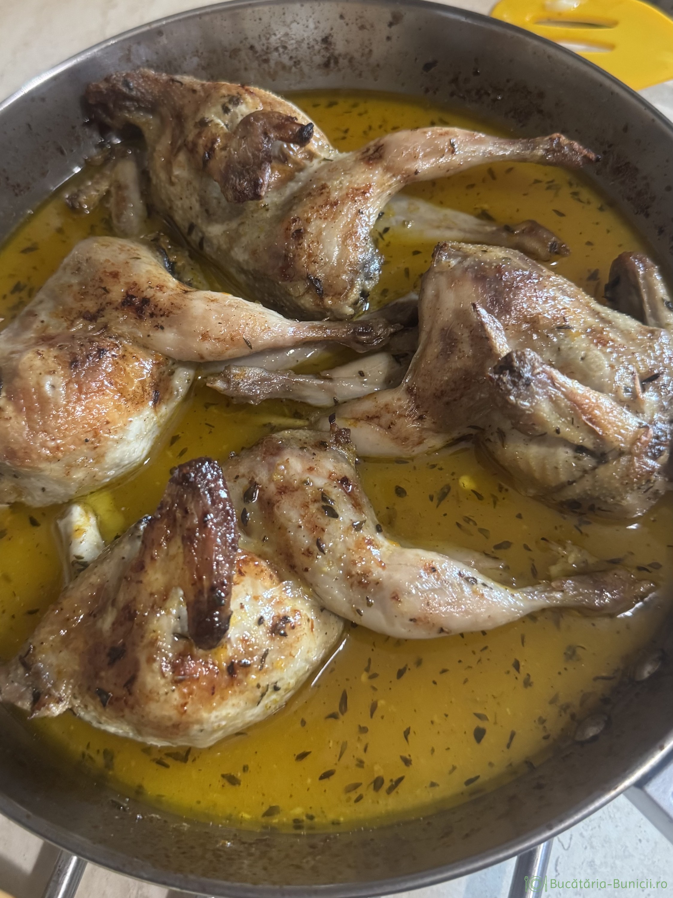 - Se dă vasul iar la cuptor, dar fără capac și se lasă încă 10-15 minute, până când păsările prind o crustă aurie deasupra.