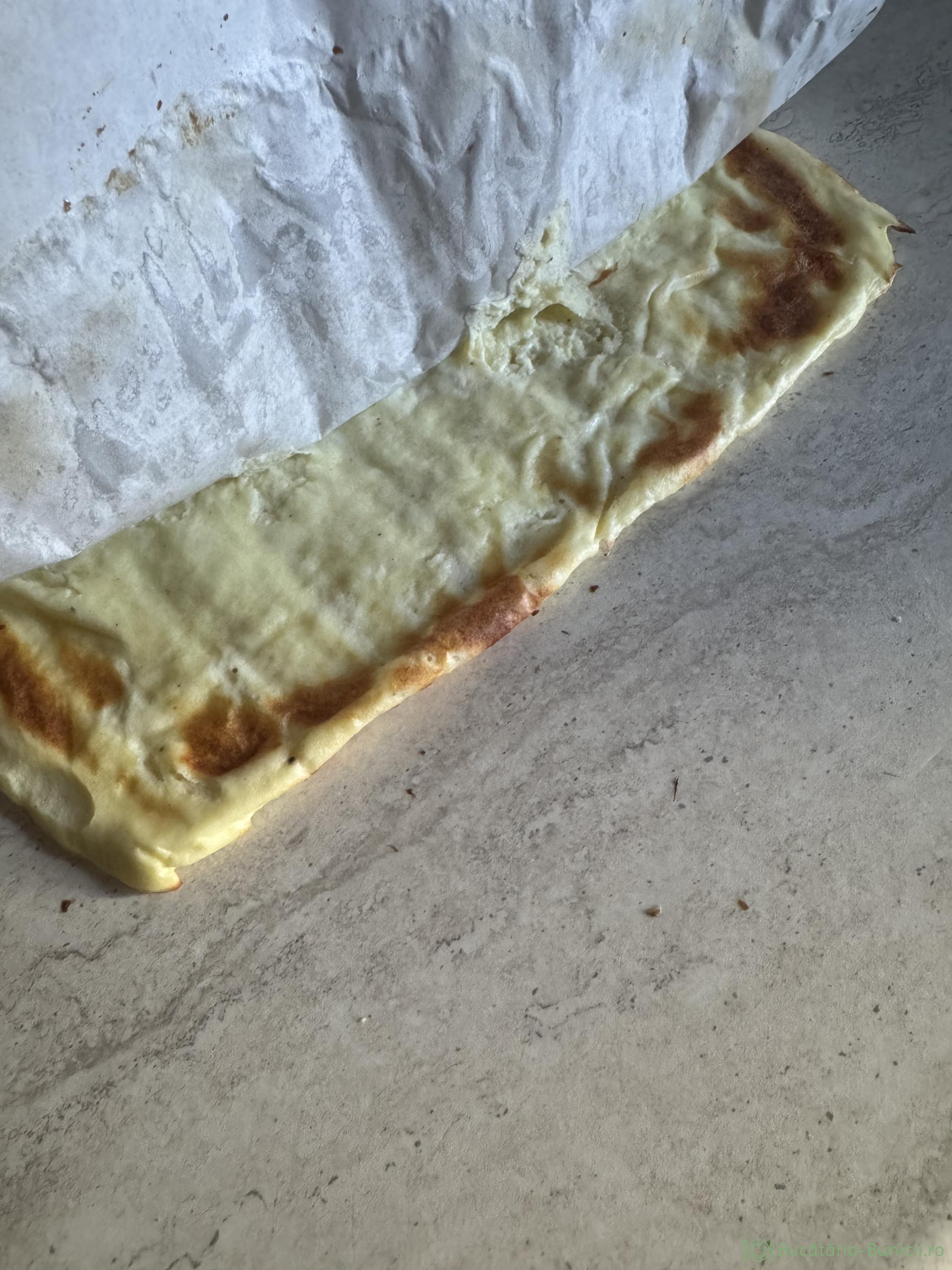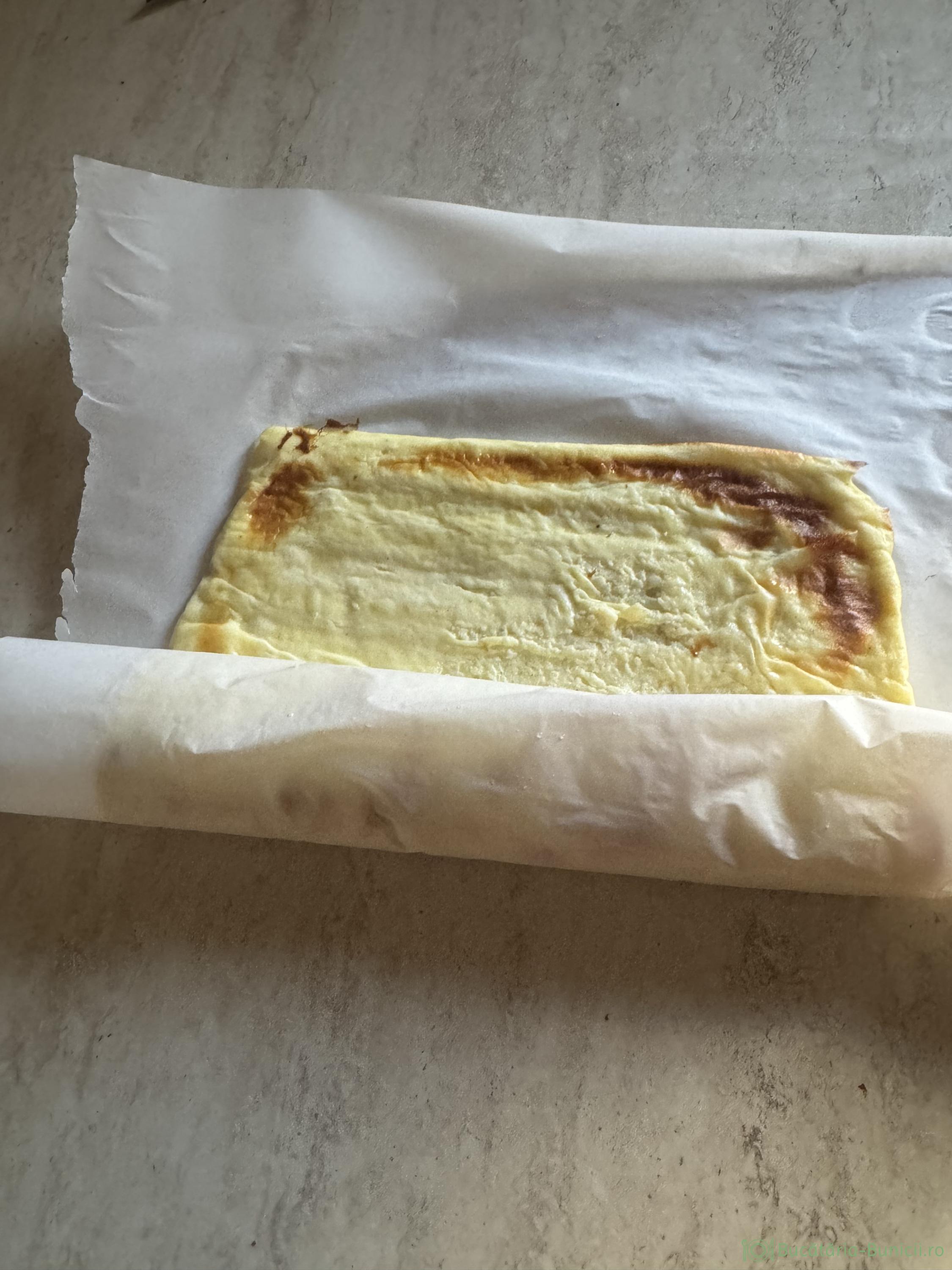 - Se scoate tava din cuptor, se ia blatul cu tot cu hârtie și se așază pe masă, cu hârtia în sus. Se îndepărtează hârtia de copt, apoi blatul se așază iar pe hârtie, se rulează cu tot cu hârtie și se lasă la răcit.