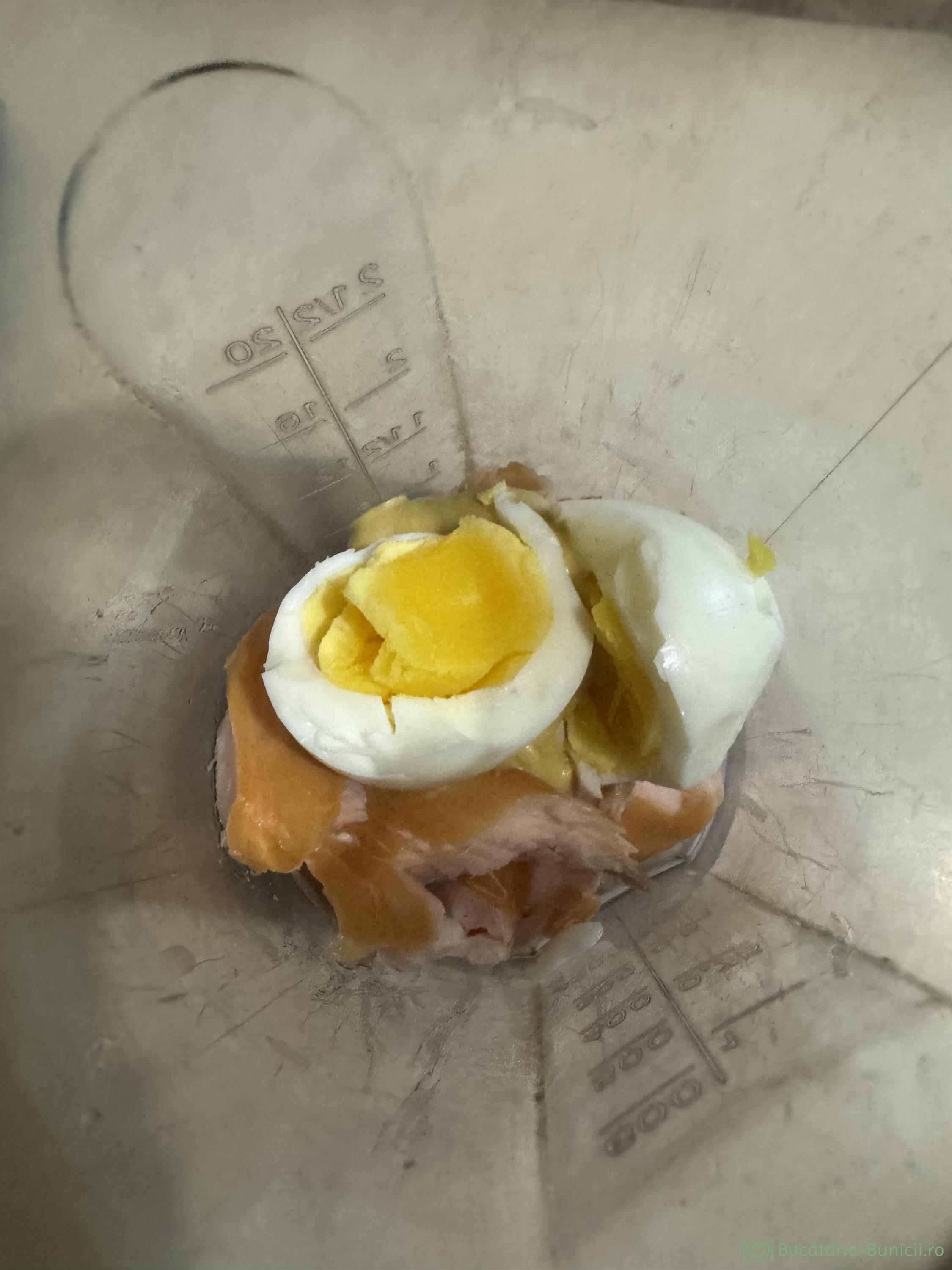 - În vasul blenderului vertical se pune 100 g somon afumat, un ou fiert tare și curățat de coajă, plus o linguriță muștar fără zahăr.