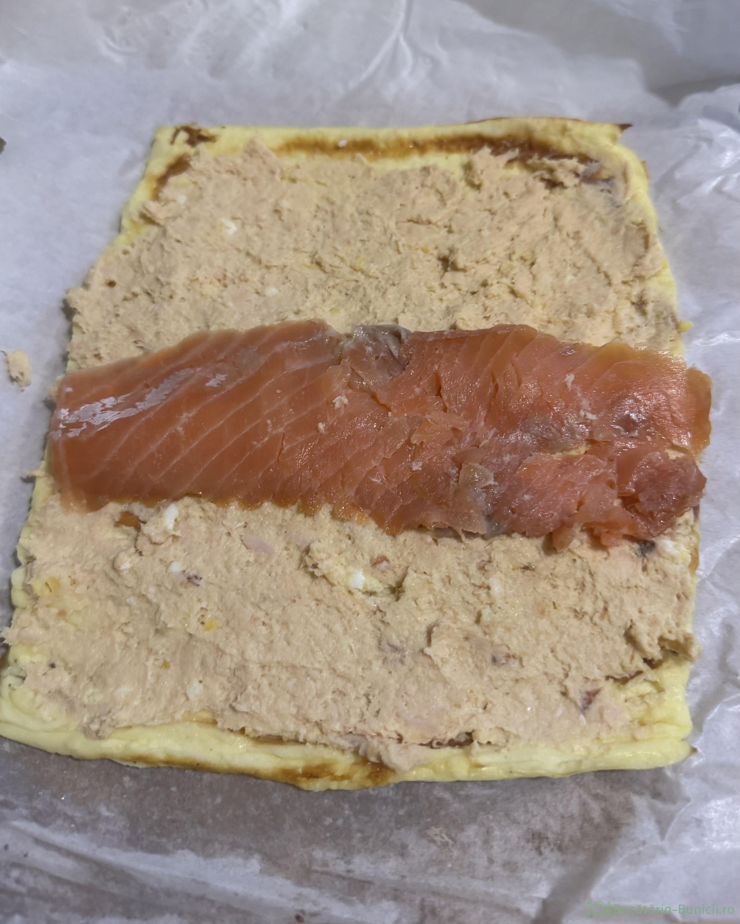 - Se desface hârtia cu blat, pe care se întinde crema de somon. La mijlocul blatului se pun două felii întregi de somon apoi se rulează, ajutându-ne de hârtia de copt.