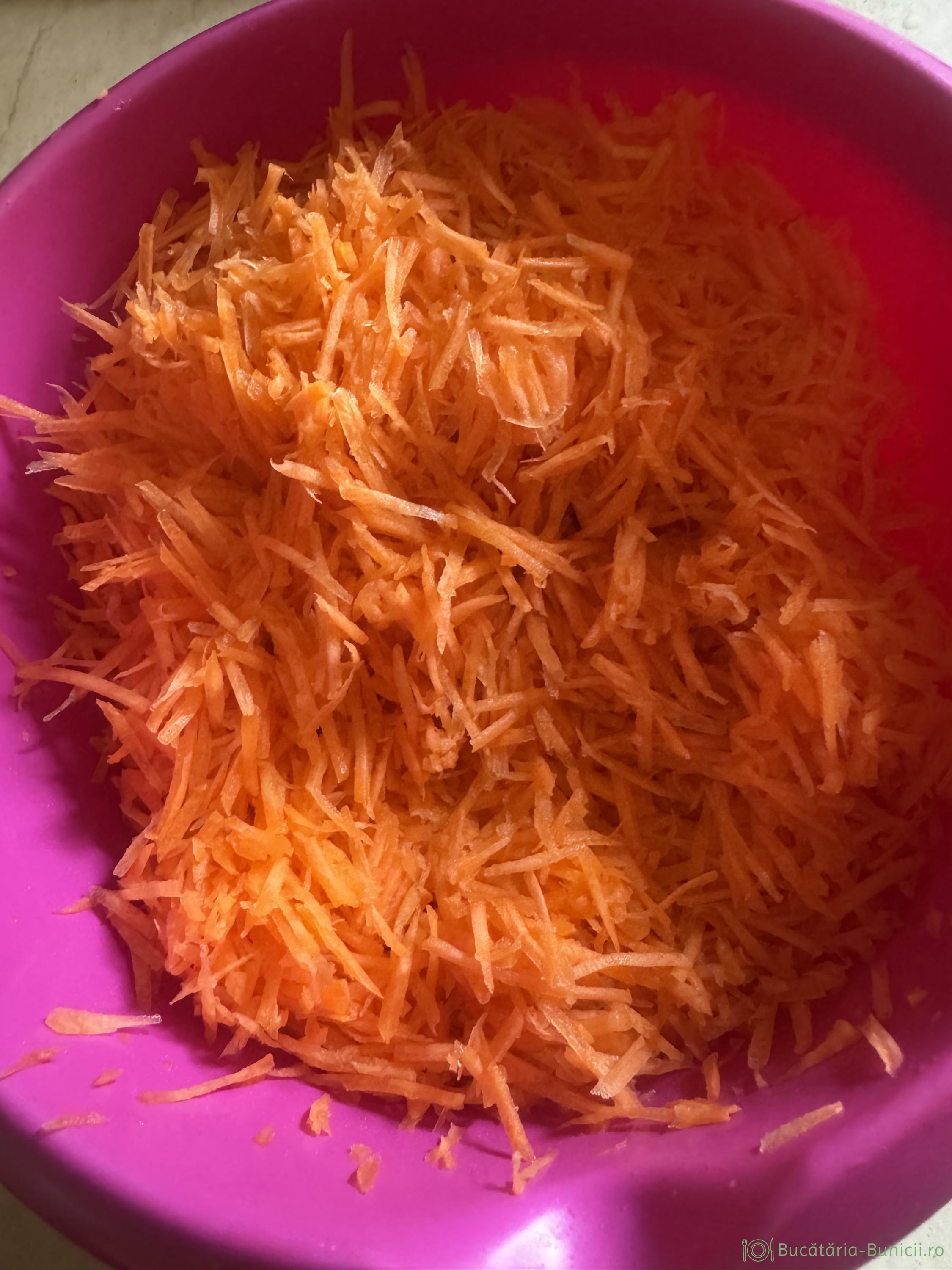 - Morcovii curățați se dau pe răzătoare și se pun într-un bol.