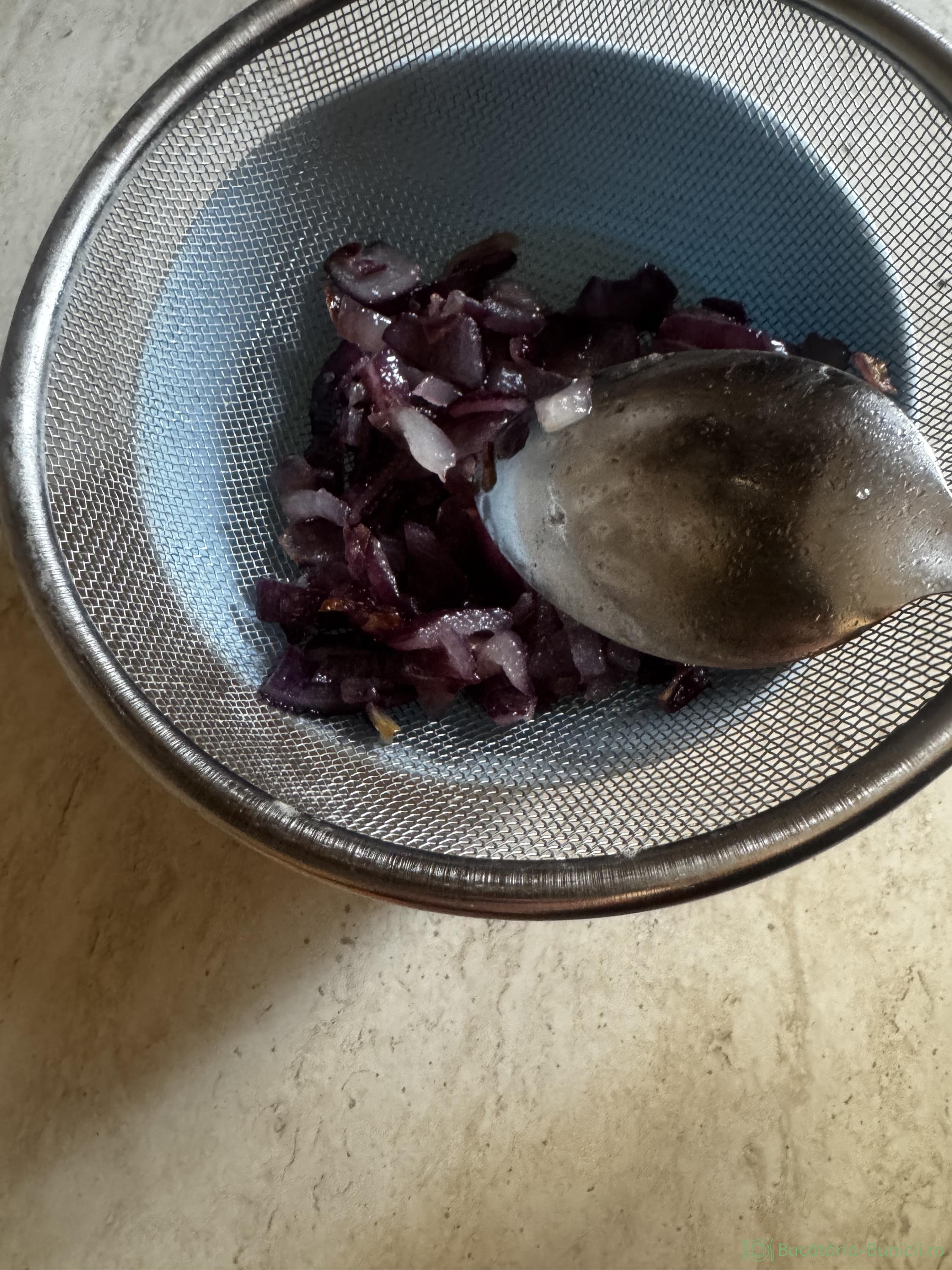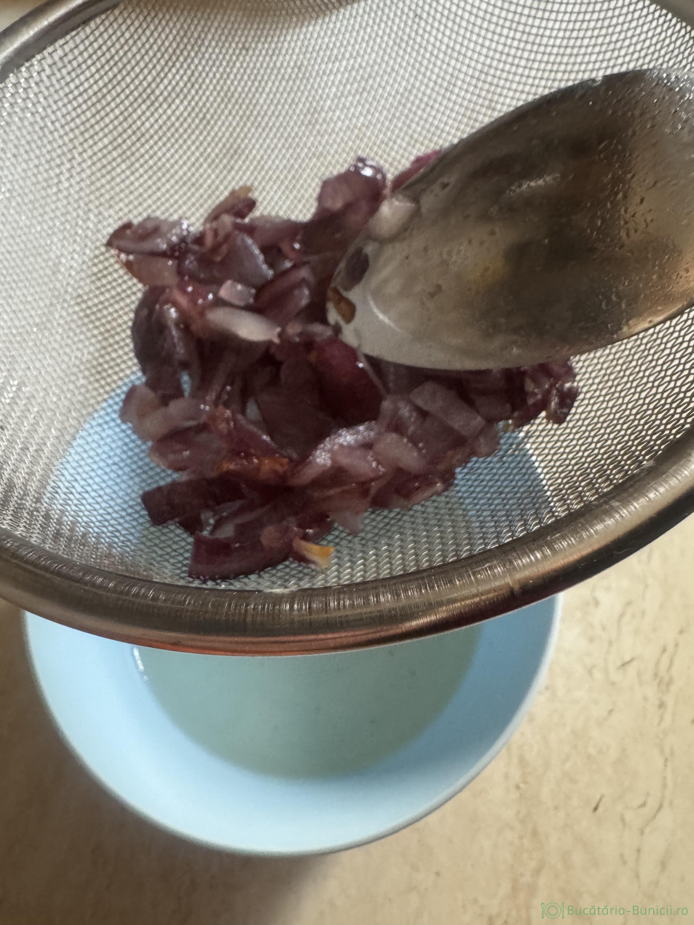 - Se așază o strecurătoare pe un vas, când ceapa este călită, se toarnă conținutul vasului în strecurătoare, iar cu dosul lingurii se apasă pe ceapa călită, să se scurgă tot uleiul.