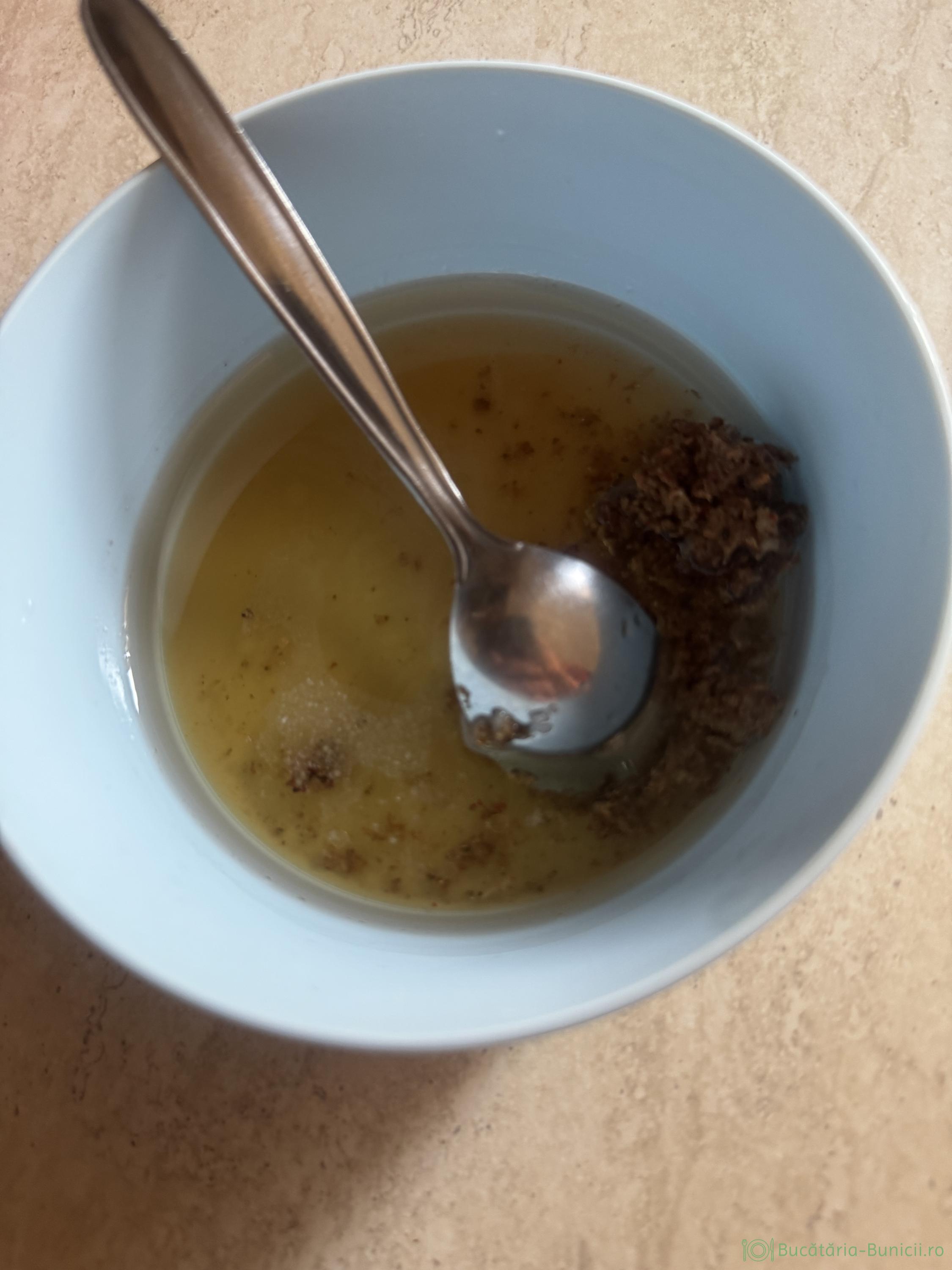 - Într-un vas micuț antiaderent se pune uleiul la înfierbântat, se pune ceapa tocată și se călește, până se rumenește. În salată vom folosi doar uleiul cu gust de ceapă, dar nu și ceapă rumenită.