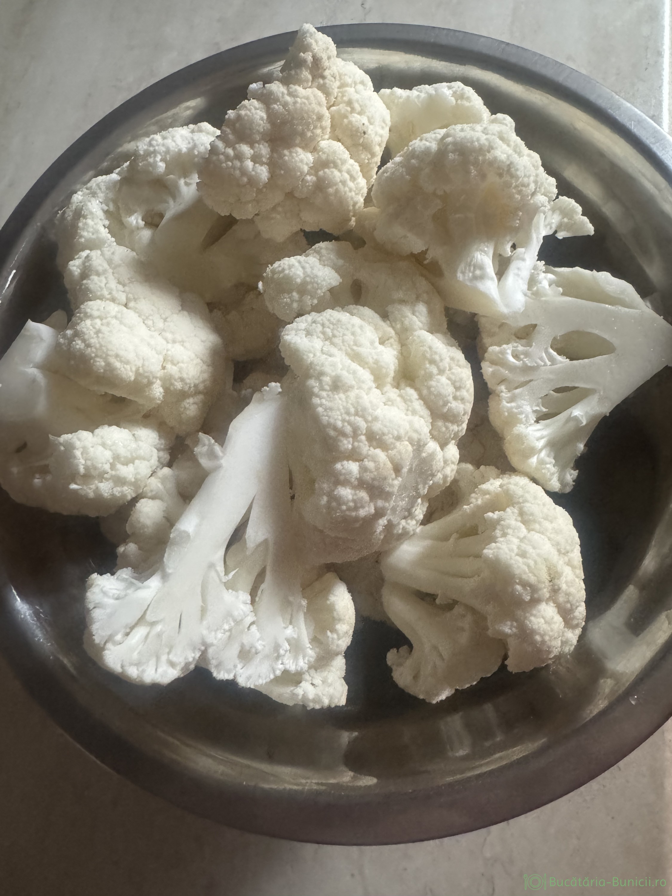 - Buchetele de conopidă se fierbe 5 minute în apă cu puțină sare. Se strecoară de apă și se lasă la răcit.