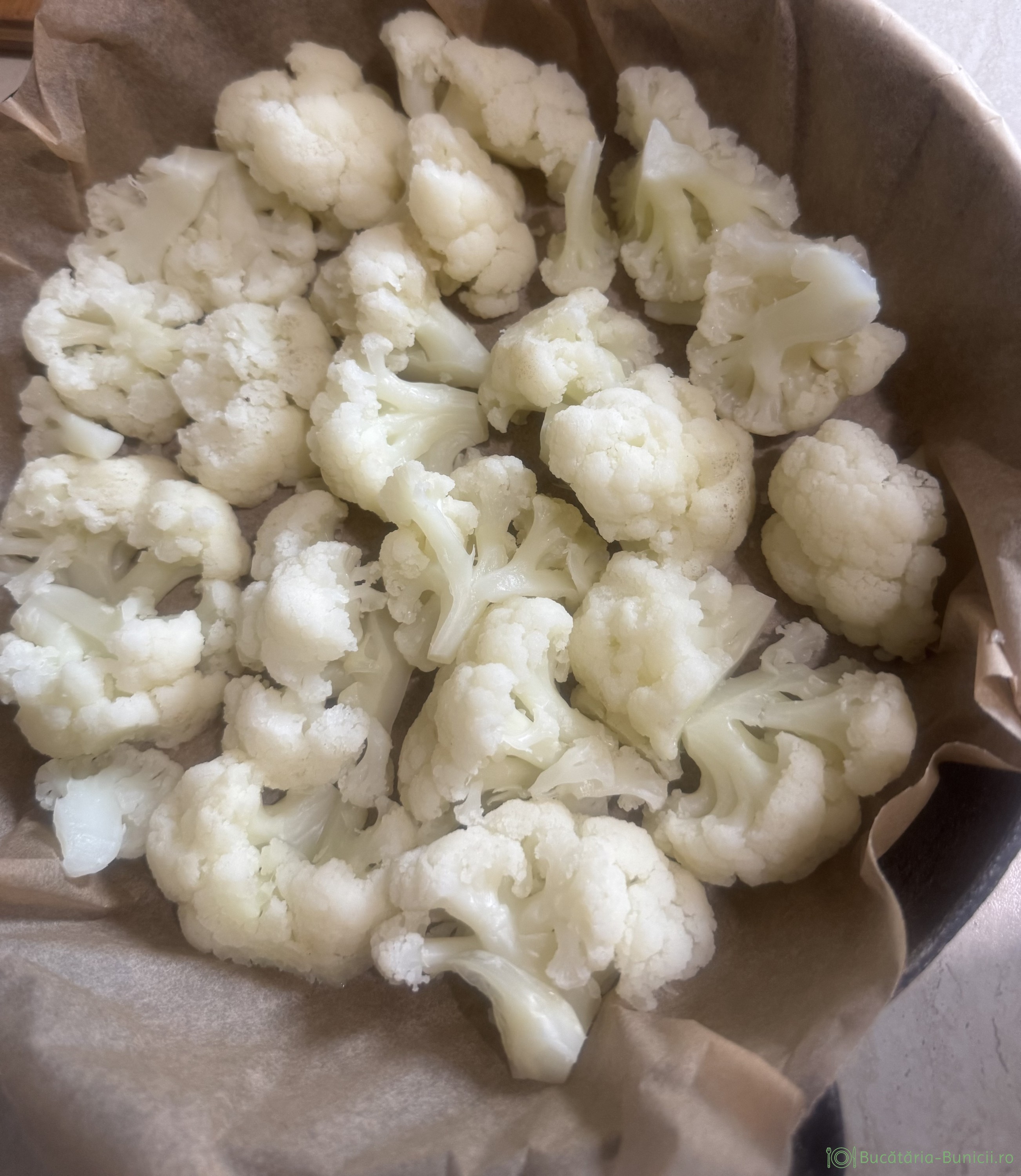 - În tava se pune conopida fiartă și ajutându-ne de fundul unui pahar, se tasează, formând o bază netedă pentru tartă, fără să ramana goluri printre bucățile de conopidă (vezi galeria foto).