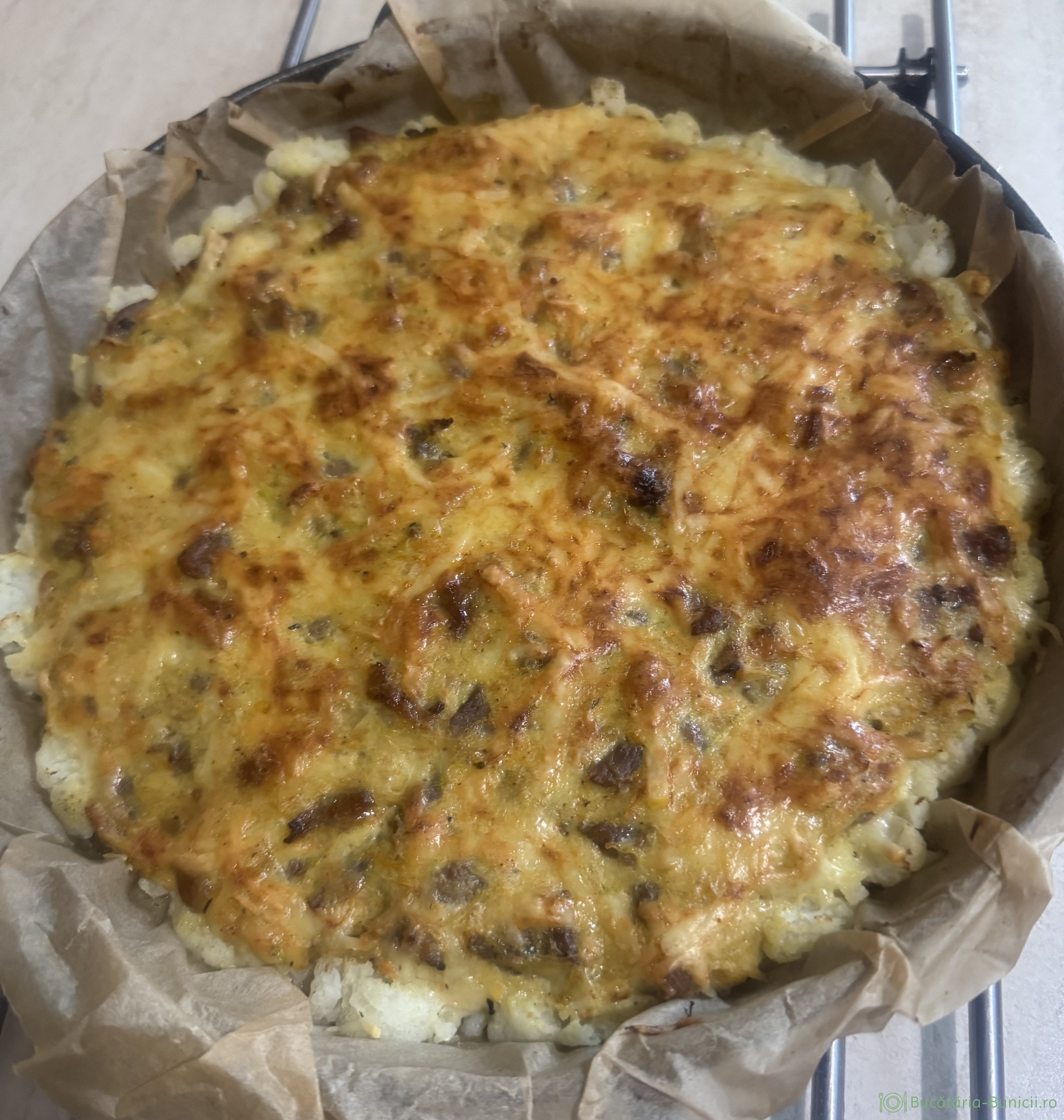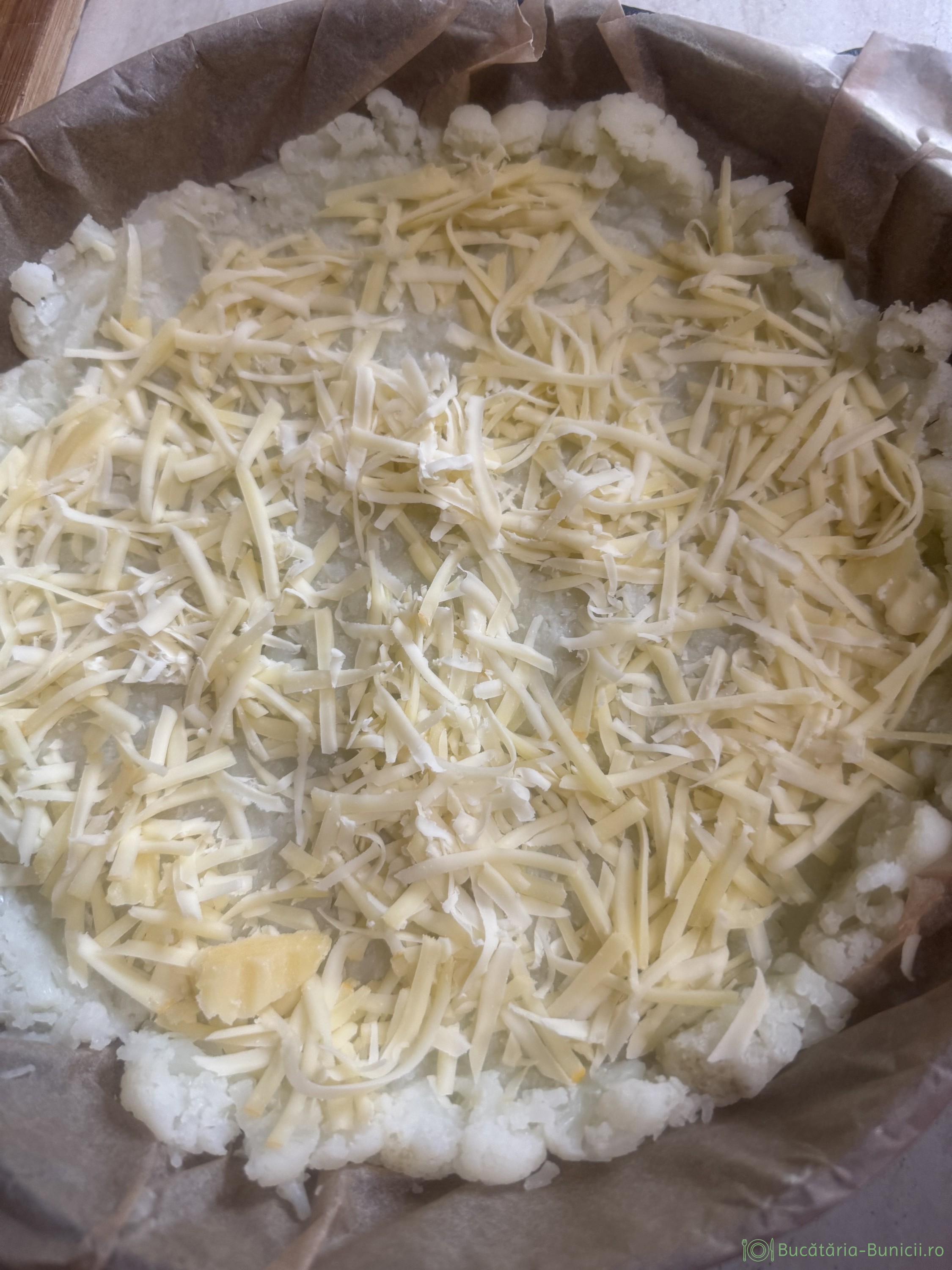 - Peste conopidă se presară, un strat de cașcaval dat prin răzătoarea mare și se dă tava deoparte.
