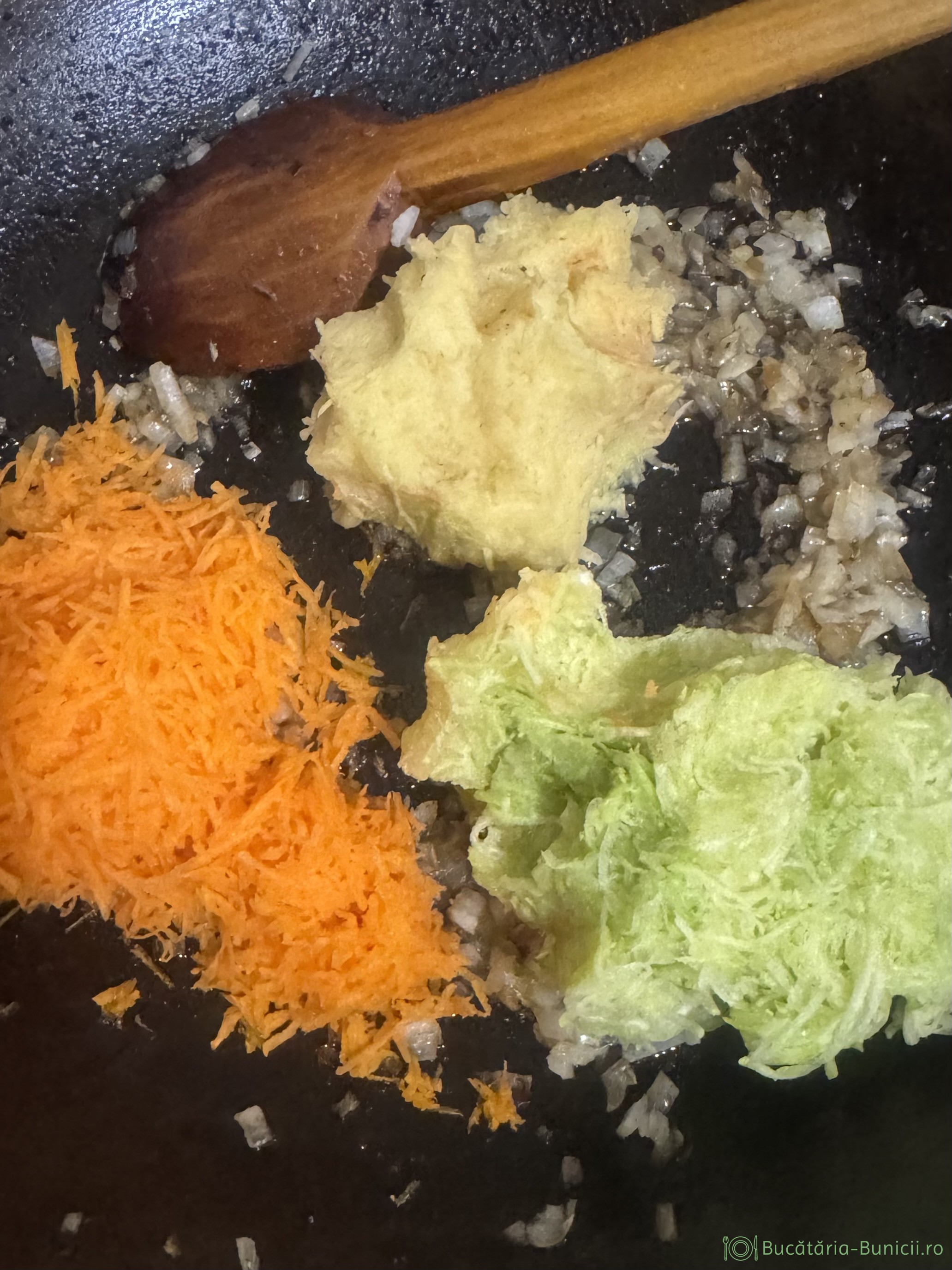 - În uleiul rămas în tigaie se călește ceapa, după care se pun morcovul, cartoful și dovlecelul, ultimele două strângându-le în mâna, să eliminăm sucul din ele.
