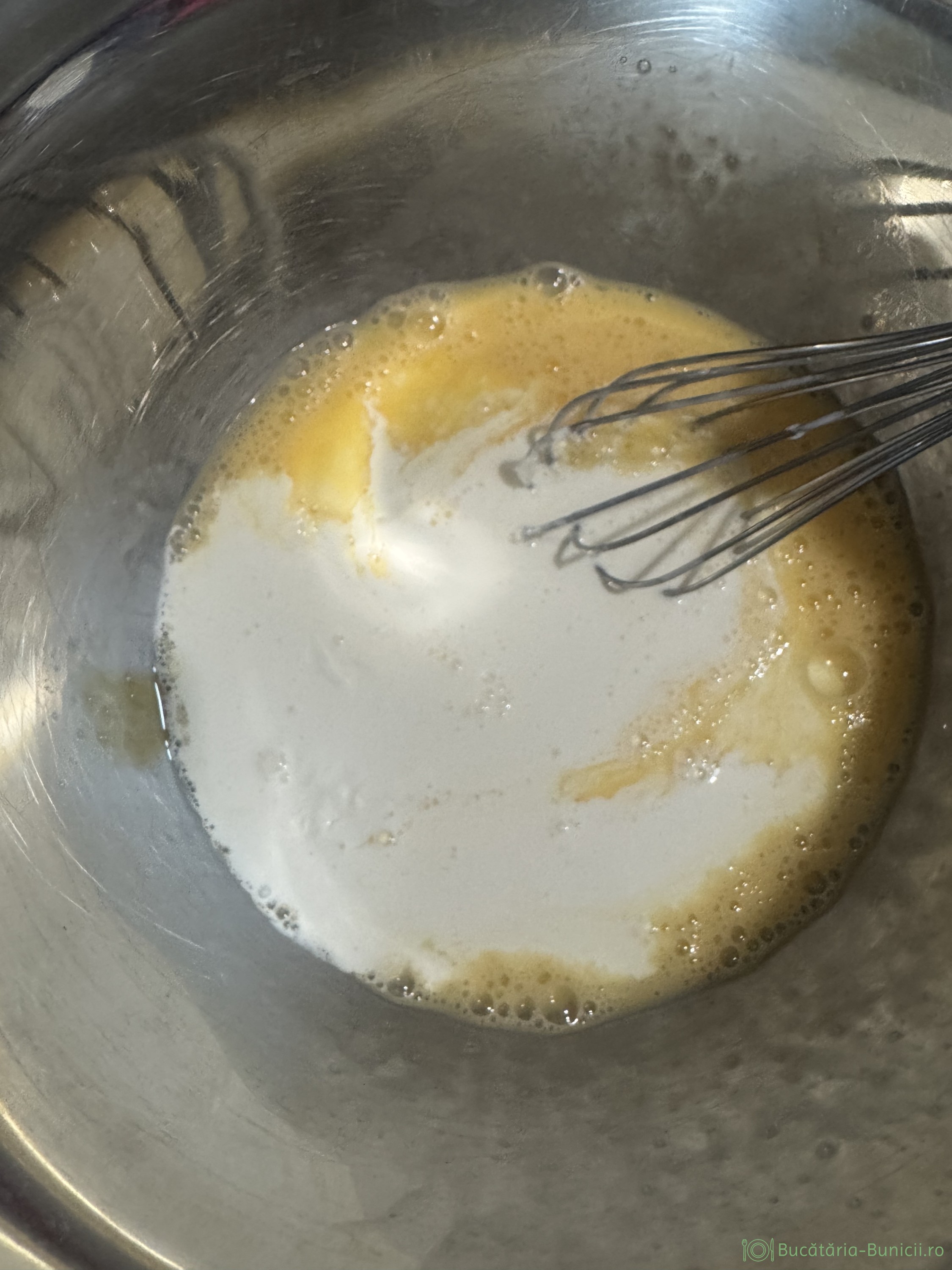 - Într-un vas mai mare se bat ouăle cu smântână. Se adaugă legumele călite și carnea prăjită. Se amestecă bine. În compoziție se adaugă aproape tot cașcavalul ras, se presară sare și piper după gust, se omogenizează bine și se toarnă în tavă, peste blatul de conopidă.