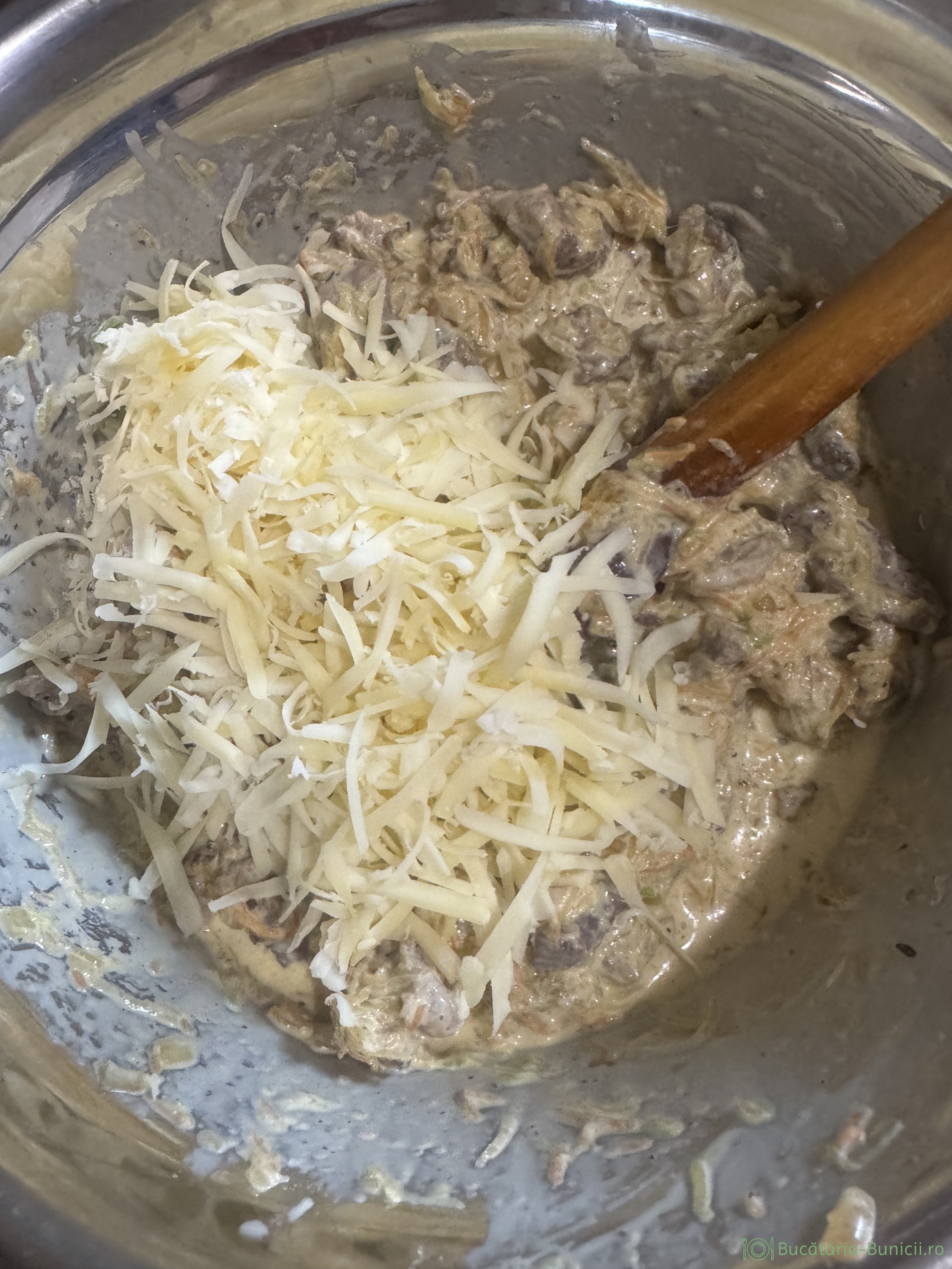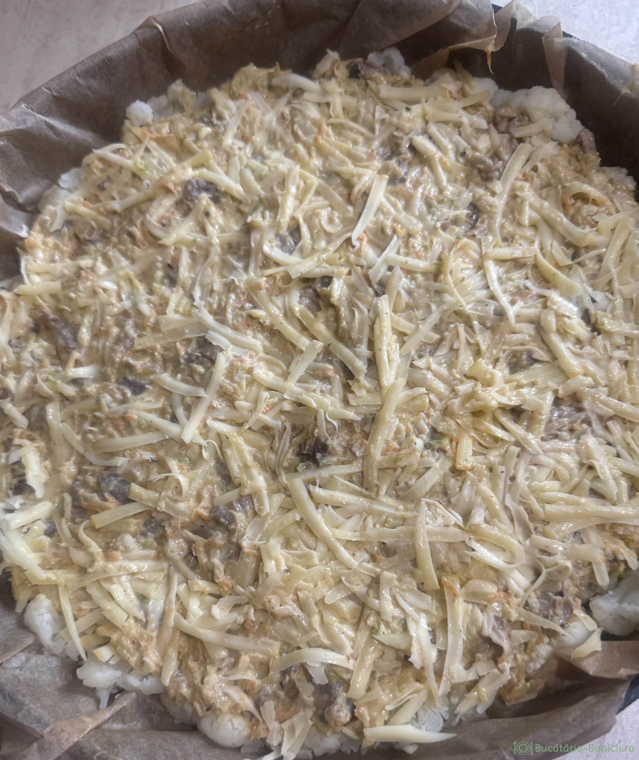 - Deasupra se presară puțin cașcaval (din cele 250 g menționate la început). Eu am folosit șvaițer, dar foarte bine poate fi înlocuit cu mozarella, sau orice alt cașcaval.