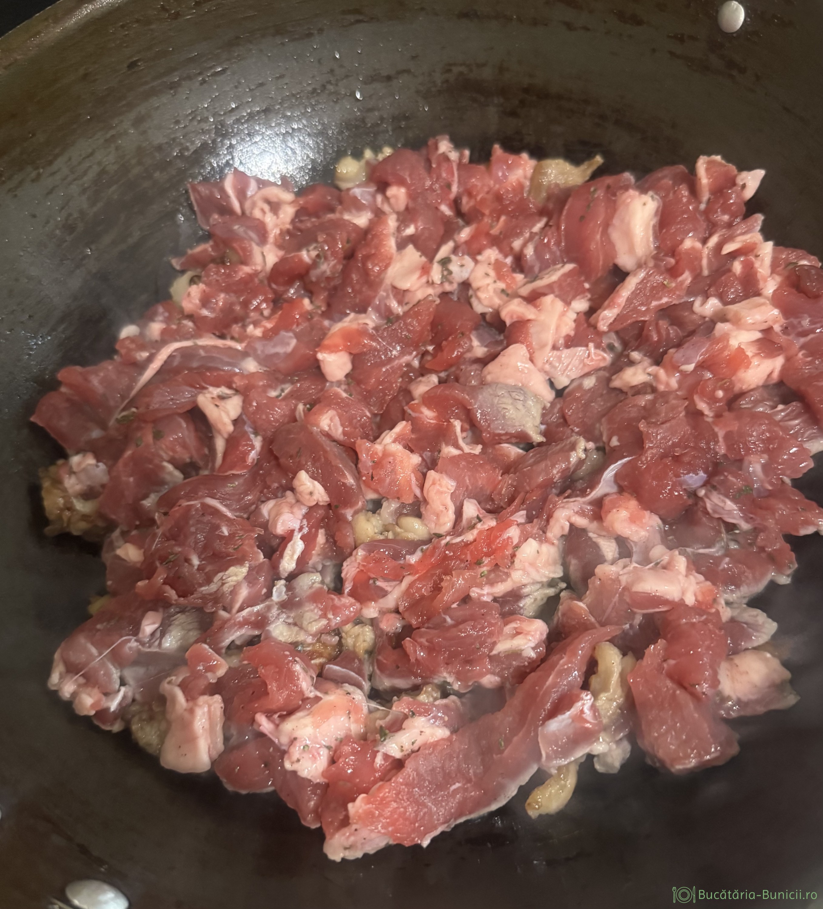- Într-o tigaie antiaderenta se pune uleiul la încins și se adaugă carnea. Se prăjește, până când este rumenă. Se scoate într-un castron și se dă deoparte.