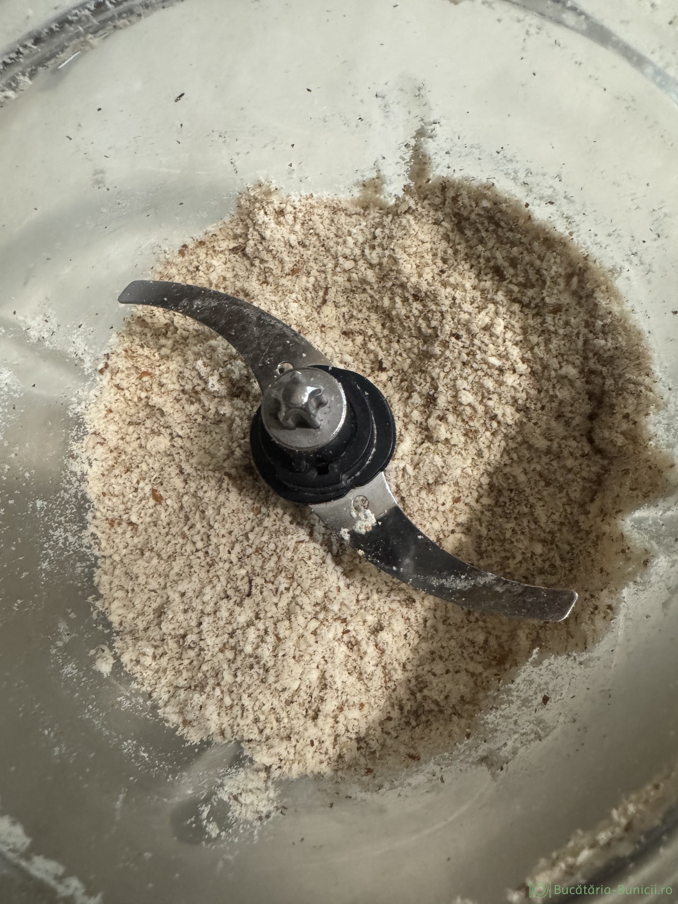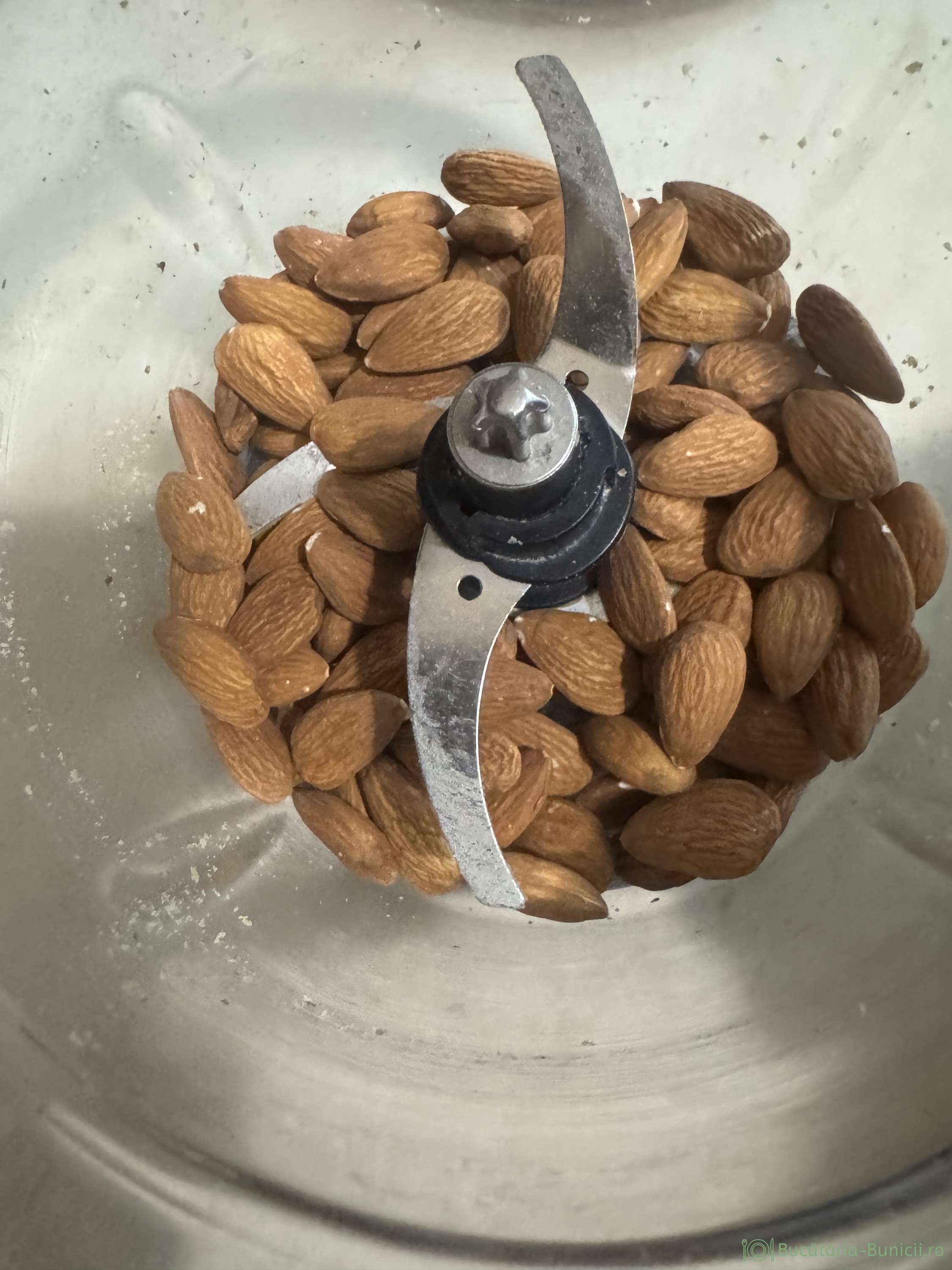 Pentru tartă putem folosi făină de migdale din comerț, care este albă la culoare și tarta va avea o culoare gălbuie, sau se dau migdale crude cu tot cu coajă la râșnița, până devine făină, iar în acest caz tarta va avea o culoare maronie. Eu am folosit migdale crude măcinate.