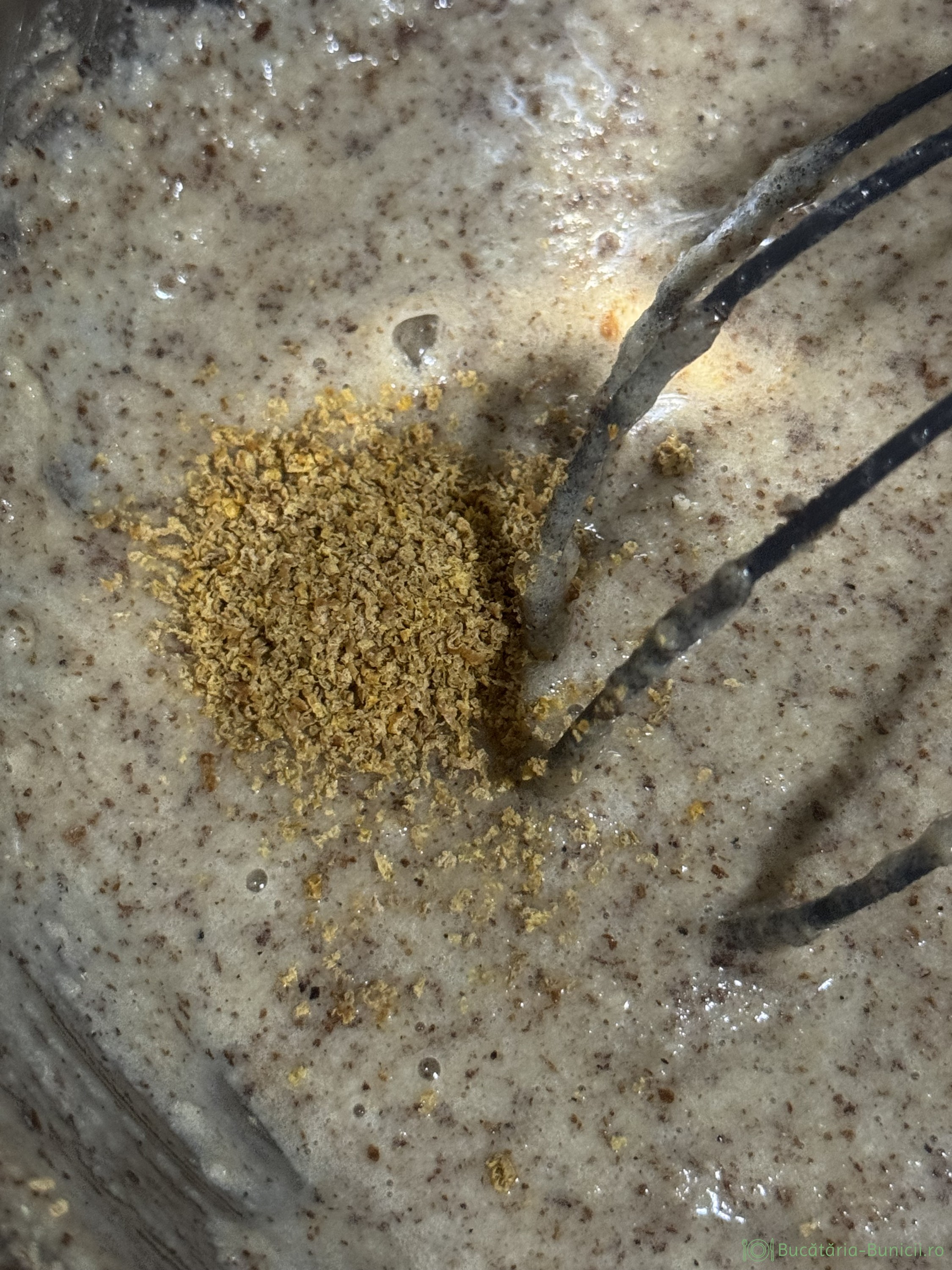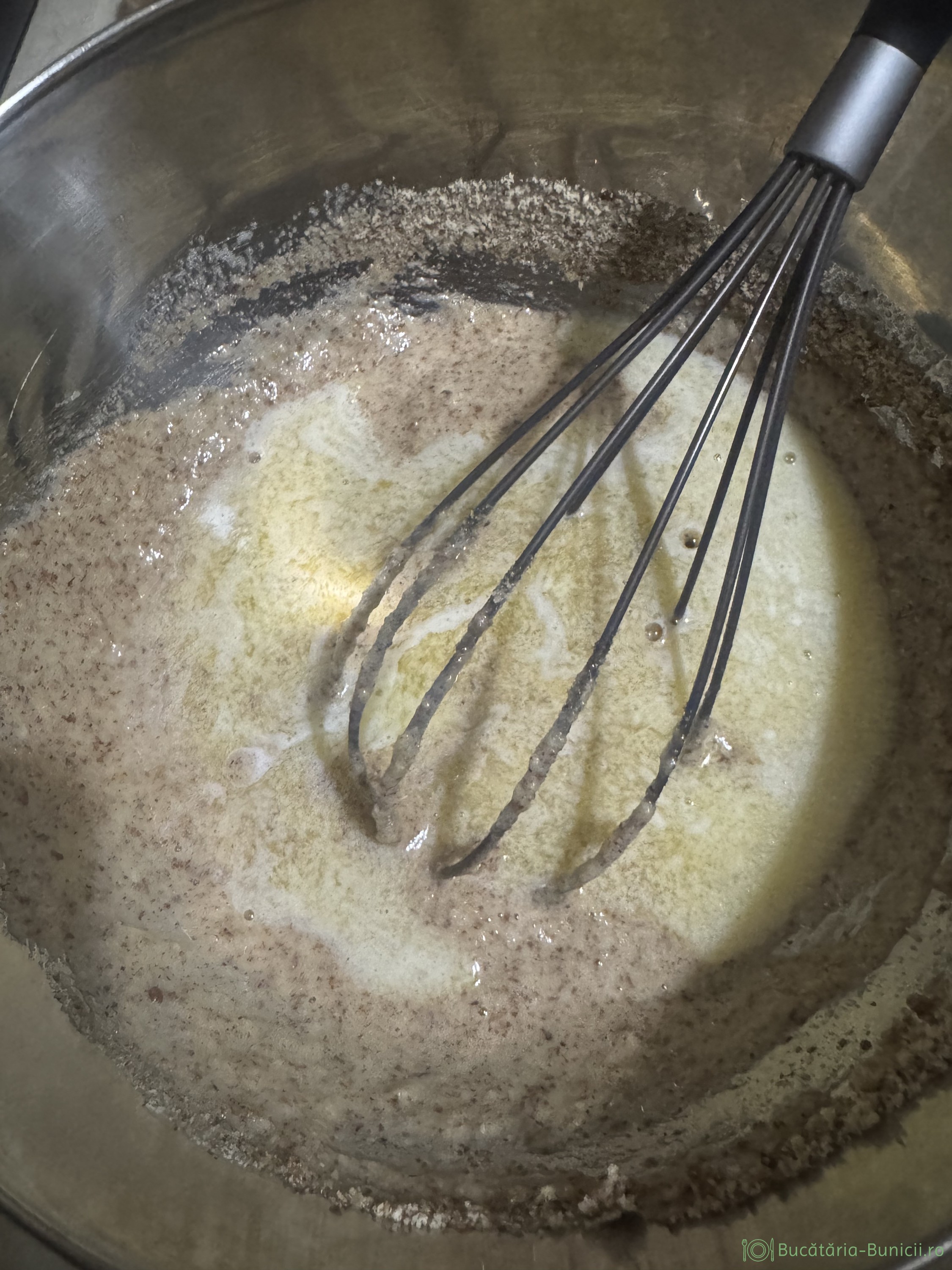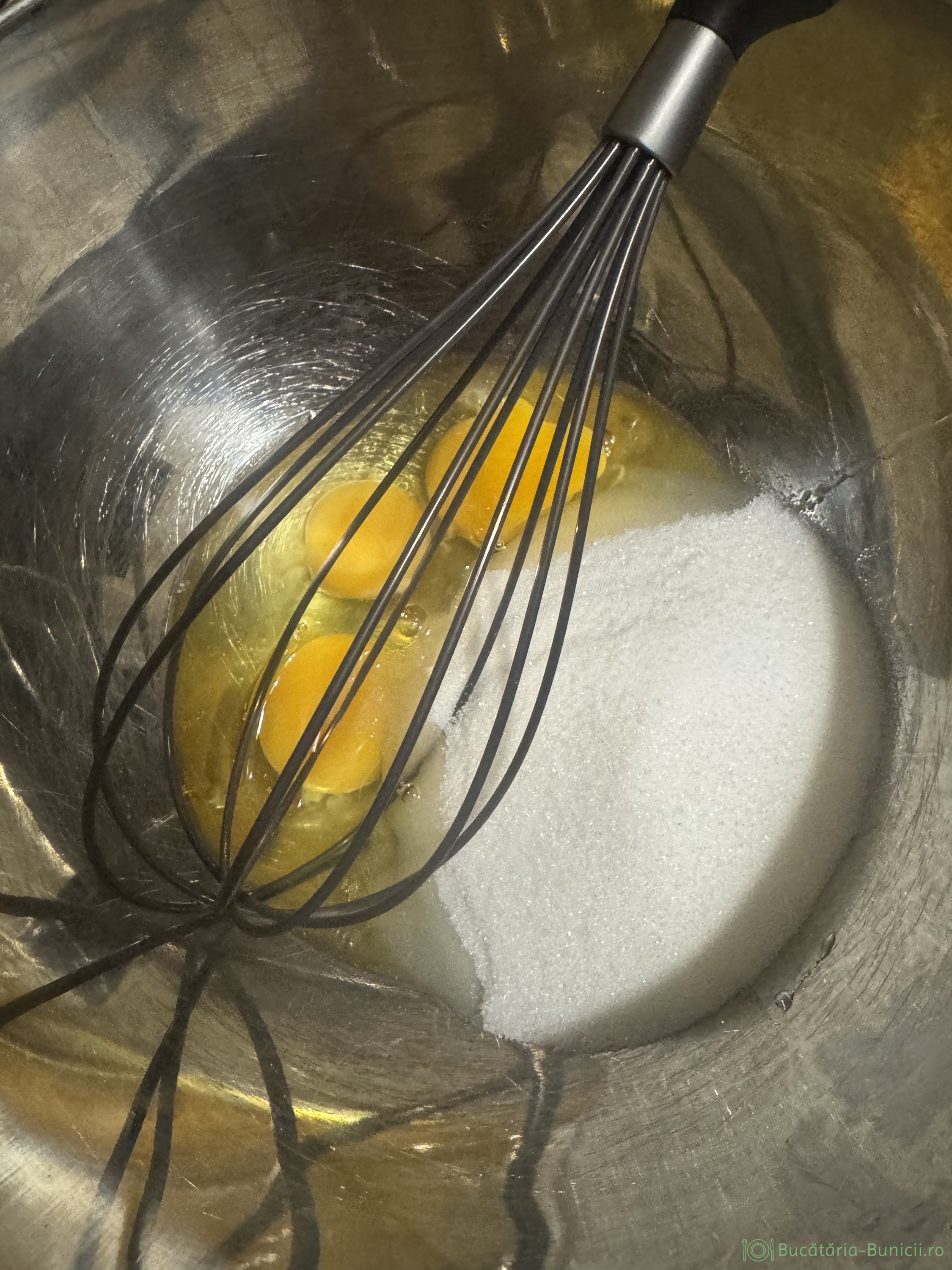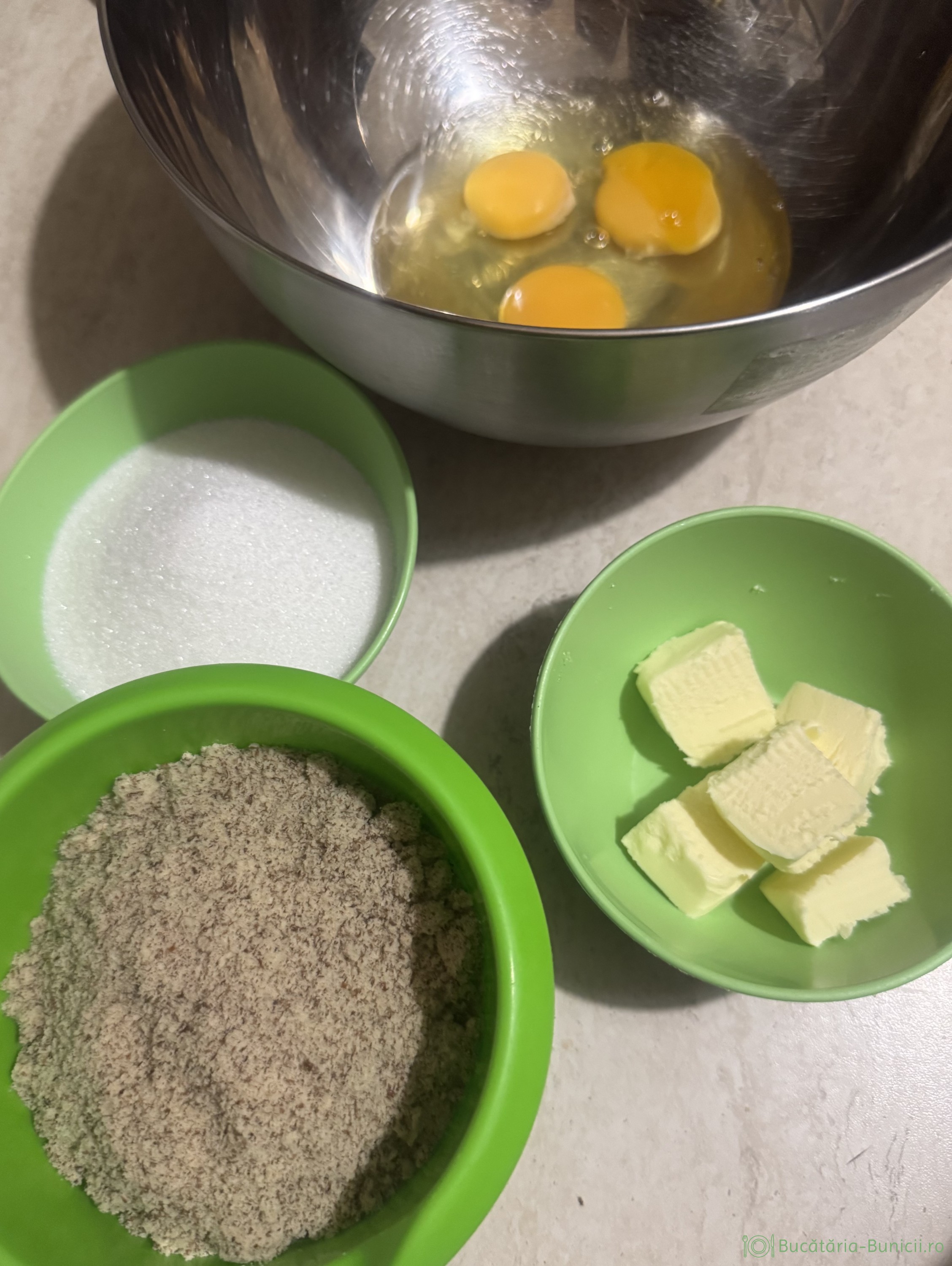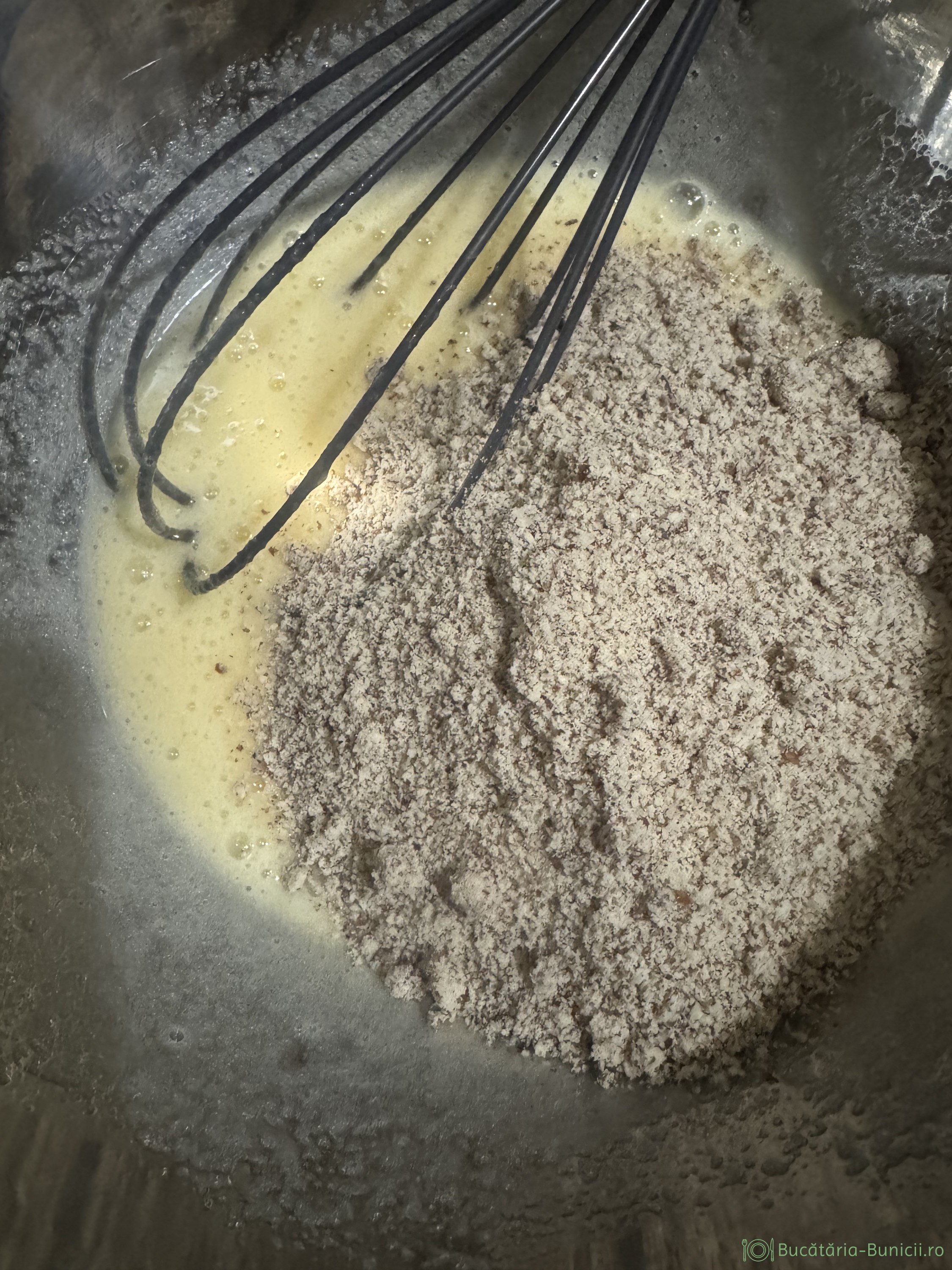 - Folosim doar telul pentru a face compoziția și începem, a amesteca într-un bol ouăle cu zahărul și un praf de sare. În crema de ou obținută, se încorporează făina de migdale, razatura de lămâie, iar la final se pune untul topit.