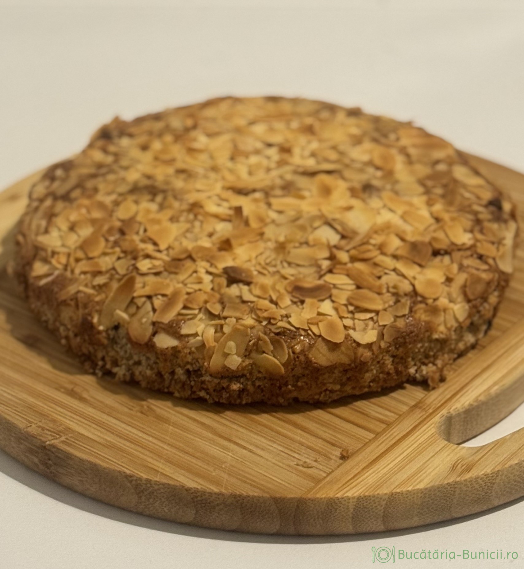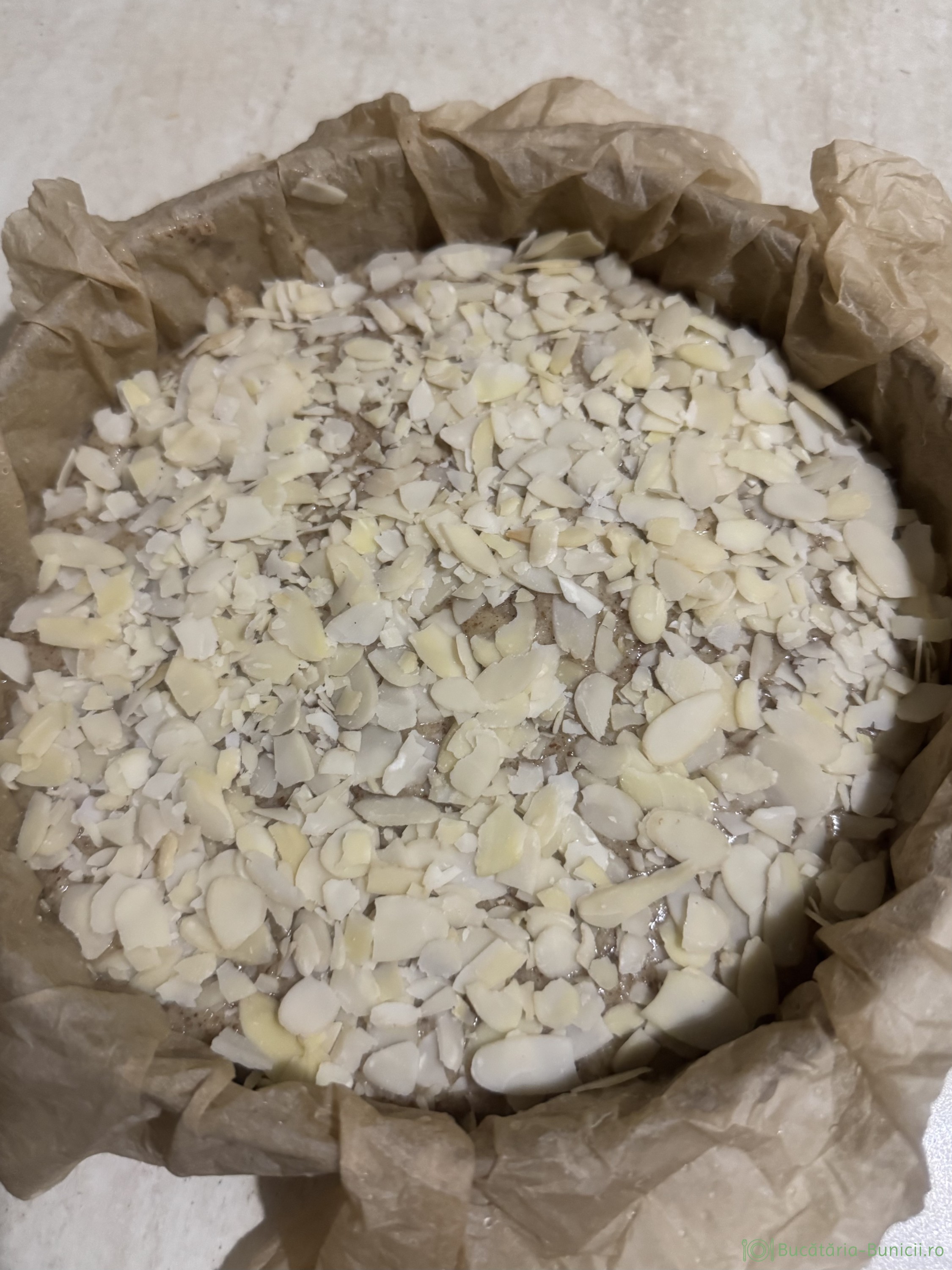 - Compoziția se toarnă în tavă, se nivelează, iar deasupra se presară fulgi de migdale.
