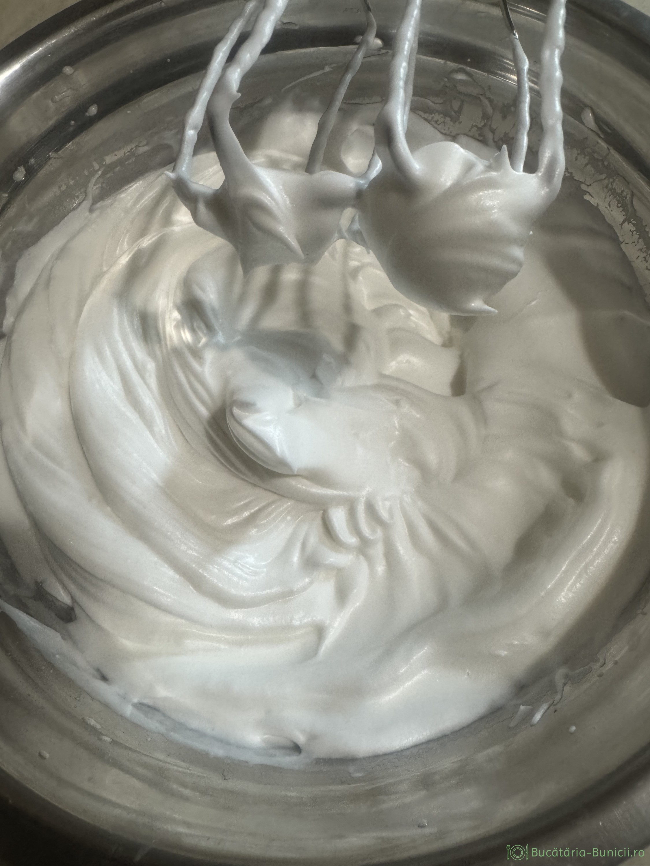 - Albușurile se mixează cu un praf de sare. Când fac vârfuri se pune îndulcitorul, spre final se adaugă oțetul, mixând până, obținem o bezea fermă, care nu cade de pe paletele mixerului.
