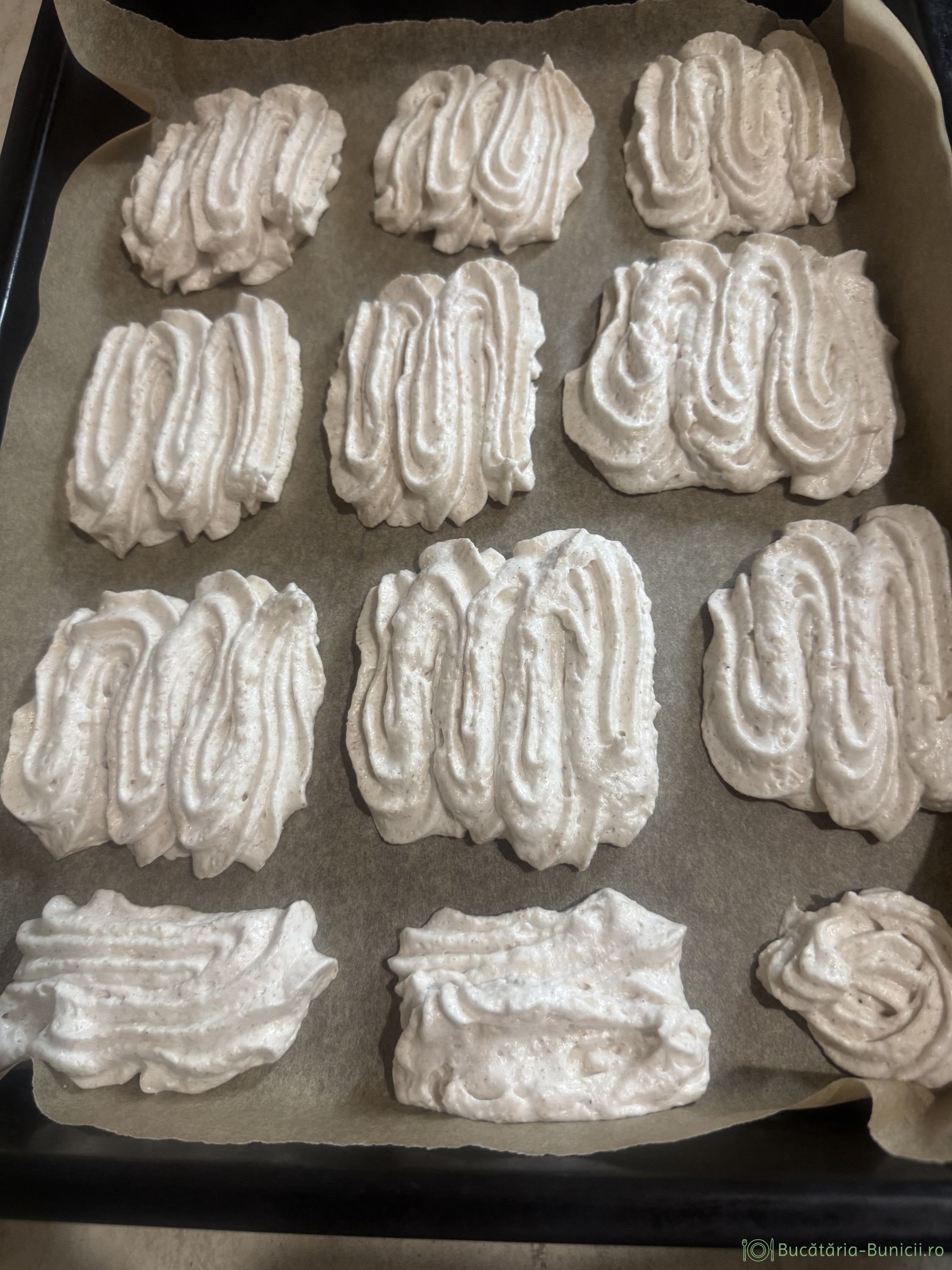 - Bezeaua se pune în posh și se fac diferite forme pe hârtia din tavă, sau mai simplu, se întinde bezeau în strat subțire pe toată suprafața tavii.