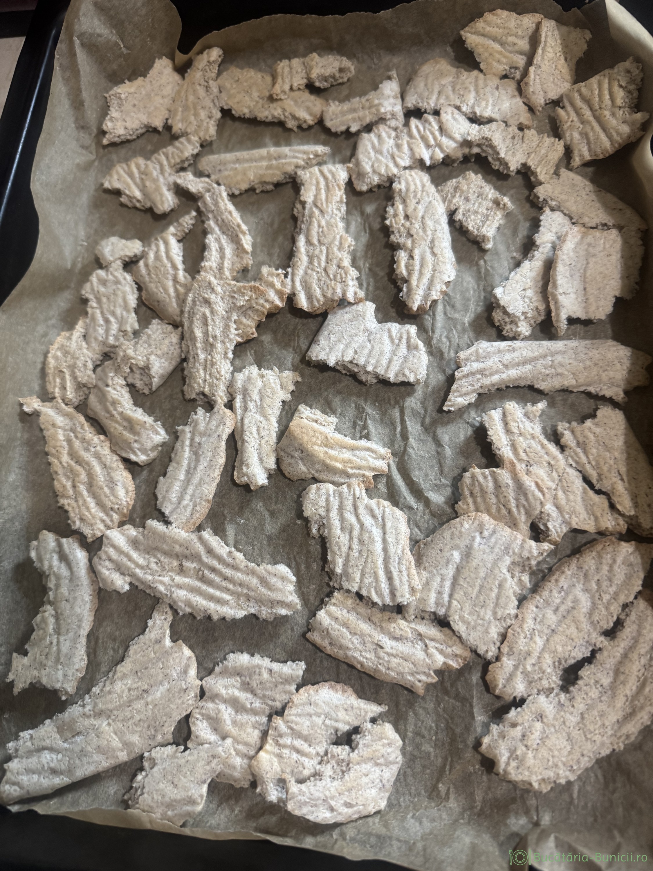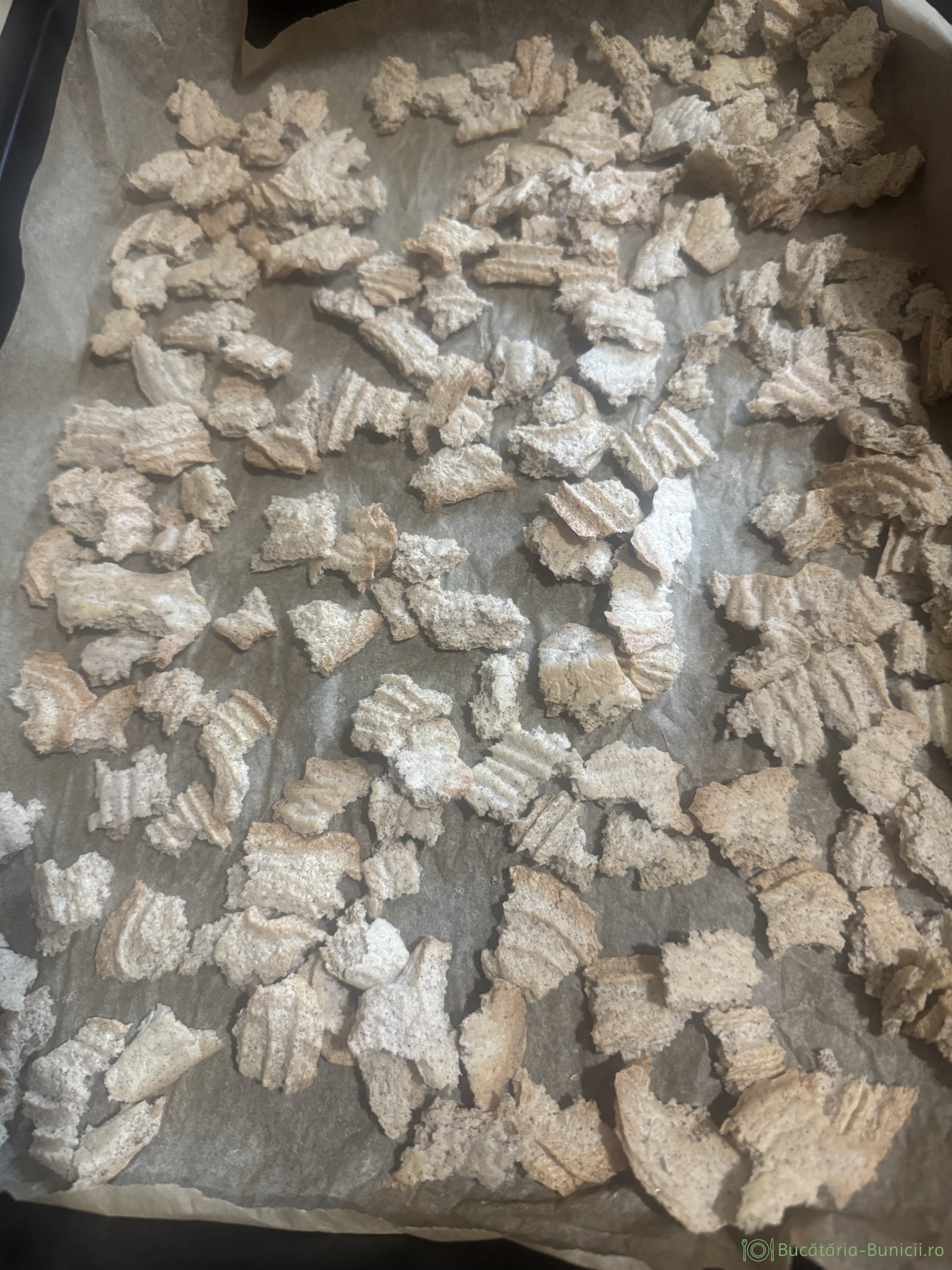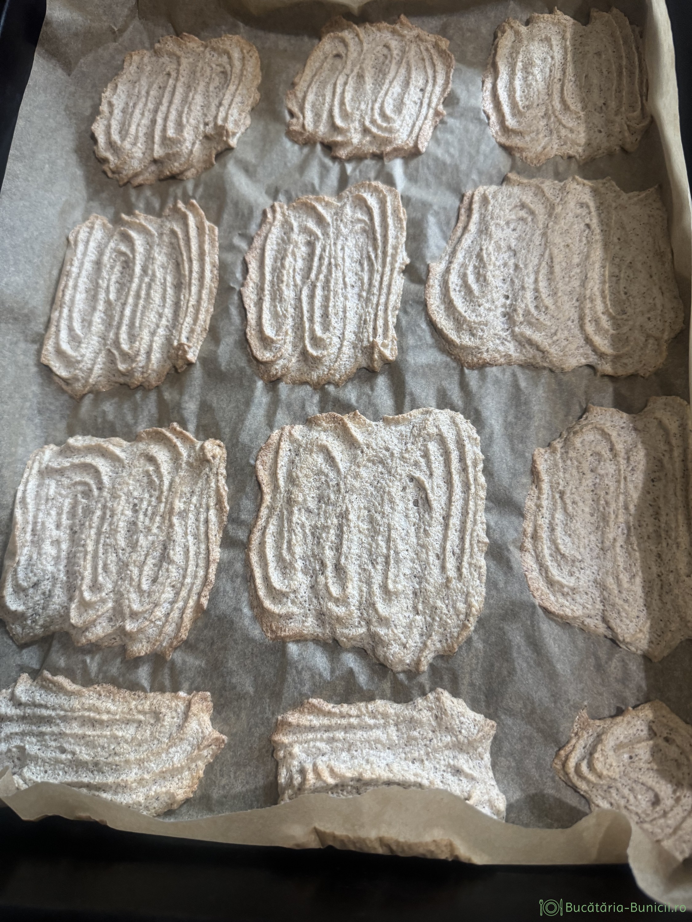 - Se dă la cuptor la 120 grade, întâi pentru 40 minute, apoi se scoate tava din cuptor, se desprinde hârtia de copt și biscuiții, sau blatul, se rup bucăți mici. Se dă iar la cuptor, tot la 120 grade, timp de 20-25 minute, până când bucățile de blat sunt uscate. Tava se lasă în cuptor, cu ușa întredeschisă, până se răcește complet.