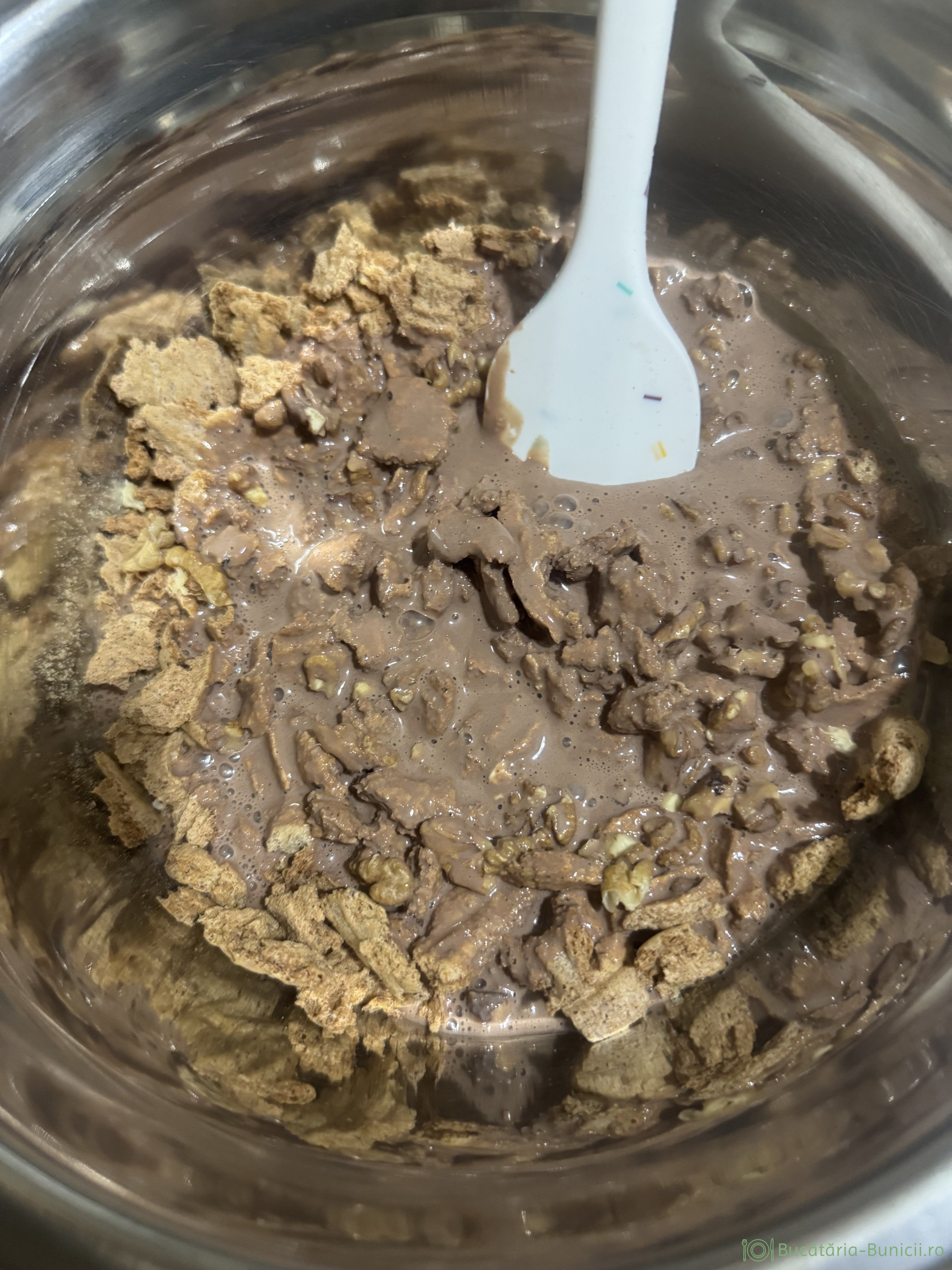 - Într-un vas încăpător se pun bucățile de blat (au fost 80 grame la final, după ce s-au uscat), miezul tocat grosier și se toarnă crema. Se amestecă toate ingredientele, se acoperă cu folie alimentară așezată direct pe compoziție și se lasă la temperatura bucătăriei 2-3 ore, până se leagă, iar crema nu mai este lichidă.