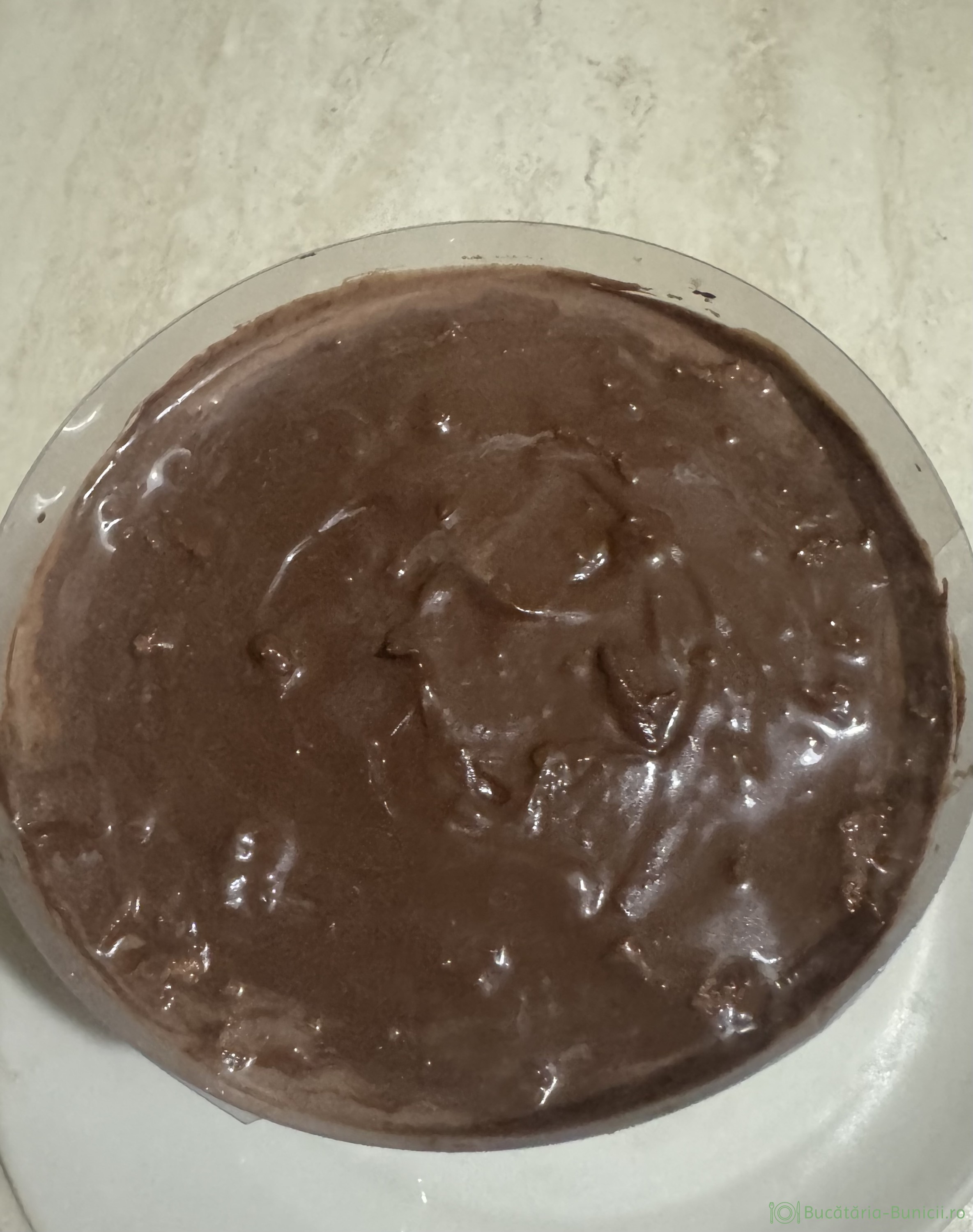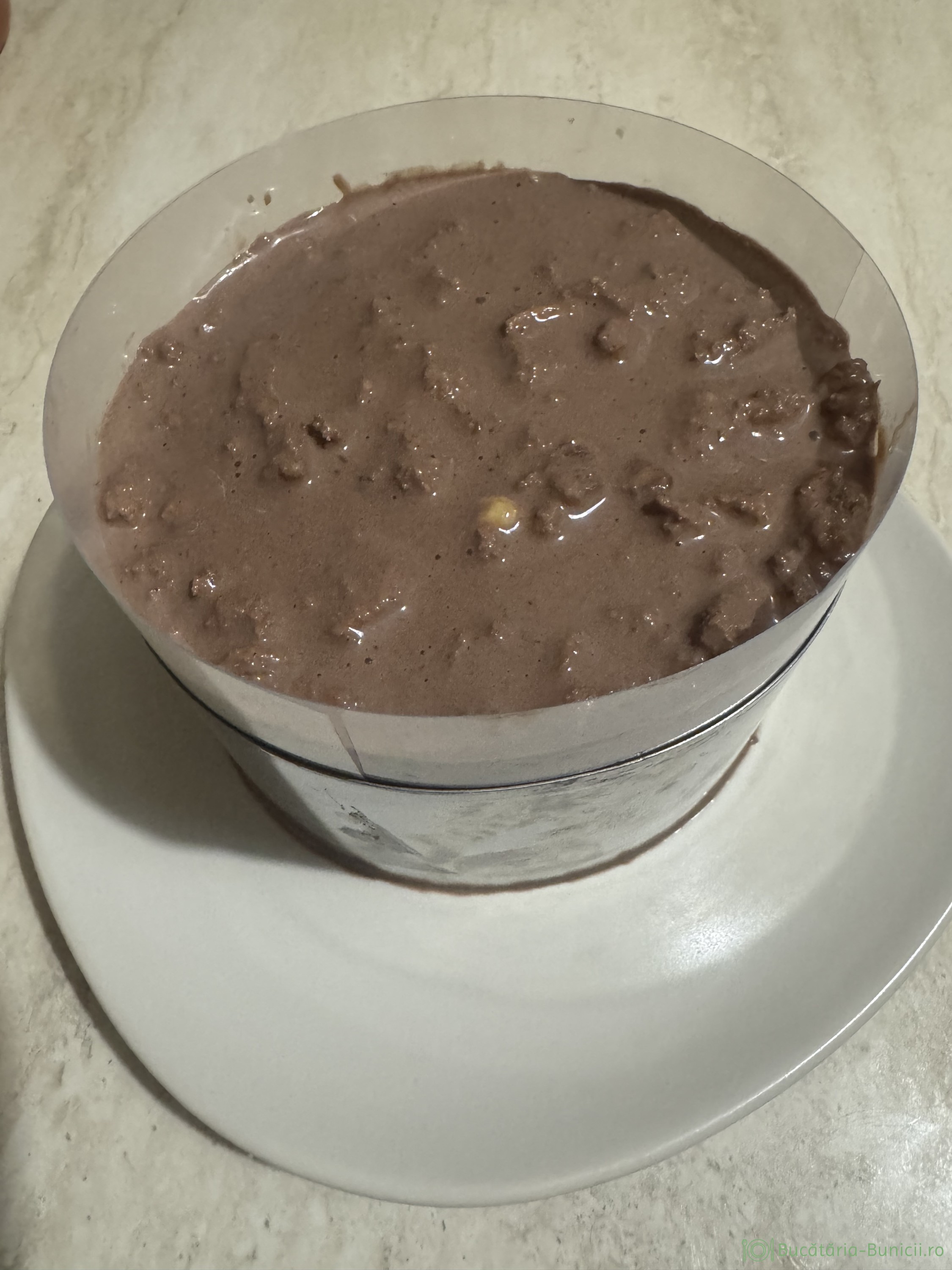 - Turnăm compoziția în formă, tasând cu lingura, să nu rămână goluri, dar repet, compoziția trebuie să fie bine legata, să nu curgă crema de lângă inel.
