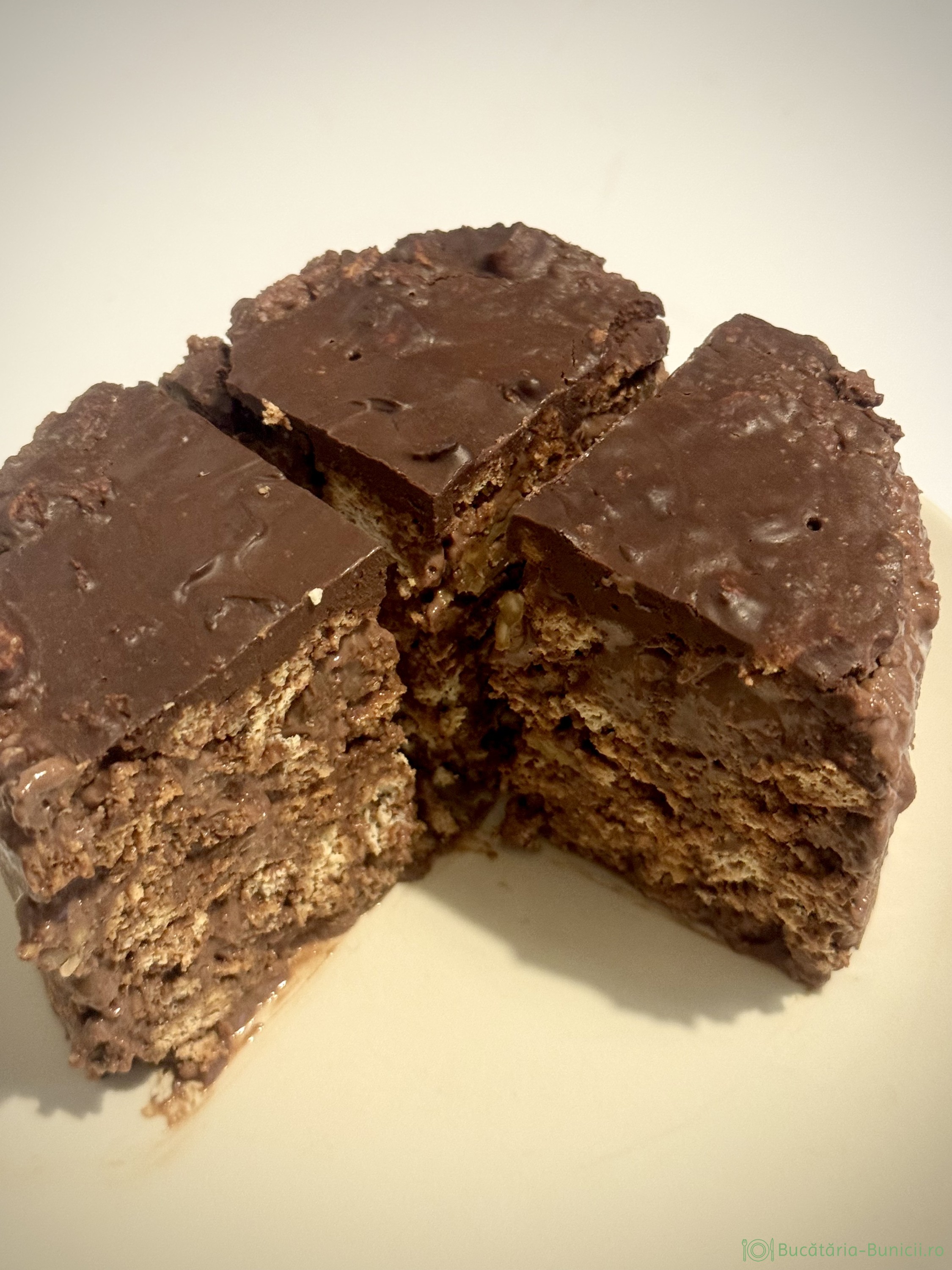 - Se da forma la frigider pentru încă 5-6 ore, apoi se îndepărtează inelul metalic și folia de acetat. Se face un test cu scobitoare, sau băț de frigăruie, care se infinge în tort, iar dacă intră ușor, înseamnă ca, biscuiții s-au înmuiat bine și se poate felia.