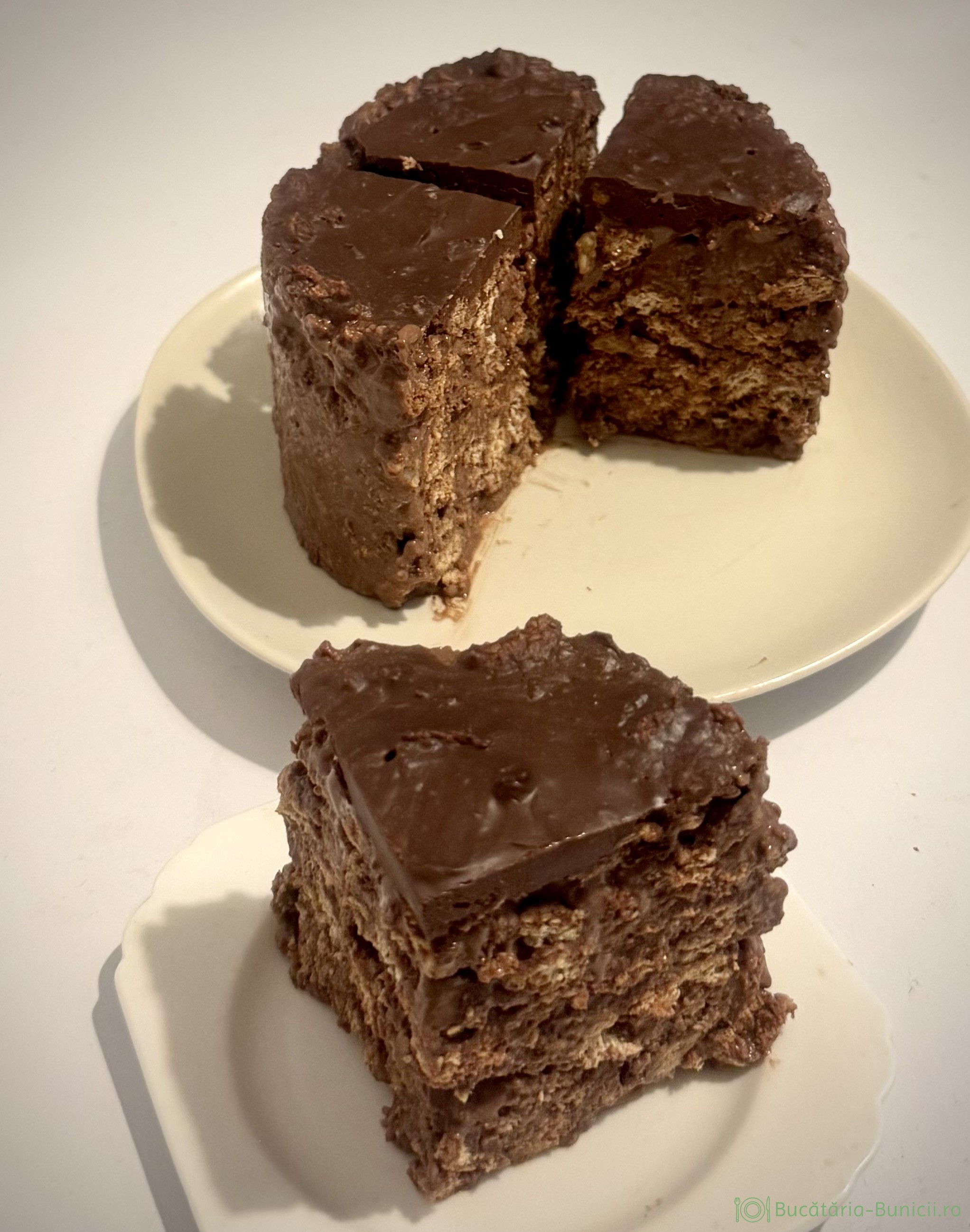- Se dă tortul la rece, dar nu în frigider, ci într-o cameră mai răcoroasă și se lasă cel puțin 12 ore. În acest timp, biscuiții se vor înmuia de la cremă.