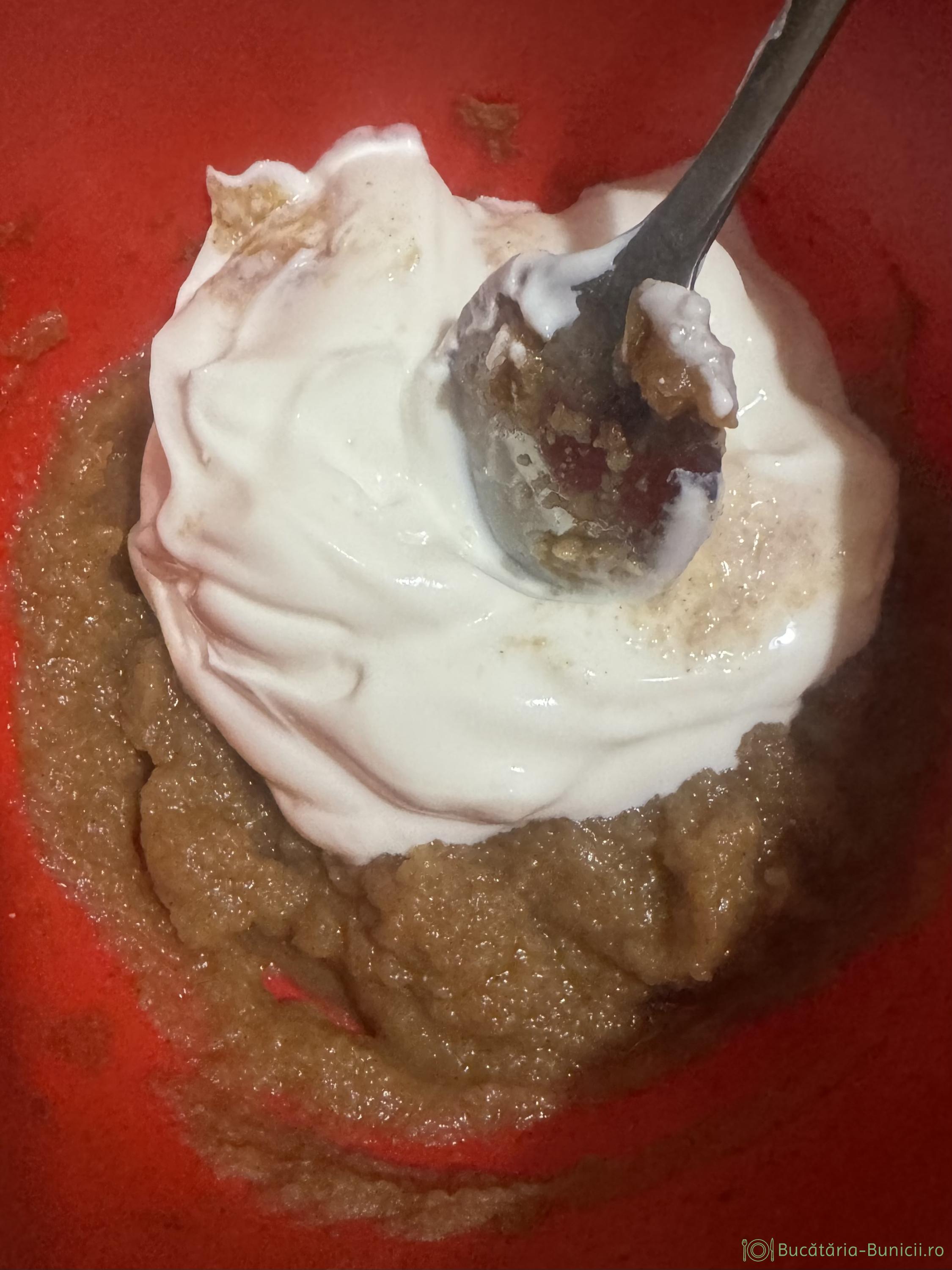 - Se amestecă bine iaurtul cu piureul de mere.