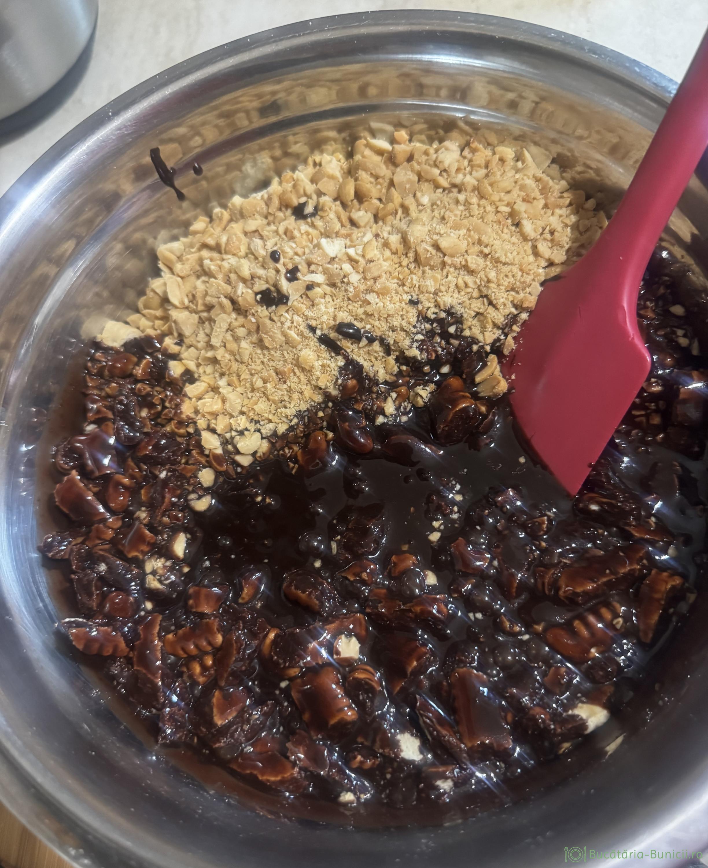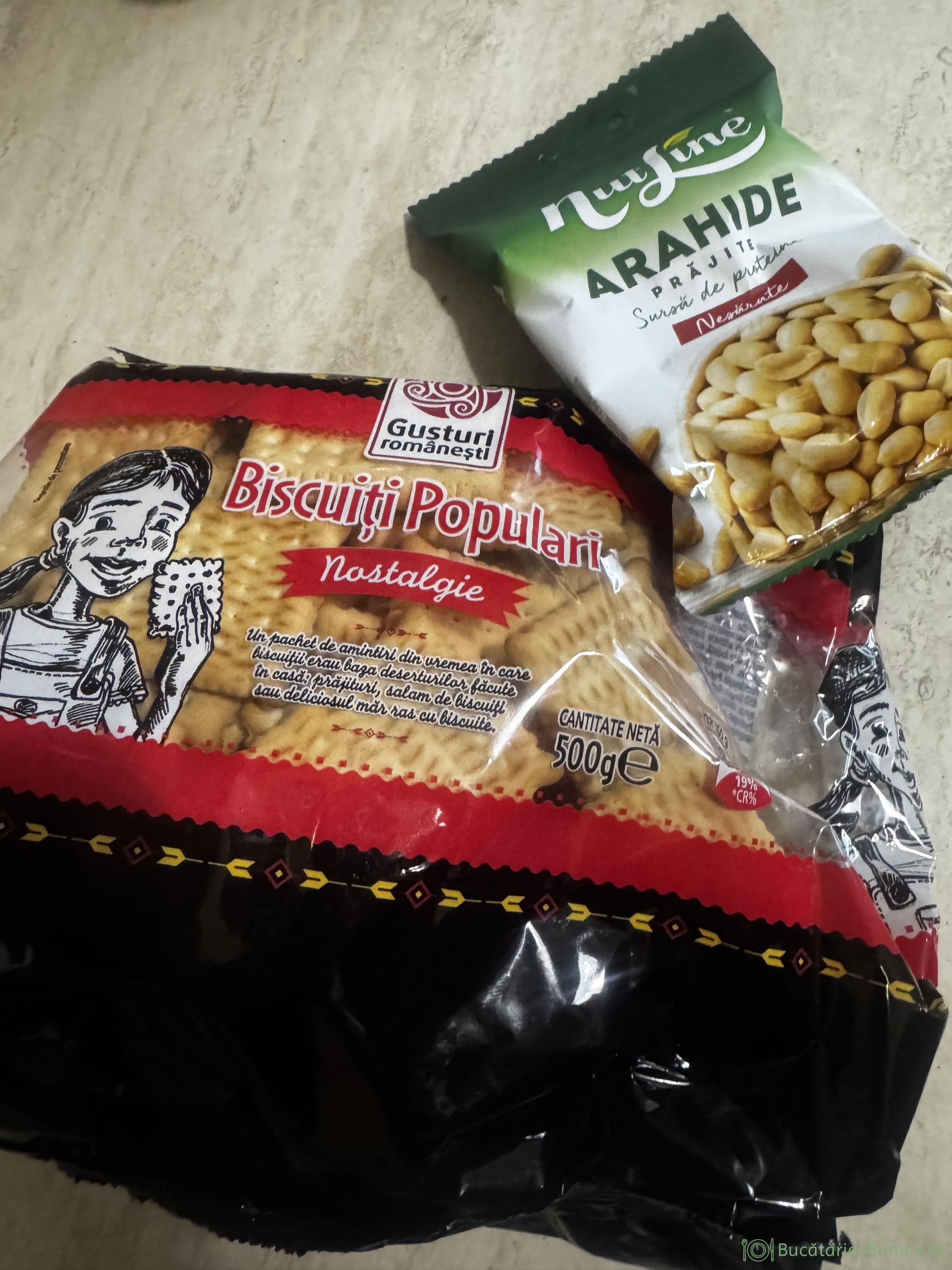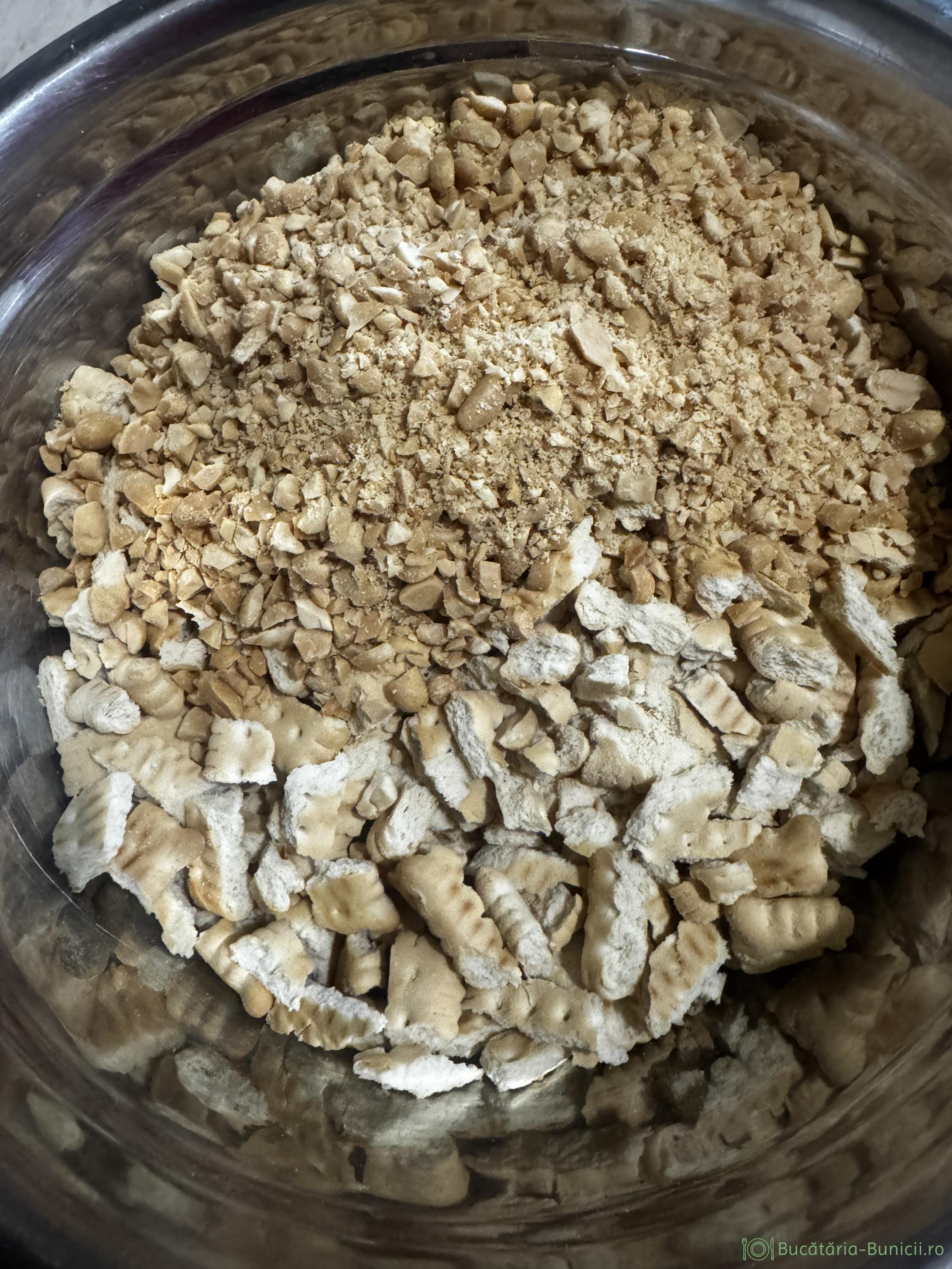 - Atât biscuiții rupți, cat și arahidele tocate se pun într-un bol încăpător.