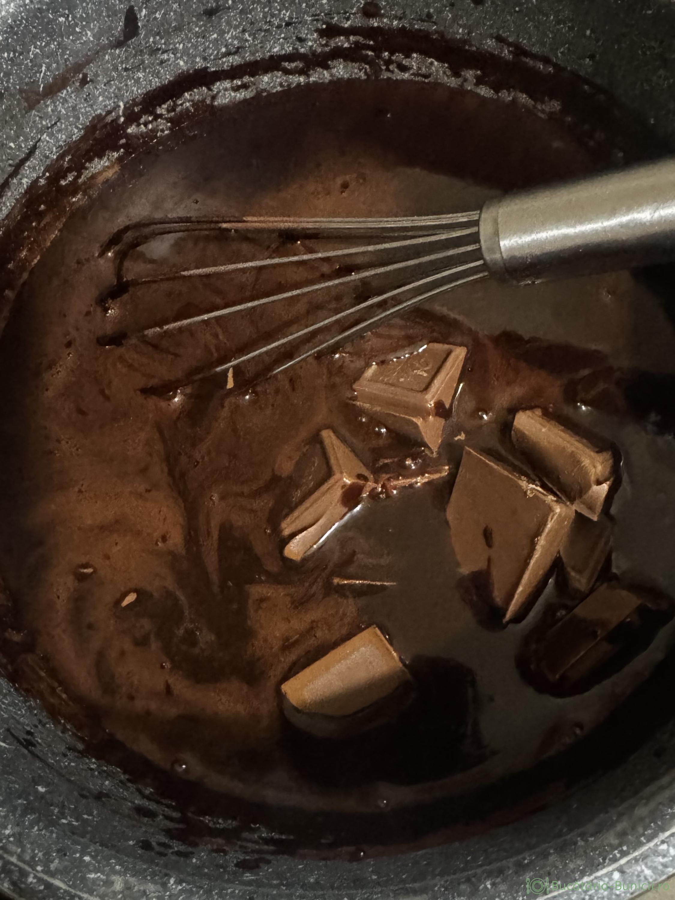 - Într-un vas antiaderent se pune laptele, zahărul și cacaua. Se fierbe la foc mic, amestecând mereu. Când laptele se încălzește, se pune ciocolata ruptă bucăți și vanilia. Se fierbe la foc mic, până se topește ciocolata și sosul se îngroașă.