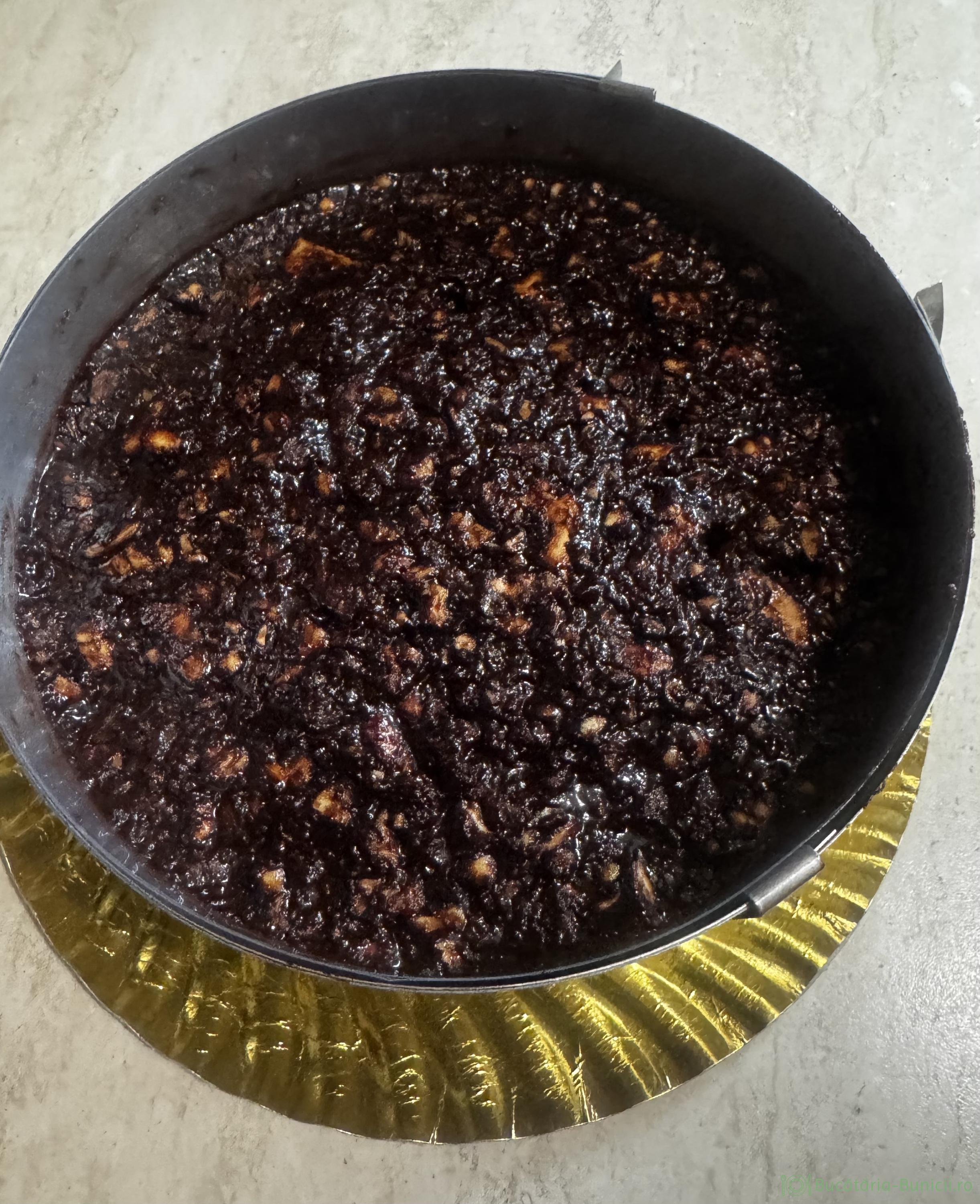 - Amestecul de biscuiți se pune în inel, în trei tranșe, iar după fiecare tranșă, se apasă cu dosul lingurii, pentru a tasa compoziția și să nu ramana goluri.