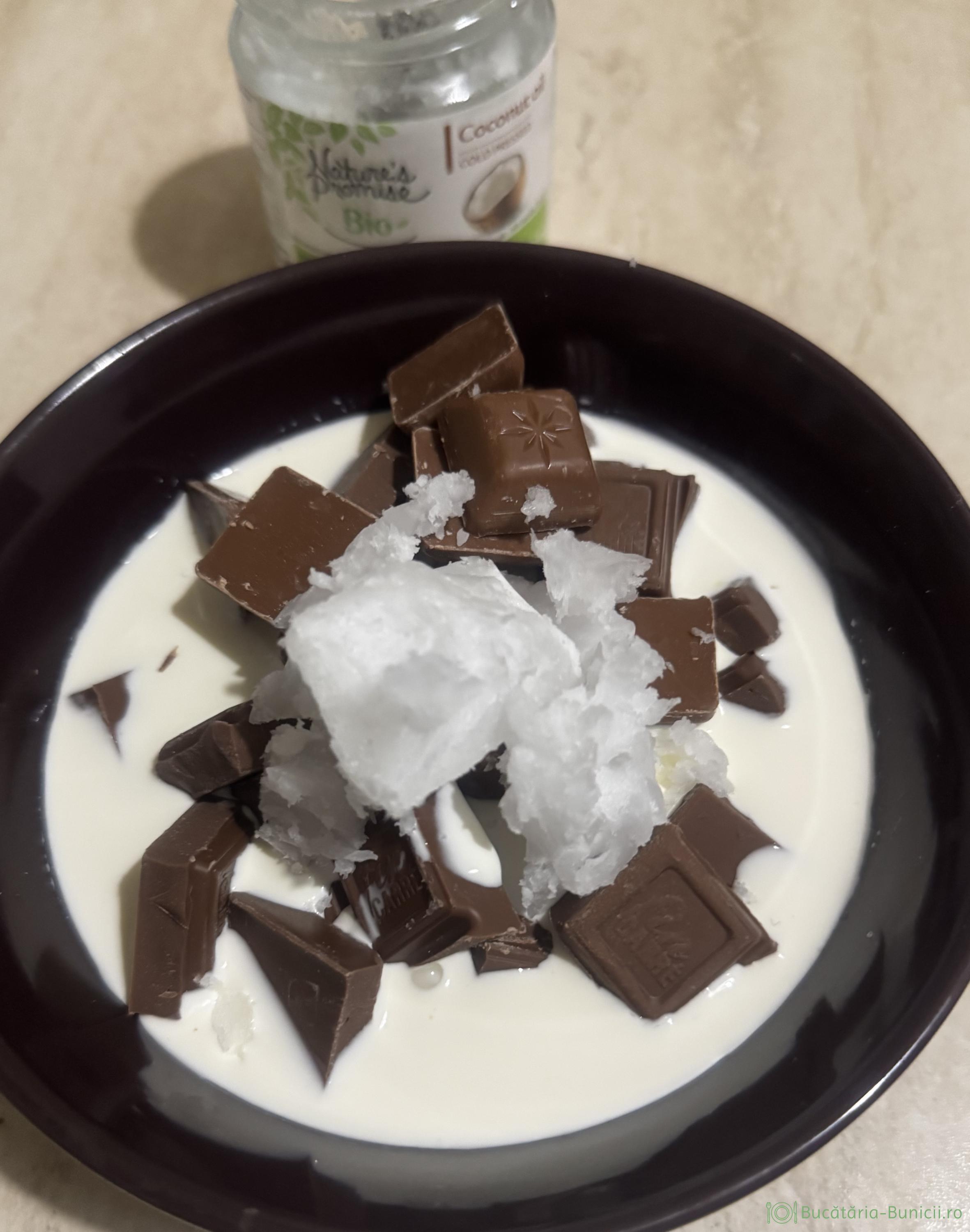 - Toate ingredientele se pun în bol și se dă în cuptorul cu microunde în reprize de 15-20 secunde, până se înfierbântă smântâna și se topește ciocolata, sau varianta mai sigură, se așază bolul pe baia de abur.