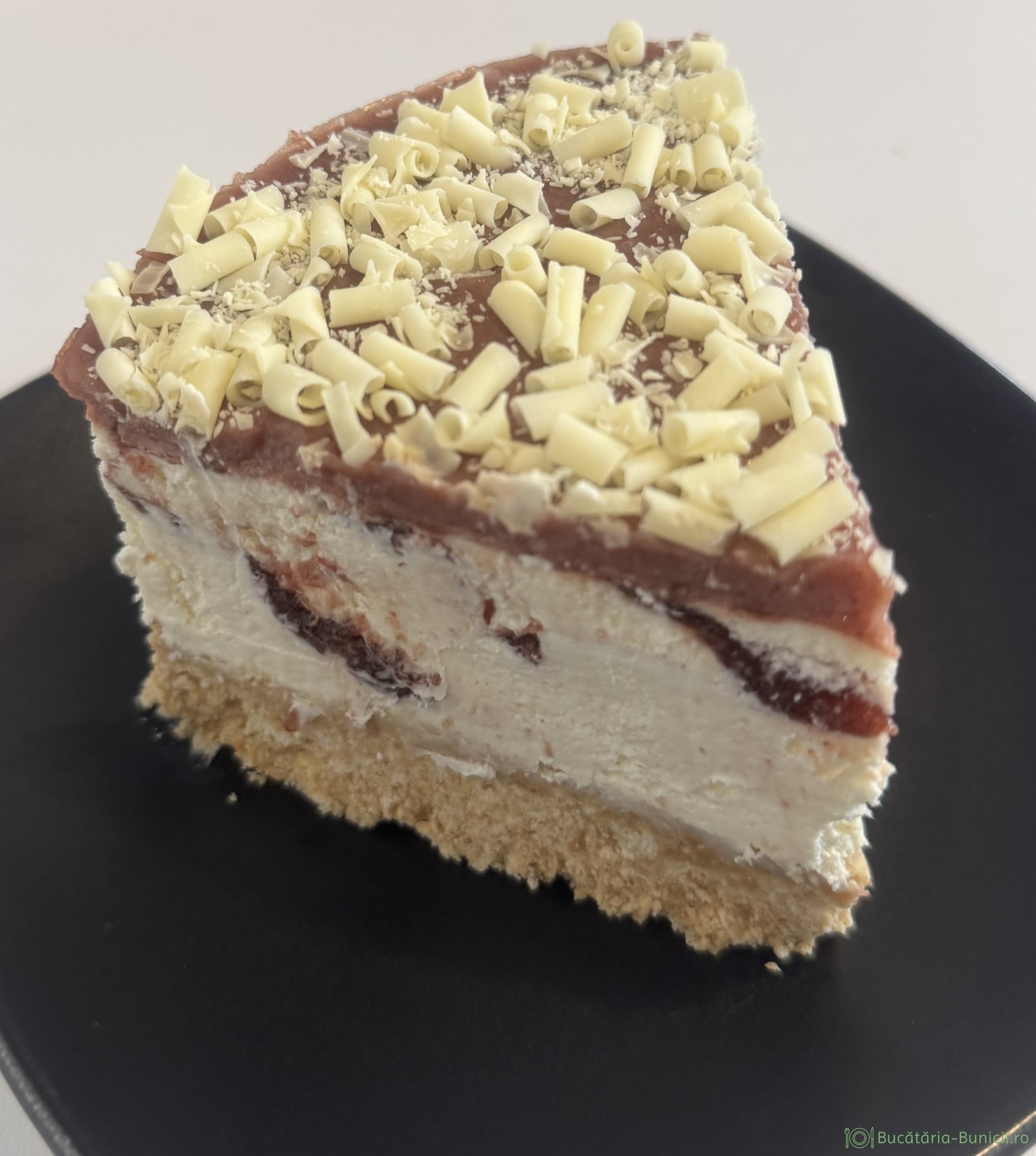 - A doua zi se îndepărtează inelul și folia de acetat, iar cu cuțitul, sau racleta de patiserie se finiseaza marginea tortului, apoi se poate felia.