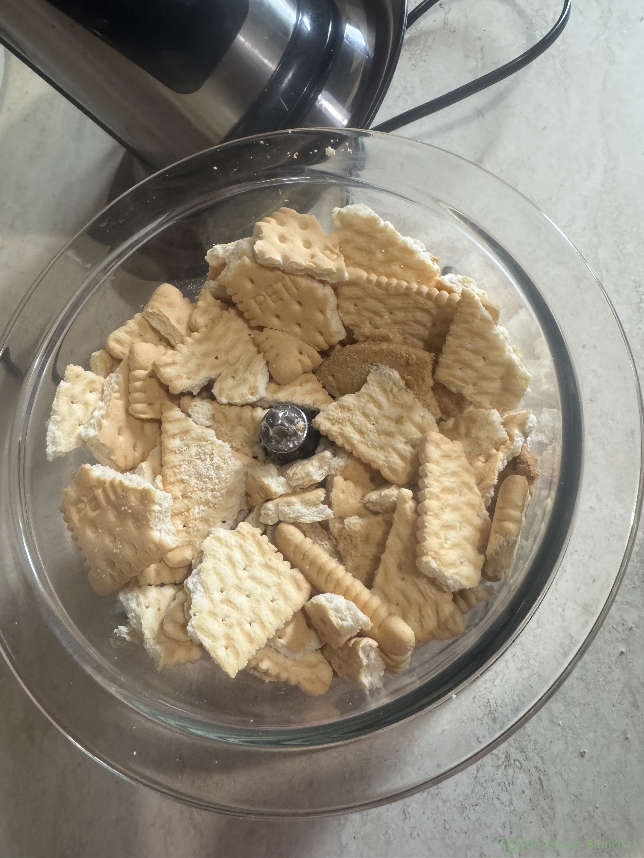 - Pentru blat am folosit jumătate biscuiți digestivi, jumătate biscuiți petit beurre. Se mărunțesc folosind un chopper, iar în lipsa, punem biscuitii într-o pungă groasă și se trece cu sucitorul peste punga, până se fărâmă toți biscuiții.