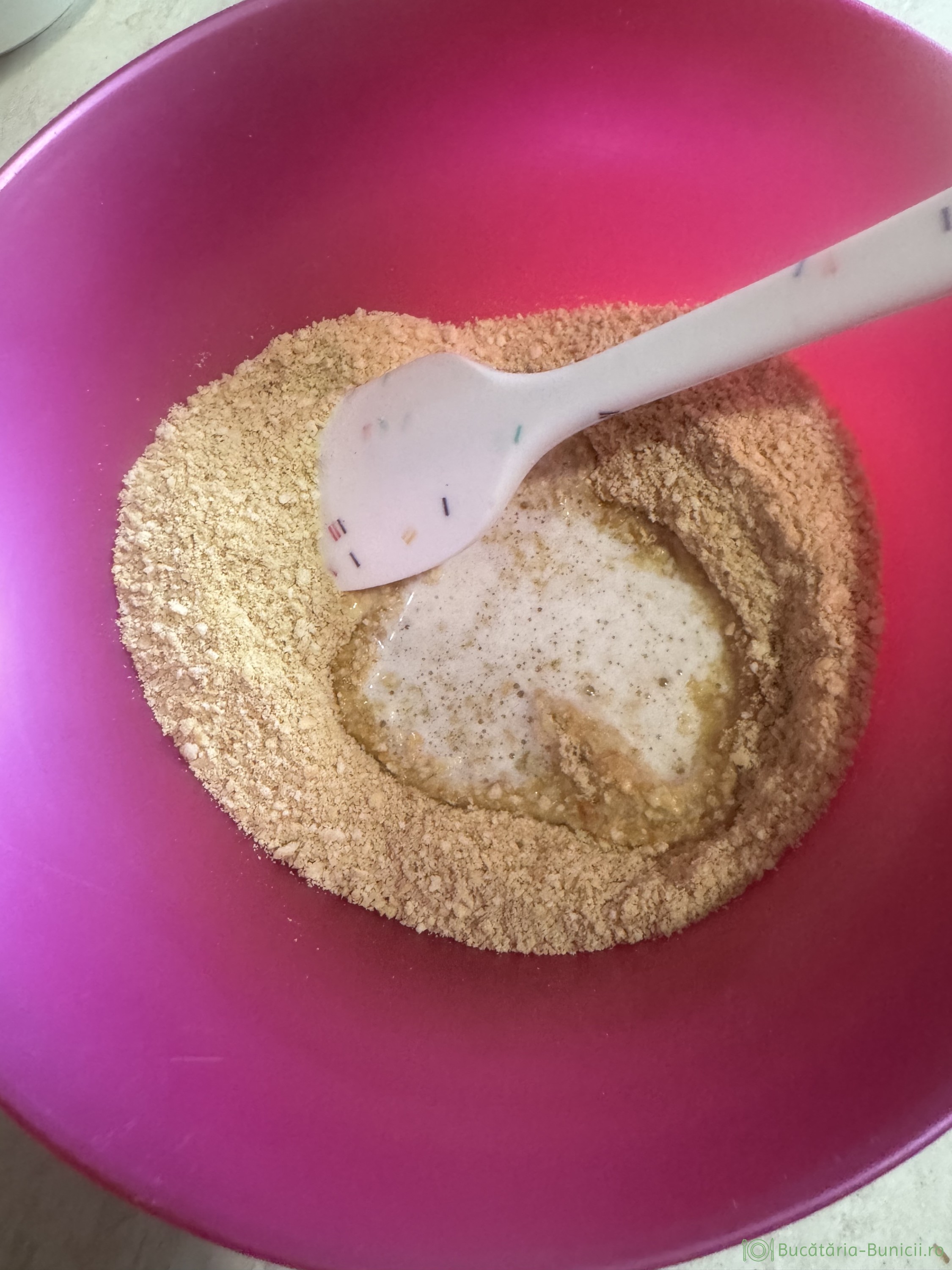 - După ce sunt mărunțiți, biscuiții se pun într-un vas, se toarnă untul topit peste ei și se amestecă, obținând o compoziție nisipoasă.