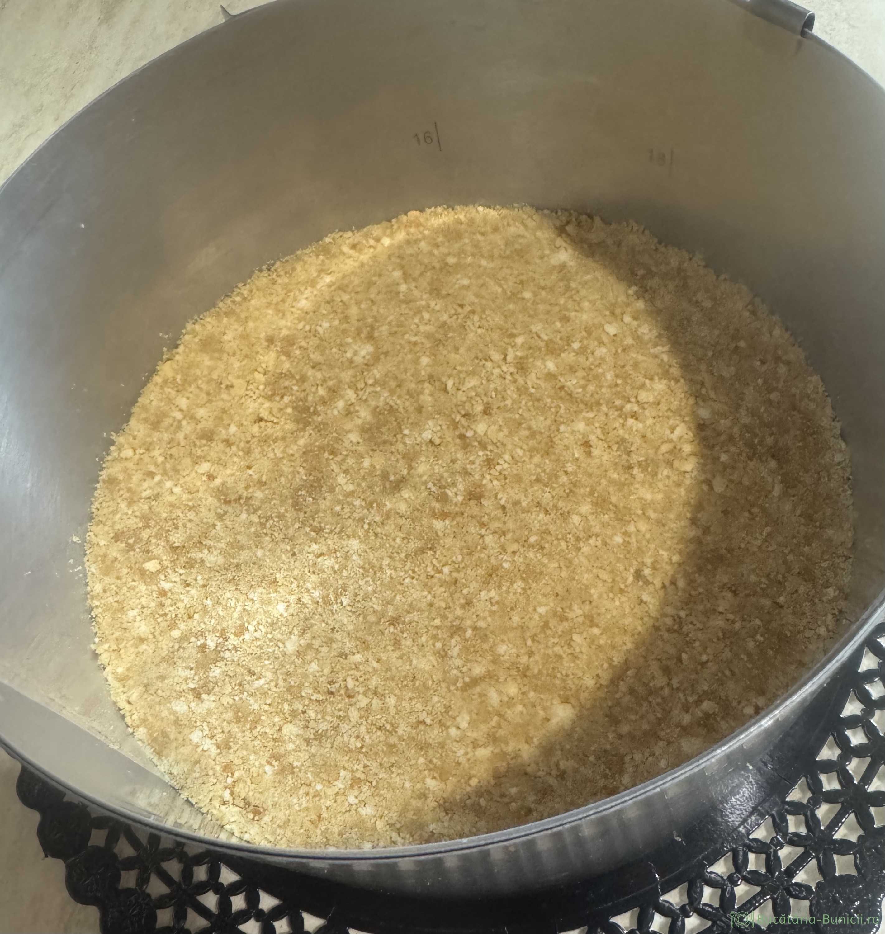 - Compoziția nisipoasa de biscuiți se pune în interiorul inelului și se tasează cu dosul unei linguri, sau cu fundul unui pahar.
