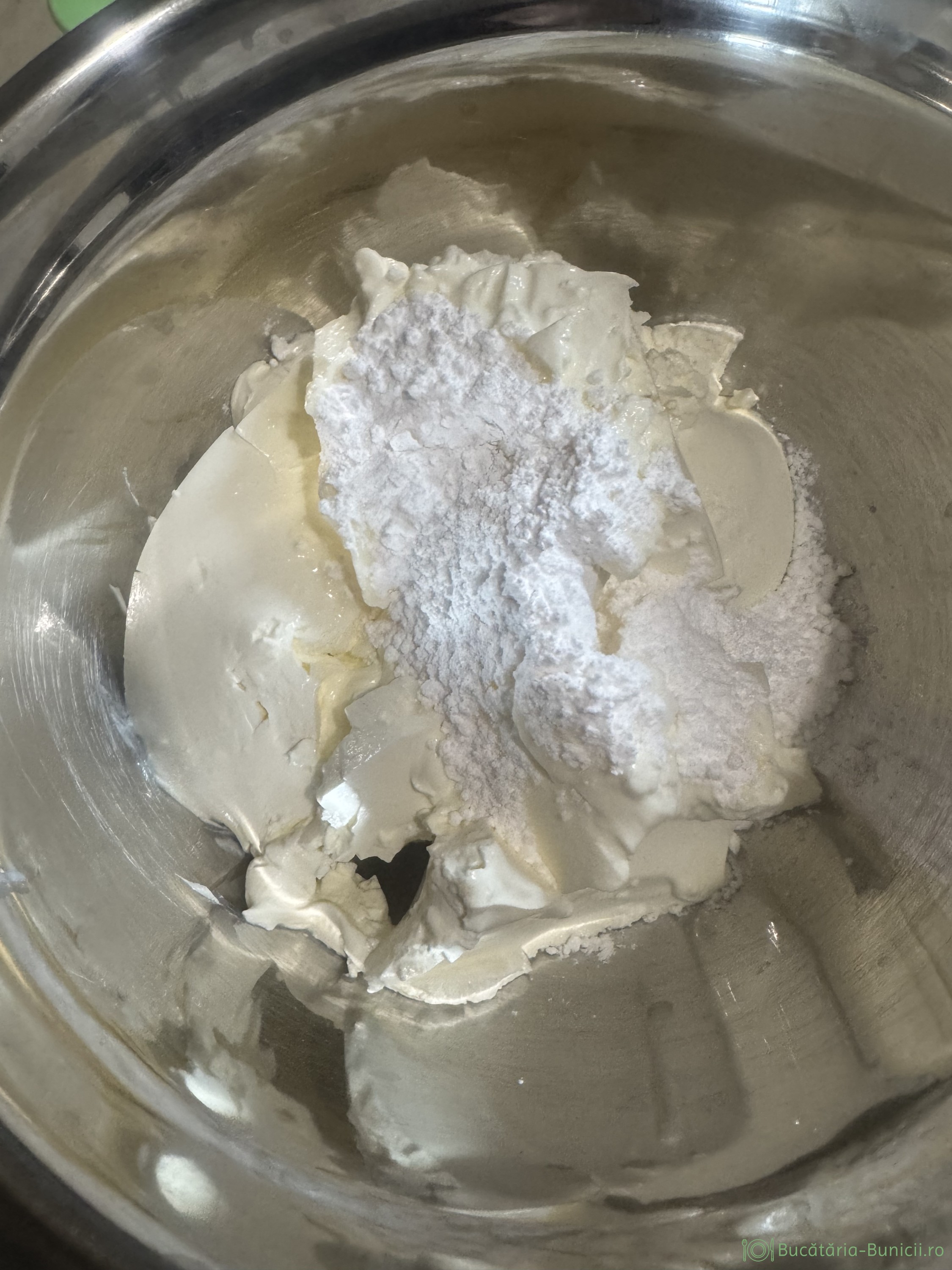 - În bolul mixerului se pun mascarpone rece, smântână la fel rece și zahărul pudră. Se mixează, până devine ferma. Folosind smântână pasteurizată și foarte grasă, crema se va forma foarte repede, mixând doar 2-3 minute. Prefer această smântână, în locul celei lichide, pentru gustul mult mai bun și mai plin de smântână.