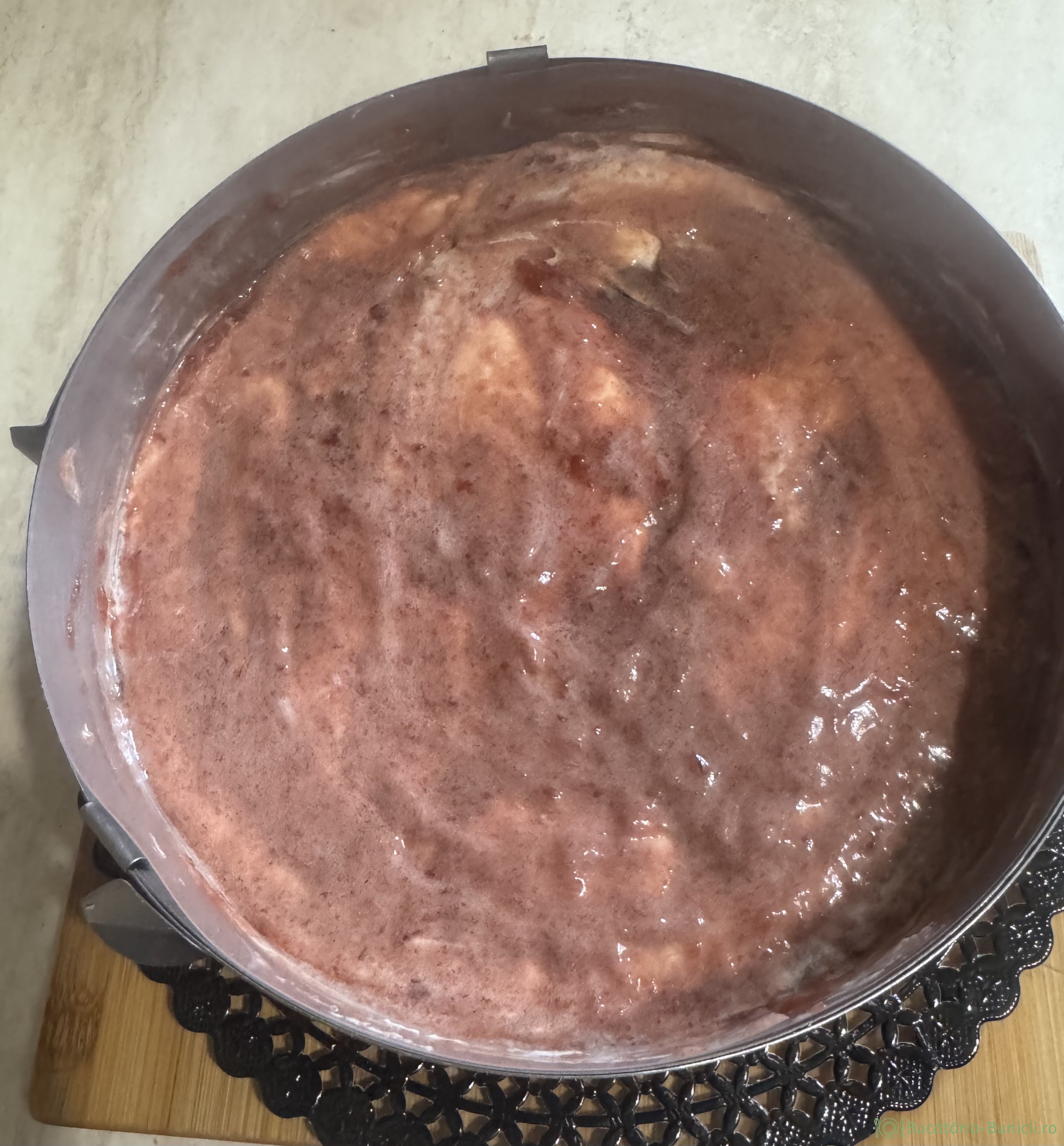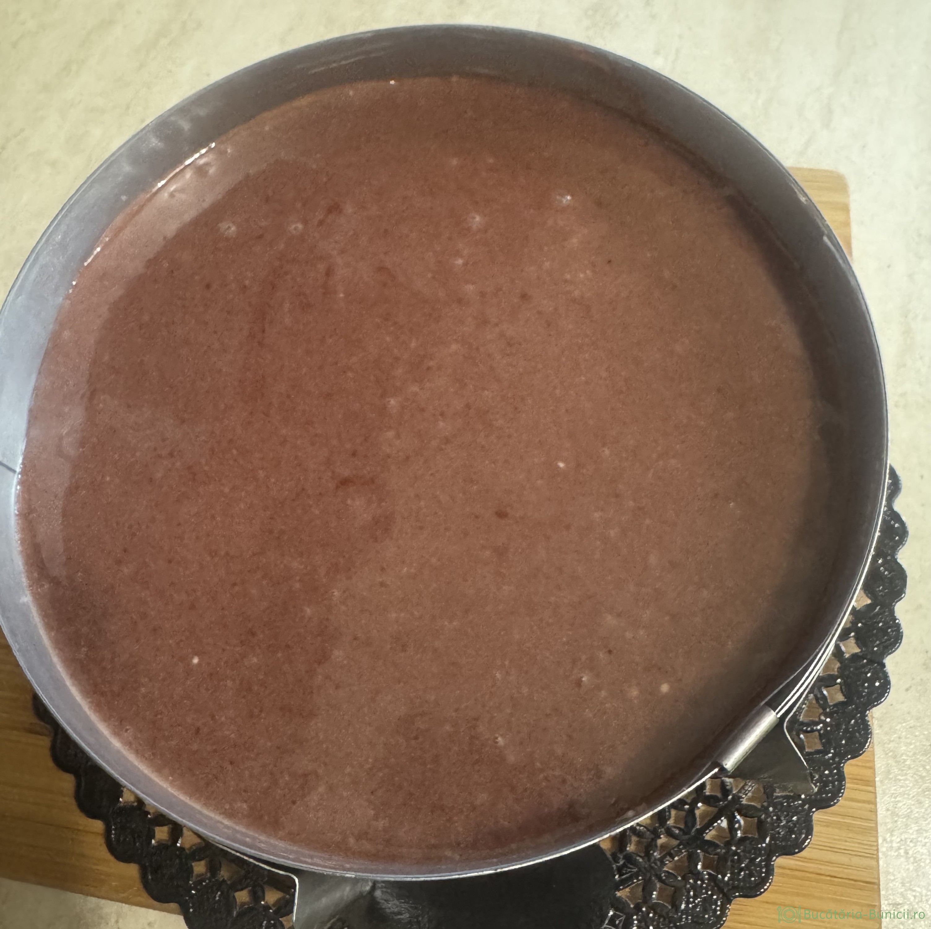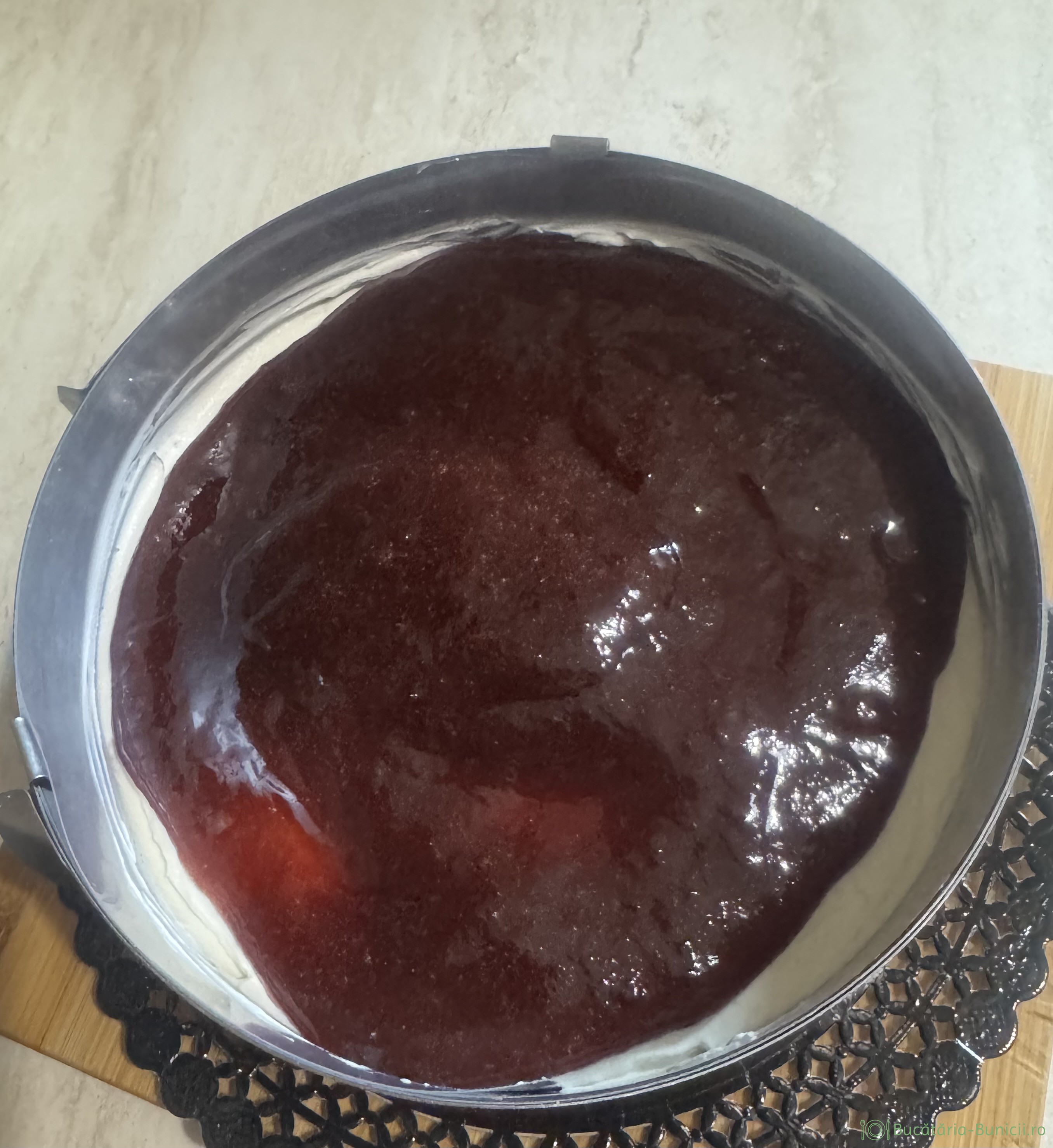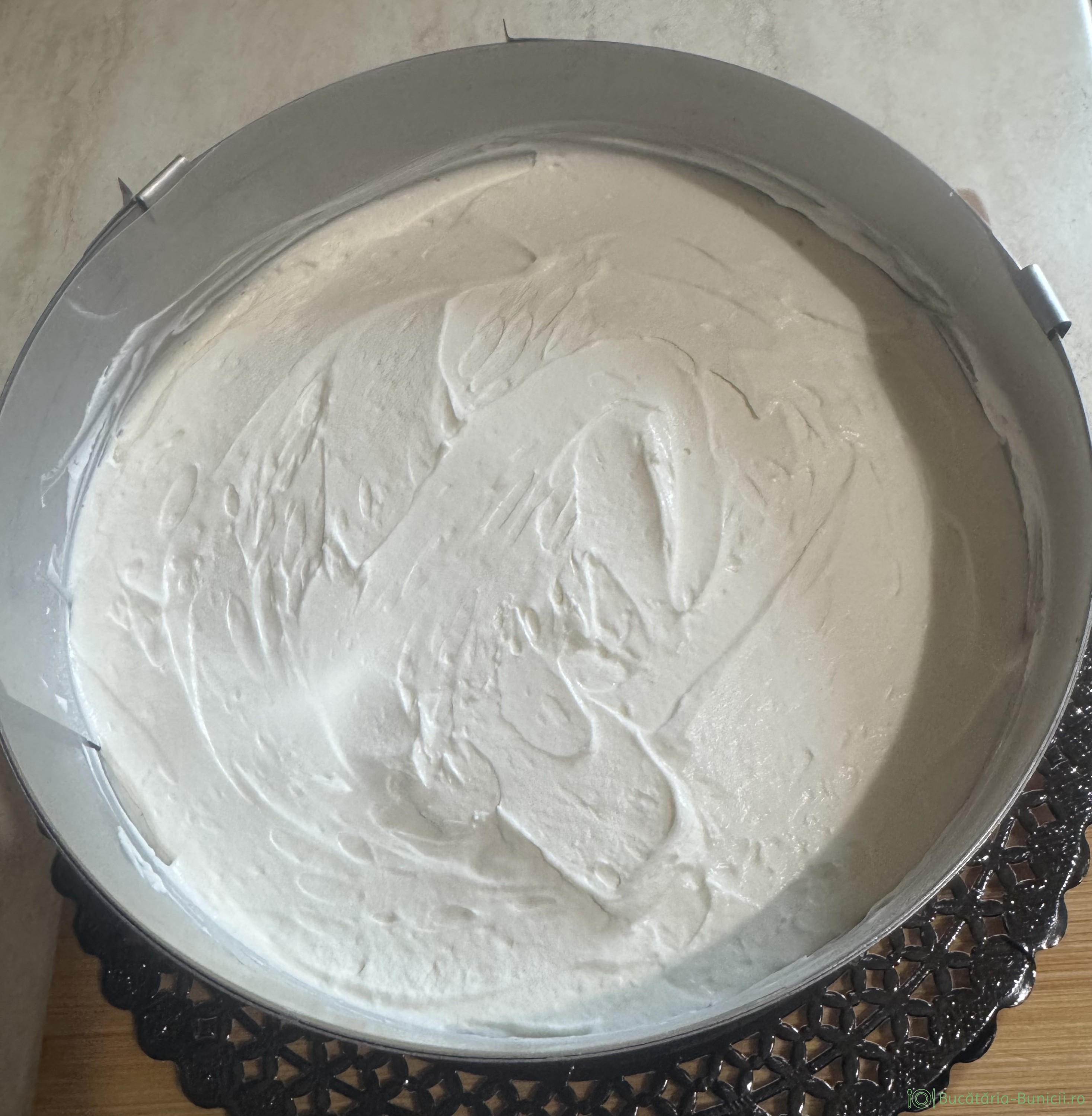 - Se scoate forma cu blat de la frigider și se toarnă cremă deasupra. Se nivelează, apoi se toarnă cam 2/3 din jeleul de fructe. Cu coada unei linguri se amestecă, folosind mișcări largi, astfel încât, jeleul se încorporează în cremă formând un model marmorat. Se nivelează și se dă la frigider, să se întărească puțin cremă.