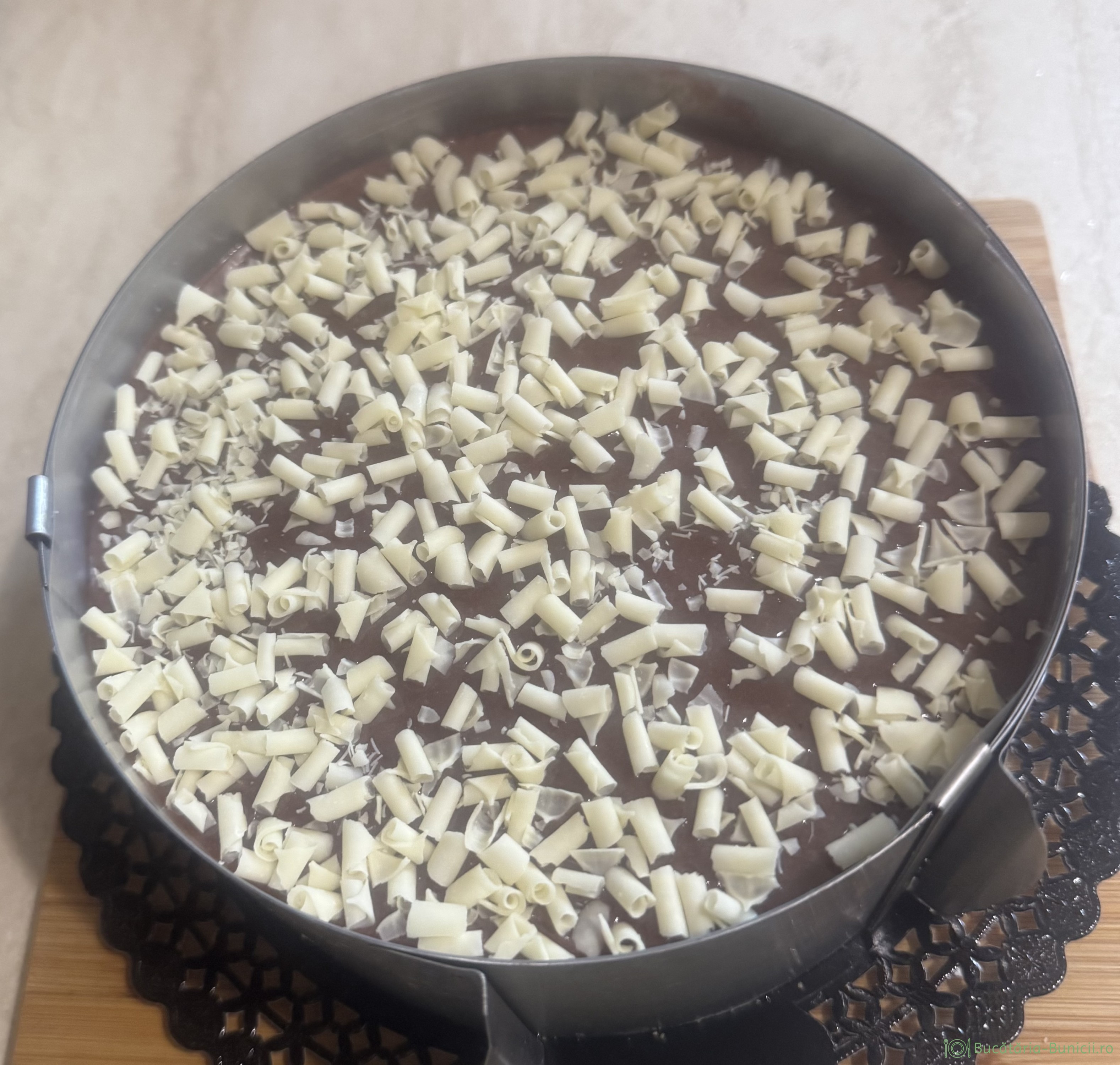- Se toarnă peste crema, iar deasupra se presară bucle de ciocolată.