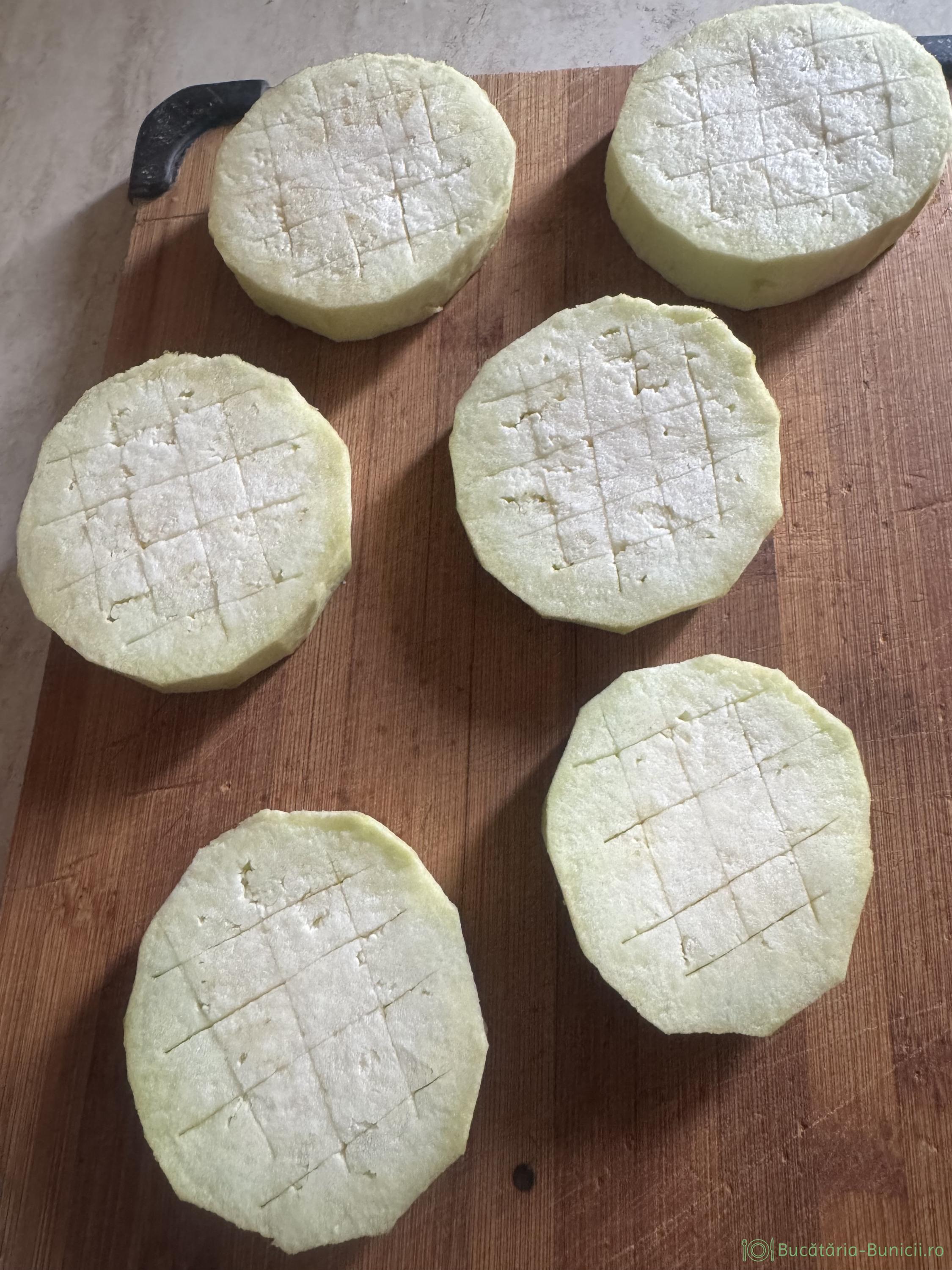 - Vânăta se curăță de coajă și se taie felii groase cu 1,5-2 cm.